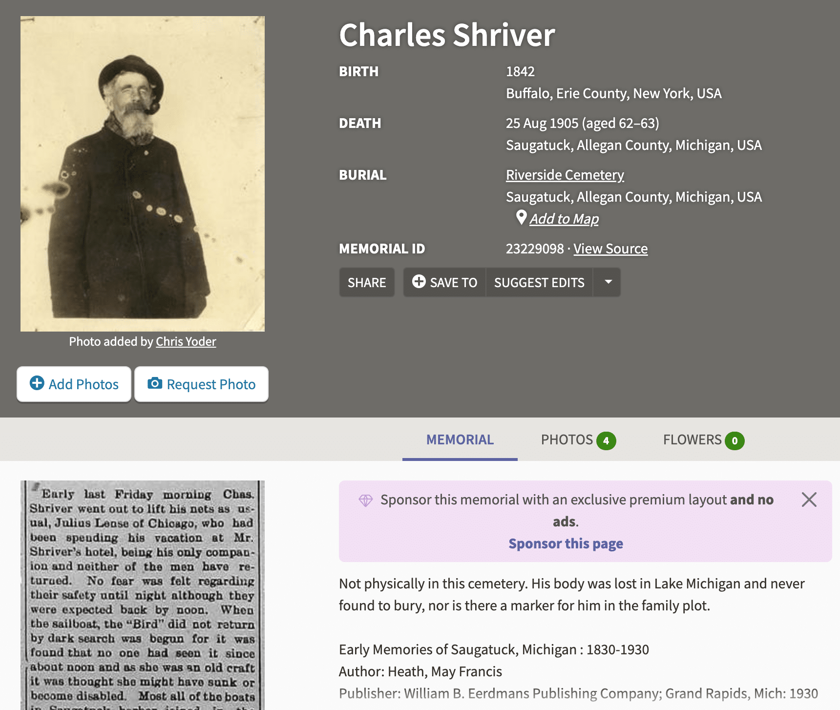 Chris Clark and Judy Thomas will demonstrate three of the most popular free online resources for genealogists plus another that is accessible for free through the Library of Michigan. FamilySearch is a huge database with 16 billion indexed images, including all publicly available US Censuses. FindAGrave has the largest collection of gravesite data, with 250 million records. WikiTree lets you collaborate on a worldwide family tree that includes 40 million profiles. And at Newspapers.com you can search through 230 million pages from 23 thousand newspapers.