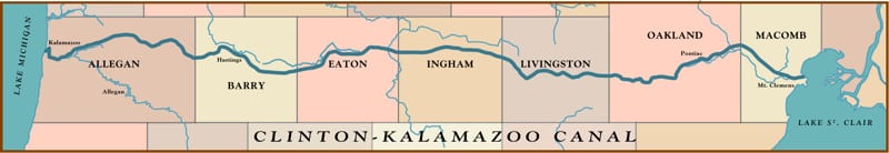Interest in improvements to the harbor were in large part due to the proposed Clinton – Kalamazoo Canal. In the 1838 report of Jarvis Hurd on the canal to the Commissioners of the Board of Internal Improvement of the State of Michigan, found in ‘Documents Accompanying the Journal of the Senate of the State of Michigan,’ John A. Kerr & Company, Printers to the State, 1838, Hurd writes: “The Kalamazoo river, near its mouth, is a natural, and safe and commodious harbor suificiently deep to float the largest vessels that sail on the western lakes when once within the bar. A severe storm at the time of terminating the survey at the mouth of the river rendered the examination of the bar impracticable.” Via the State Archives, on July 20, 1838 the first shovel full of dirt was turned in an effort to link Lake St. Clair and Lake Michigan via the Clinton-Kalamazoo Canal. The canal was to start at the mouth of the Clinton River near Mt. Clemens and run west through Howell and Hastings and connect with the Kalamazoo River to Lake Michigan. Construction was halted in the early 1840s due to financial troubles after only 16 of the planned 216 miles had been completed.