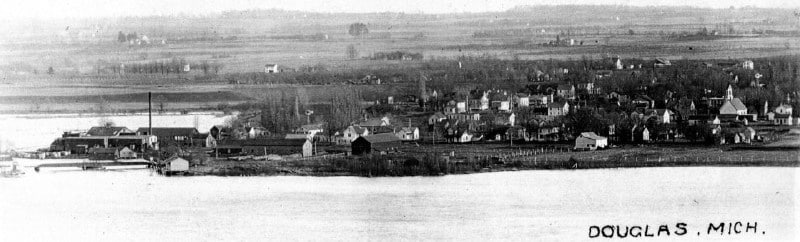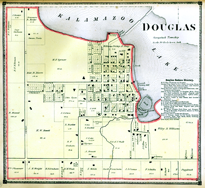 The first settlers upon the site of Douglas village, and indeed the first settlers in Saugatuck township on that side the lake, were R. A. McDonald and William Scovill, who, in 1847, settled upon land in section 16, located for them the year before by M. B. Spencer. That was, however, long before the village of Douglas was even thought of. Mr. Scovill is dead, but Mr. McDonald still lives on section 22. The first effort towards creating a village at that point was made by Jonathan Wade, in 1851. He bought lot 3 on section 16, built a house thereon, interested Wells and Johnson in the project, and set about building a saw-mill on the site now occupied by Ebmeyer & Neis’ mill. He then laid out a village on the south half of his lot, and called it Dudleyville, in honor of his brother, Dudley Wade, of Canada. Presently, William F. Dutcher bought the north half of Wade’s lot, including the mill, and on that tract laid out a village, which he named Douglas at the suggestion of F. H. May, who wished thus to commemorate the town of Douglas, the capital of the Isle of Man. Thus it appears there were two villages, known as Douglas and Dudleyville, separated only by the width of a single street. By these names they were known until the incorporation of the entire tract as Douglas, in which were included, besides the two village plats, Spencer’s and other additions.