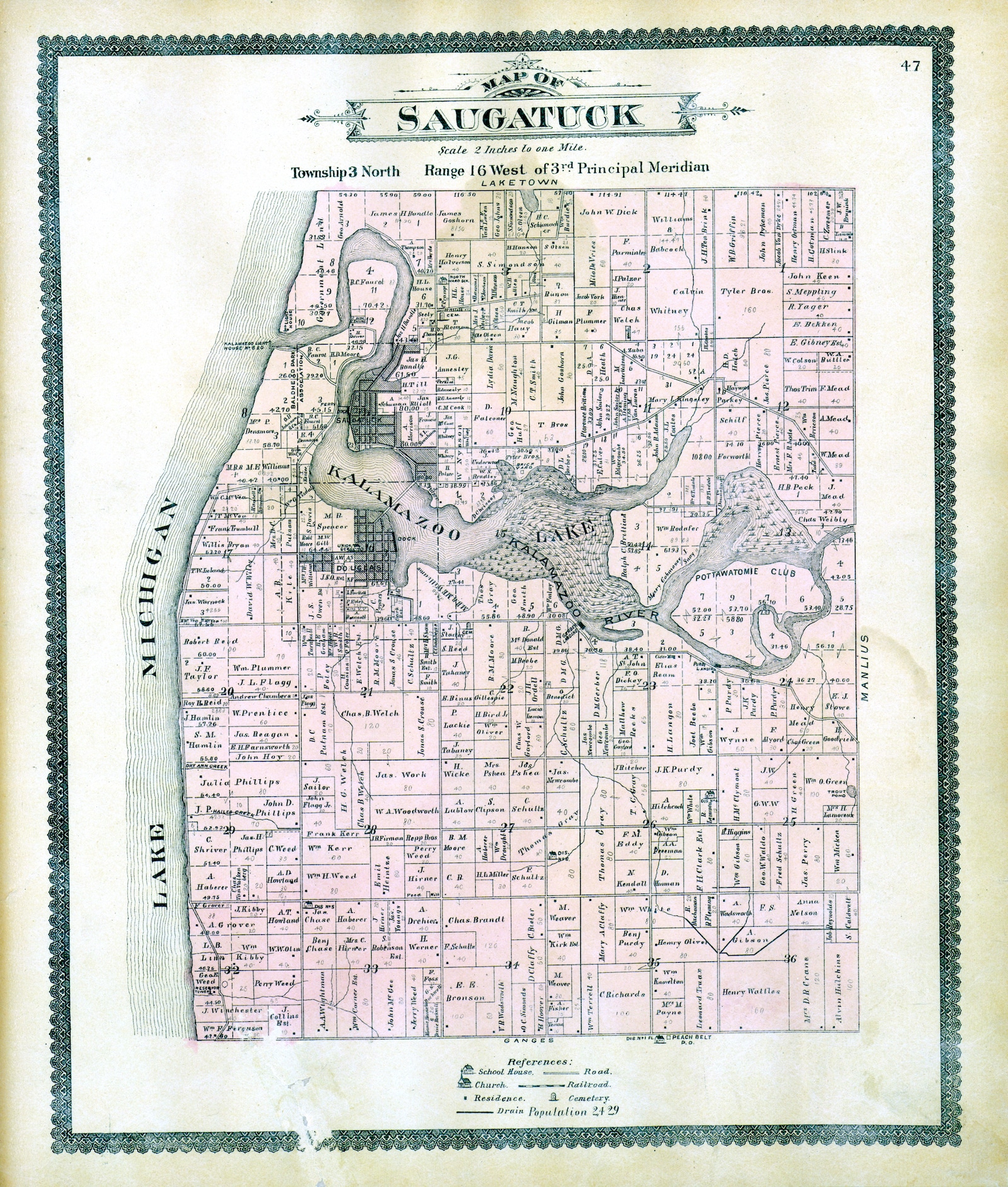 [Saugatuck township], which was the earliest one settled in Allegan County, was surveyed as township 3 north, range 16 west. It is bounded on the north by Laketown, south by Ganges, east by Manlius, and west by the waters of Lake Michigan.