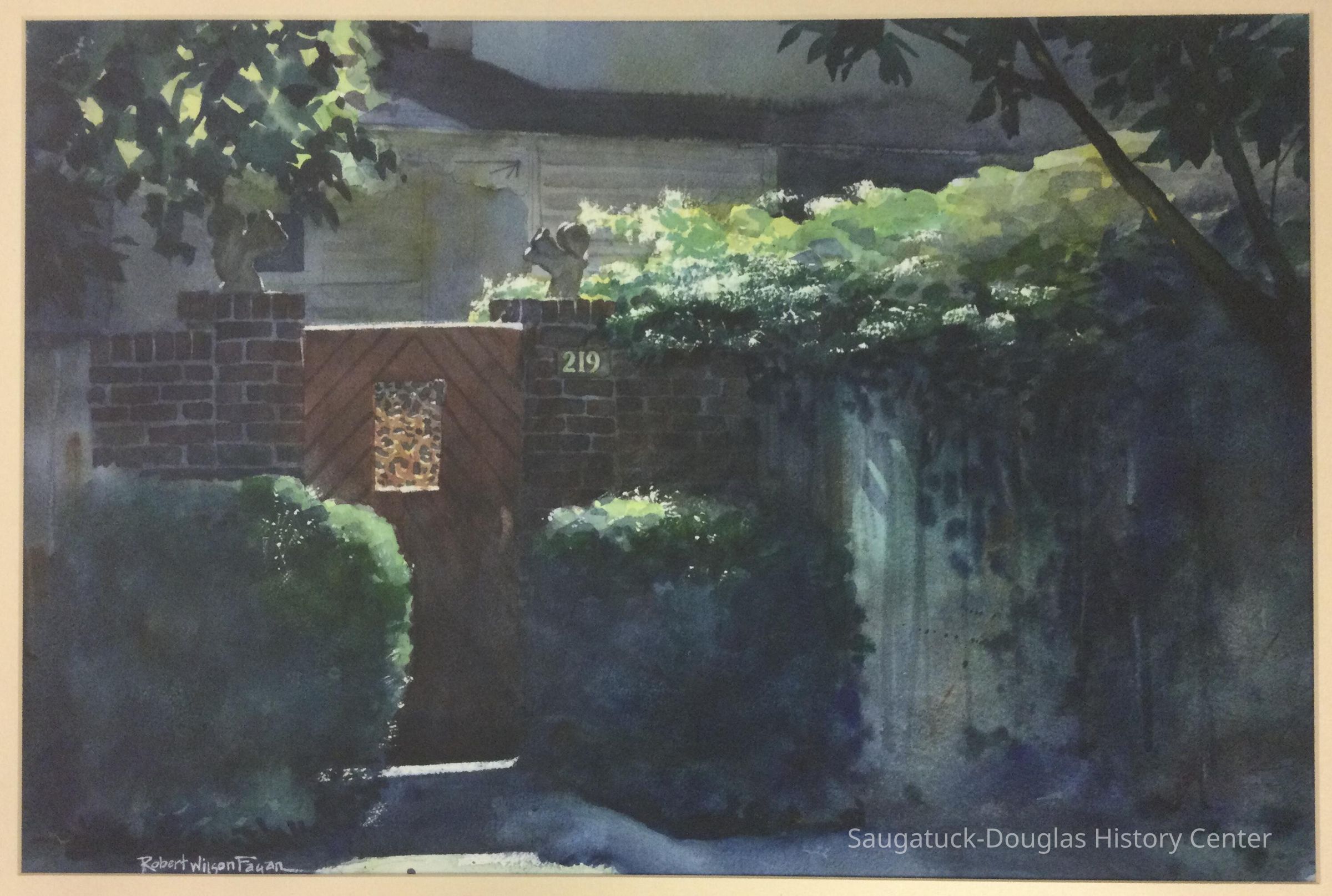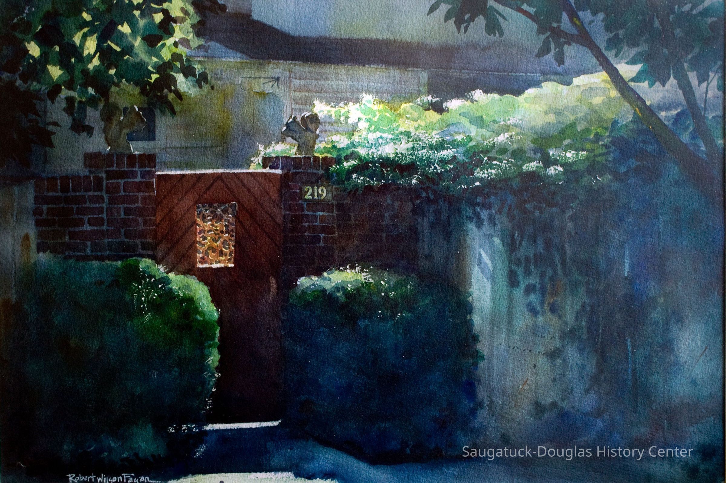 This appears to be an evening scene. The subject is the gate to the side garden of the house at number 219 at the corner of Butler and Francis streets in Saugatuck. The artist cleverly places the source of light lower than, and behind, the wood gate.