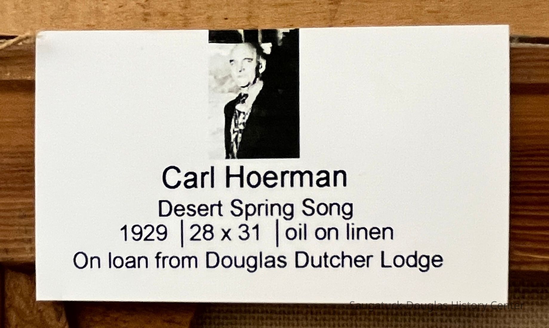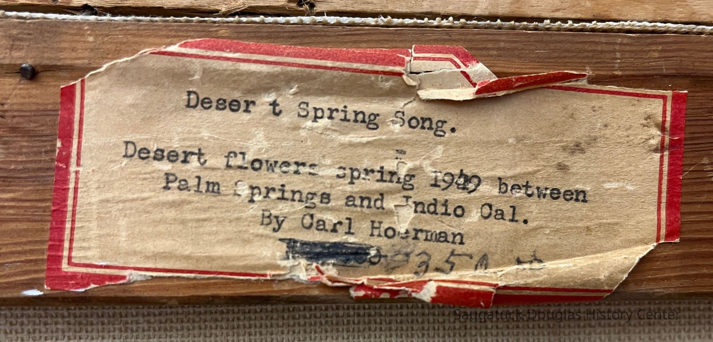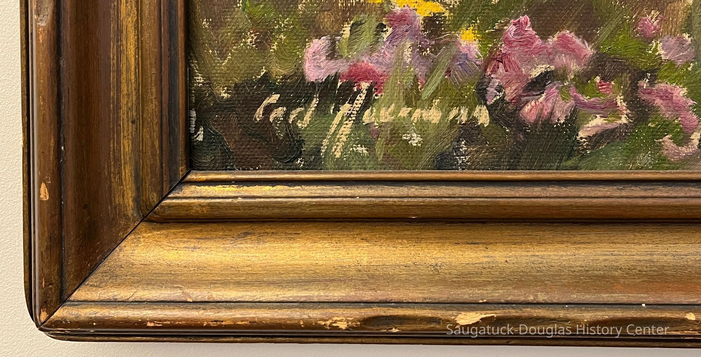 Landscape with wildflowers on a mesa and gray-blue mountains in the distance. Framed with 2.5 inch brown frame with two brass plaques.