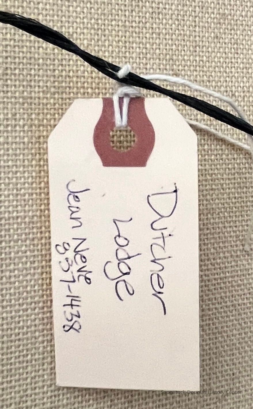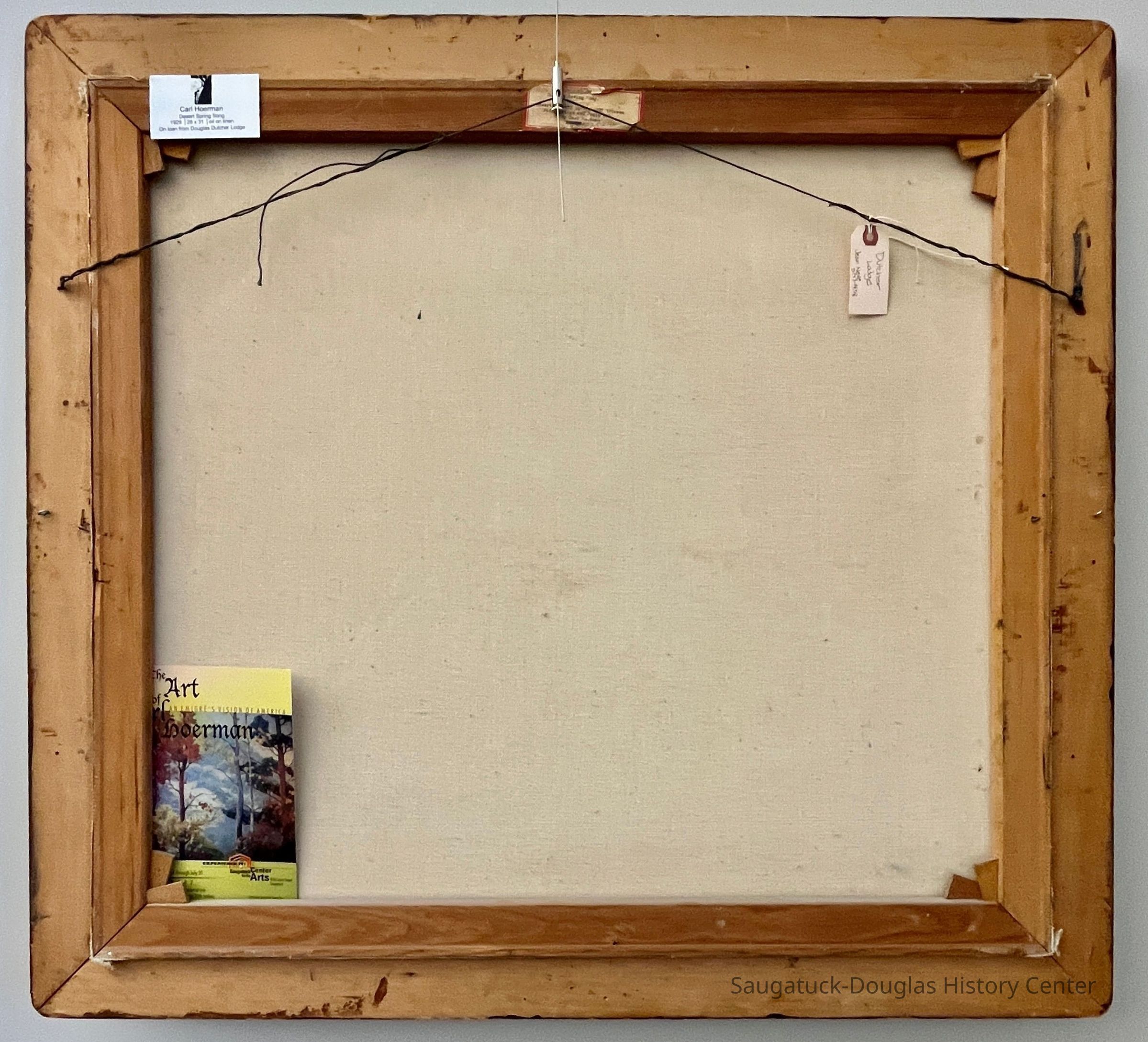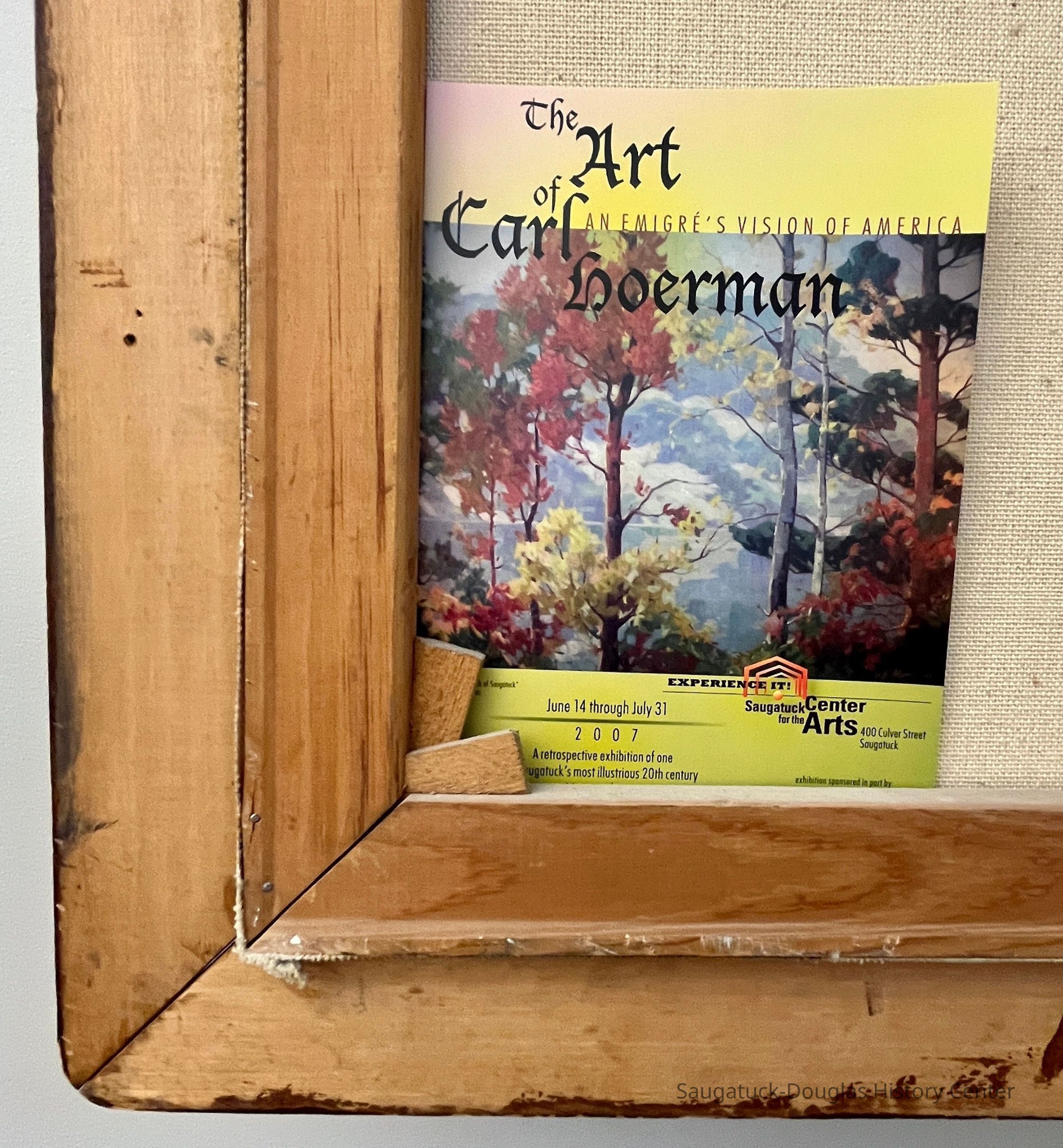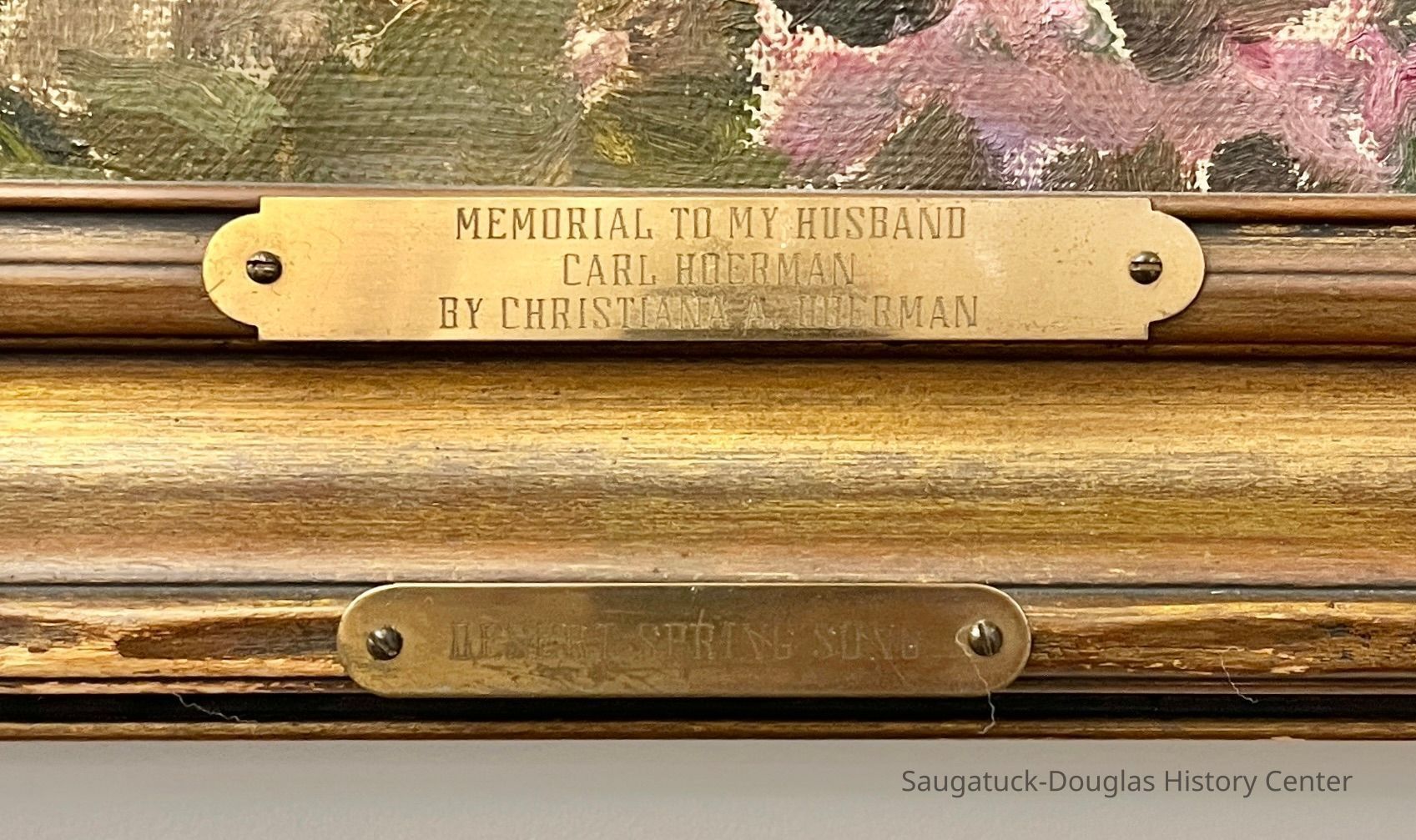 Landscape with wildflowers on a mesa and gray-blue mountains in the distance. Framed with 2.5 inch brown frame with two brass plaques.