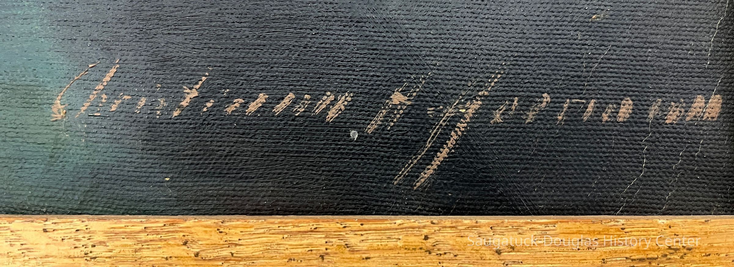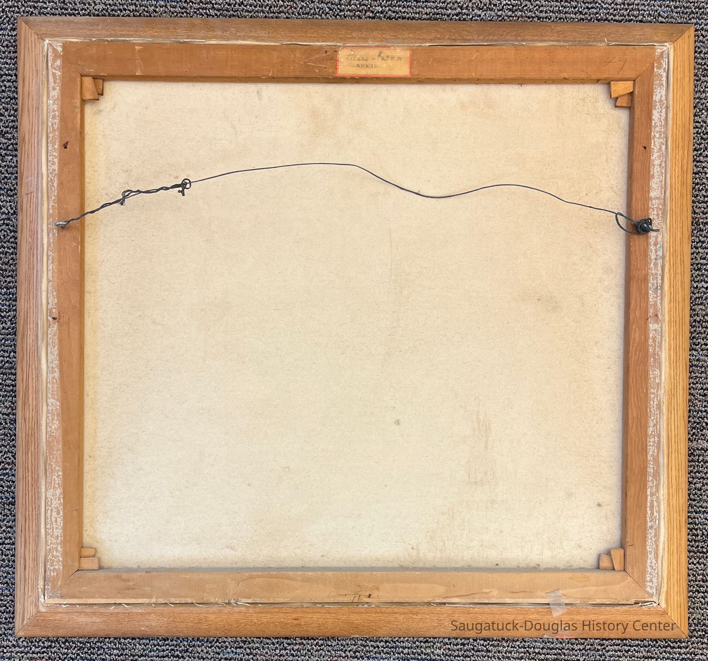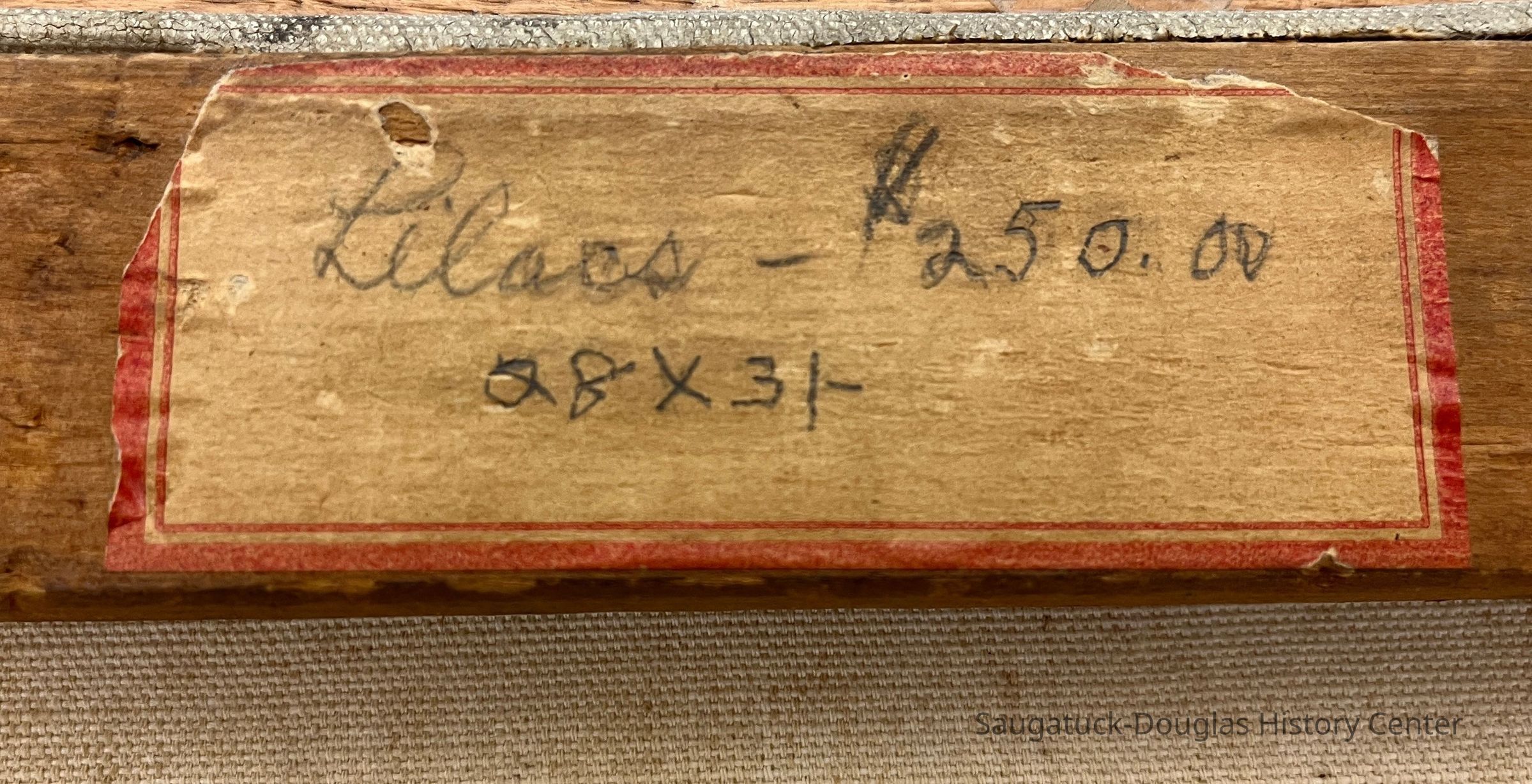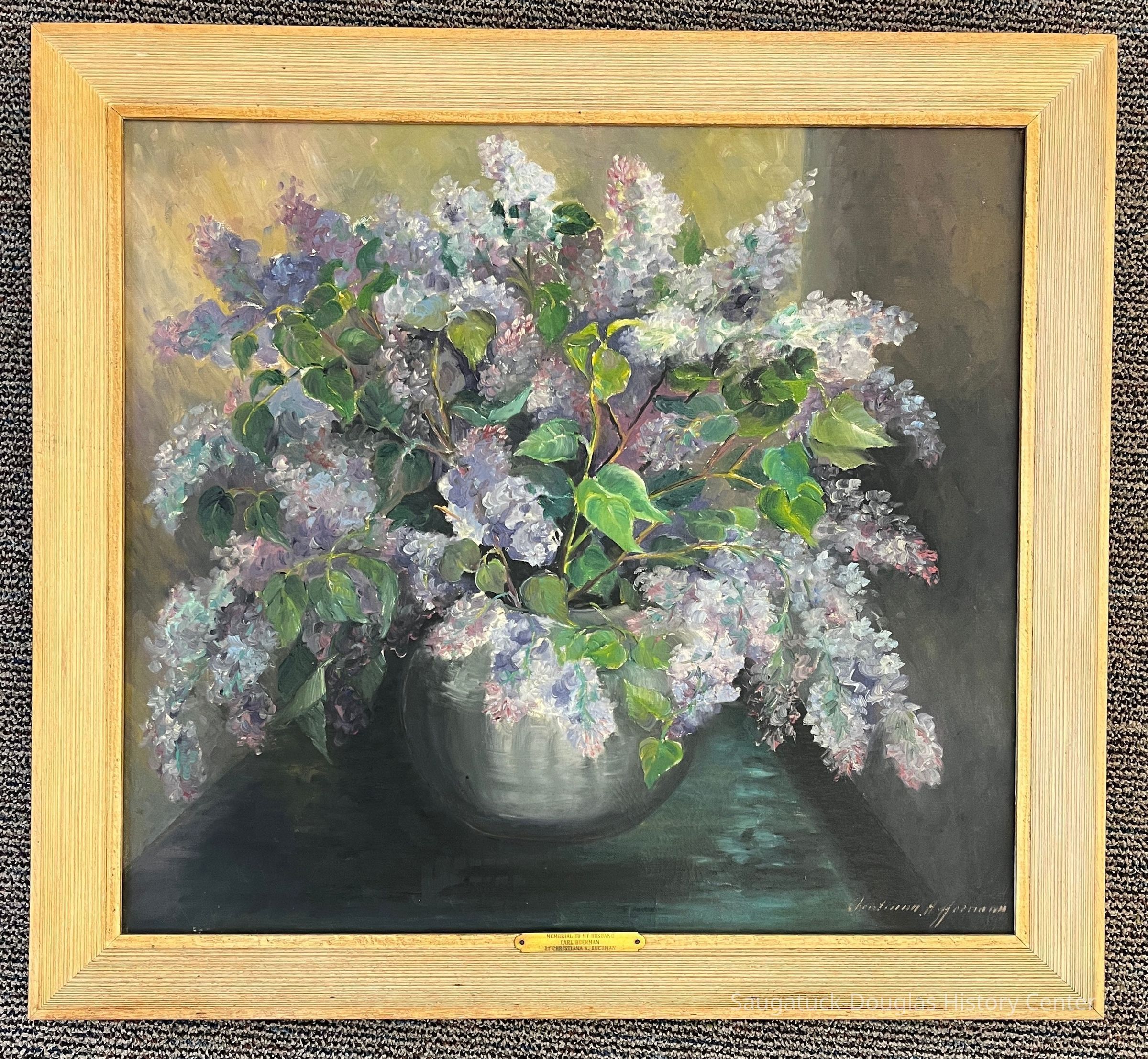 Still life painting of a round vase full of purple, blue and pink lilac blossoms.