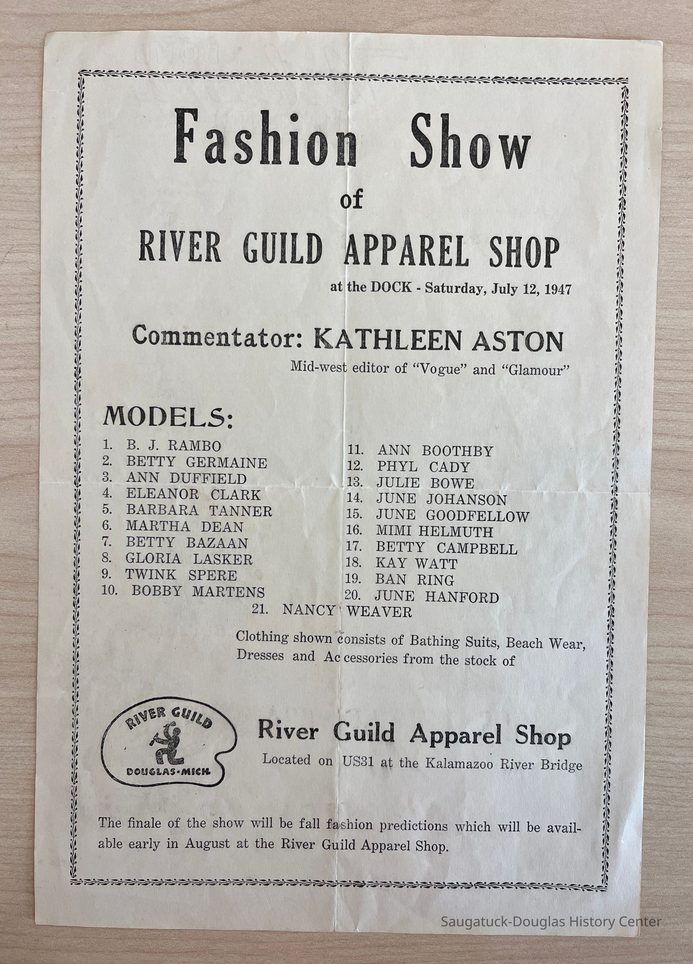 Flyer for a fashion show of the River Guild Apparel Shop. Held on Saturday, July 12, 1947 on the Dock.Fashion ShowRiver Guild Apparel ShopKathleen AstonModels