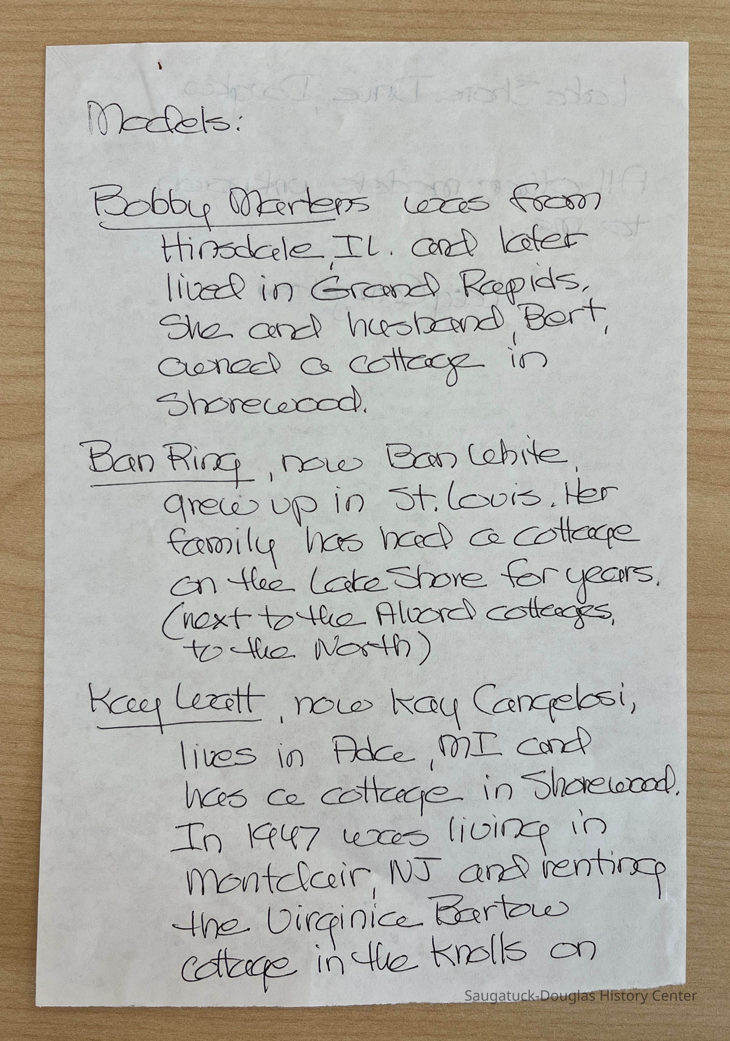 Kay Watt: Now Kay Cangelosi, lives in Ada, MI and has a cottage in Shorewood. In 1947 she was living in Montclair, NJ and renting the Virginia Bartow cottage in the knolls on Lake Shore Dr. Douglas.