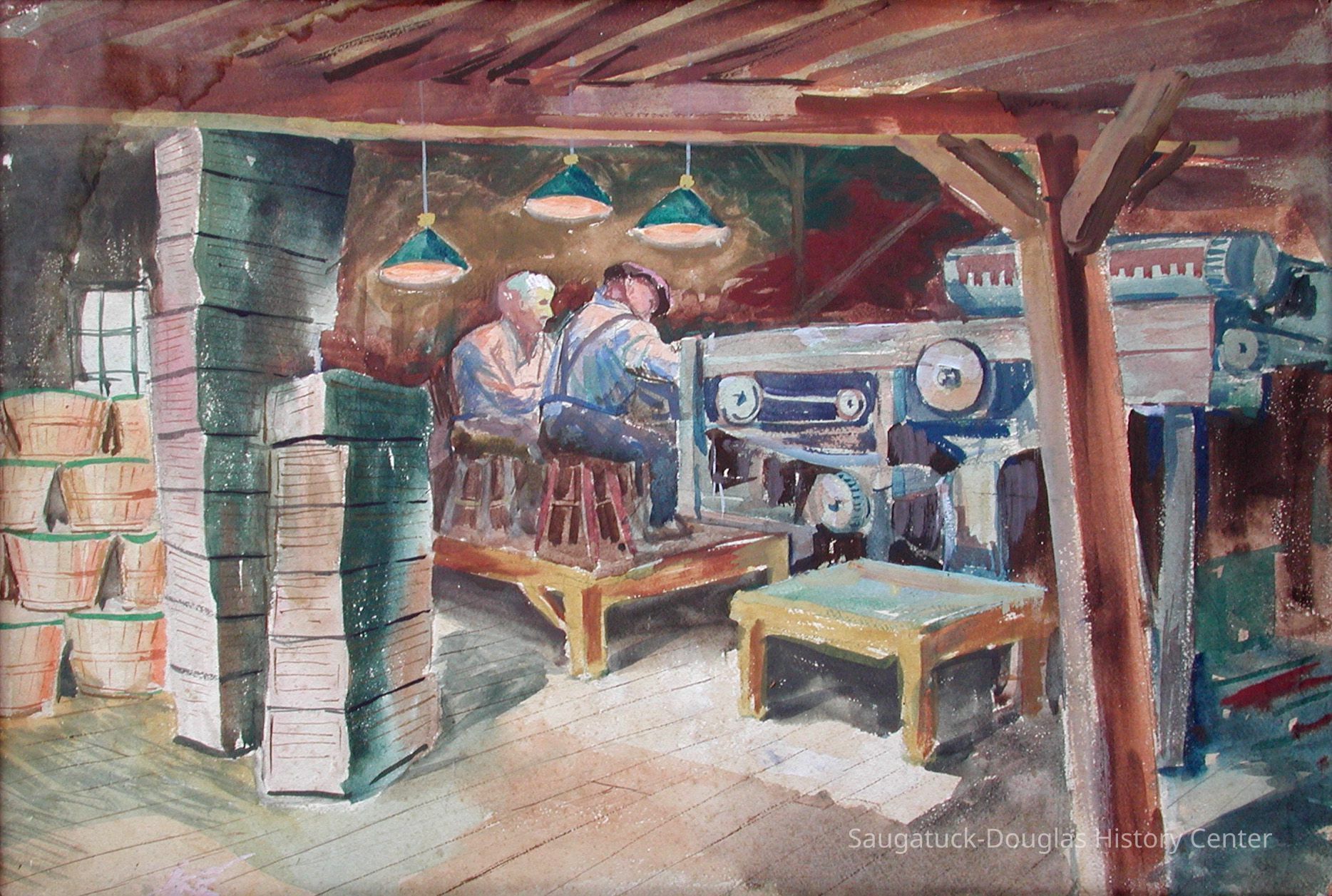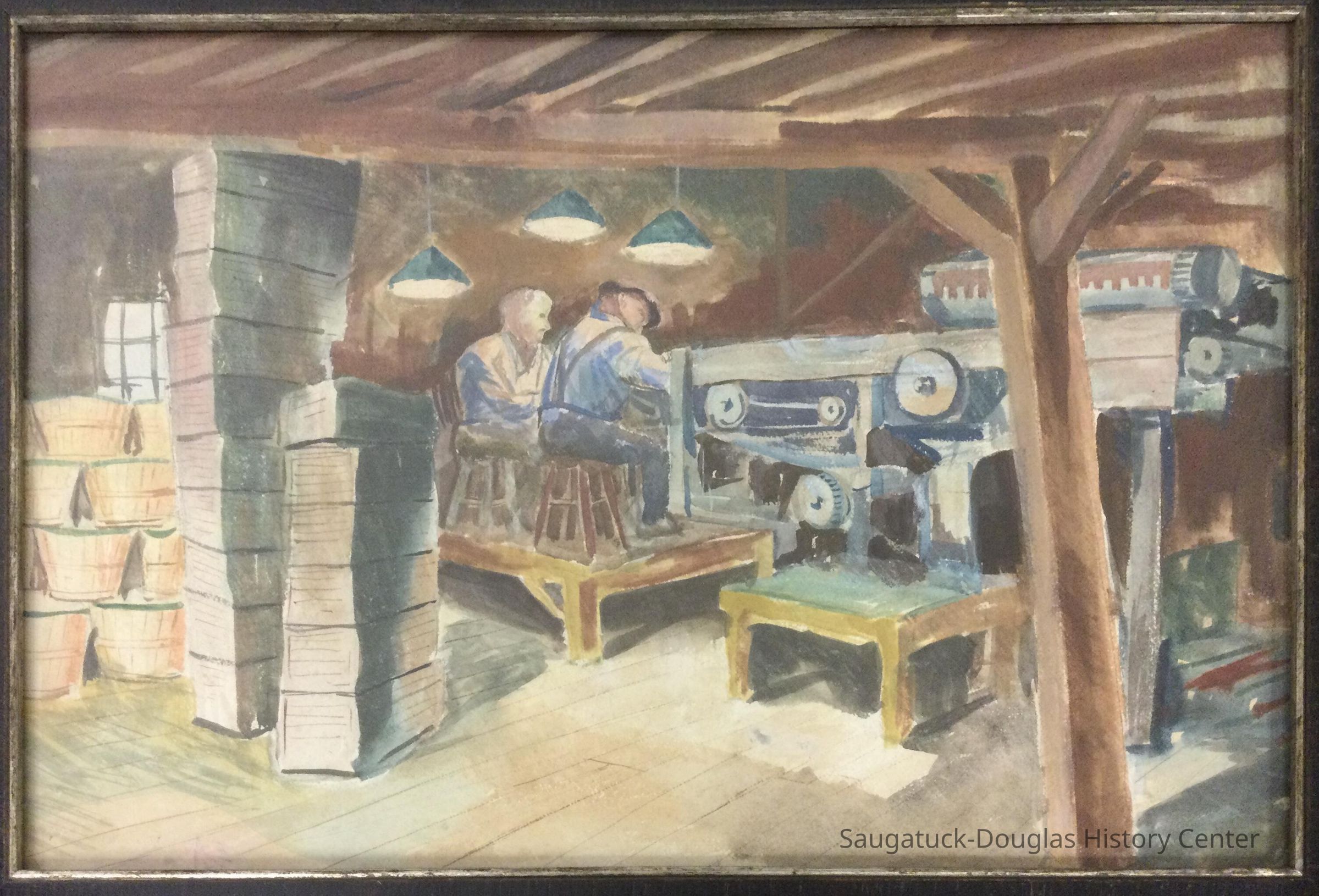 This watercolor on cardboard depicts the interior of a barn, at the fruit exchange in Saugatuck. It shows in detail two men sitting on stools towards the back of the room working with a machine. Towards the front of the painting it shows stacks of crates and fruit baskets.