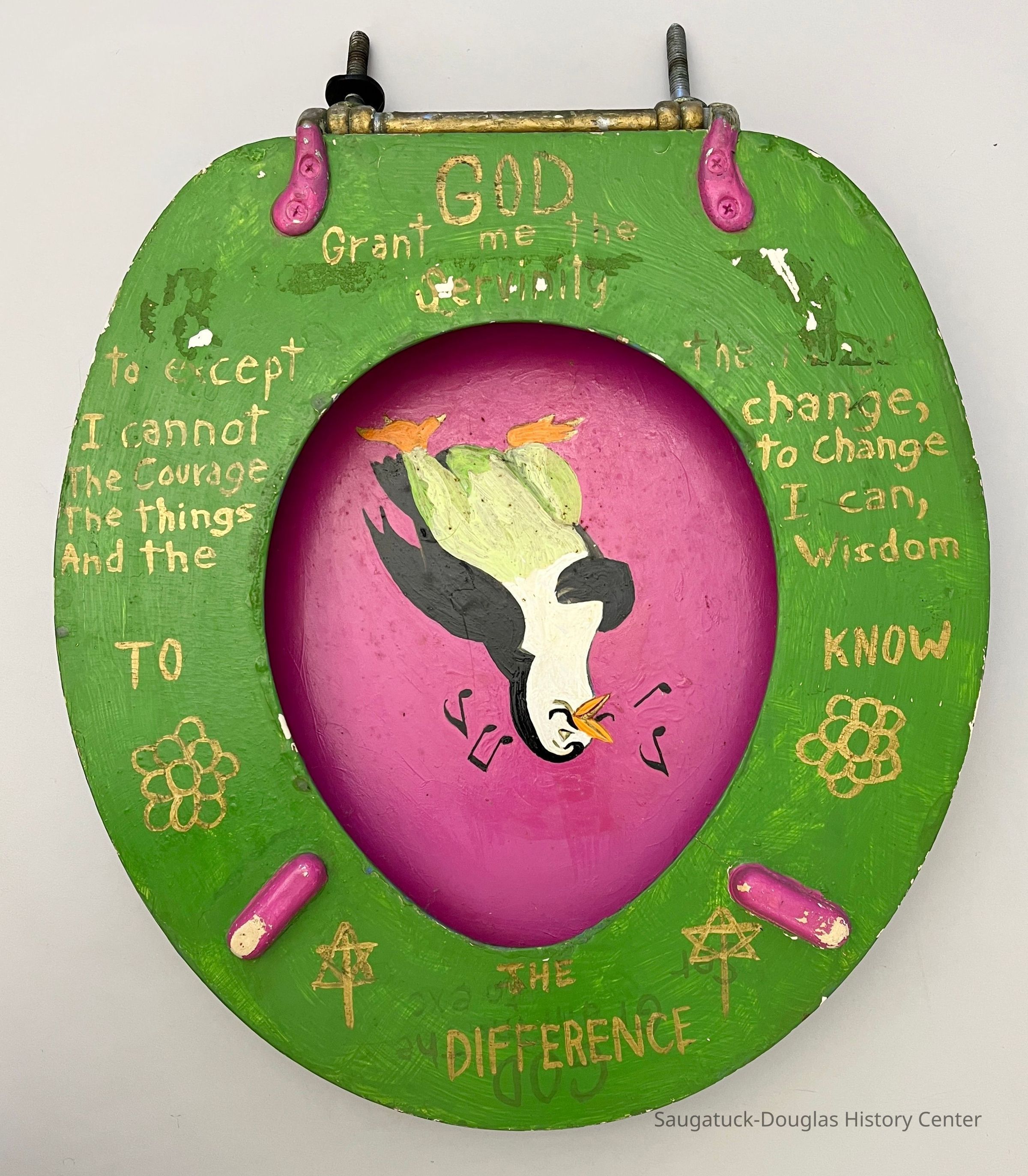 The top of the lid features a portrait of Carmen Miranda wearing her signature fruity headgear, the lower lid is decorated with a mustachioed, singing penguin, the seat is purple and unadorned, the underside of the seat is the text of the Serenity Prayer: