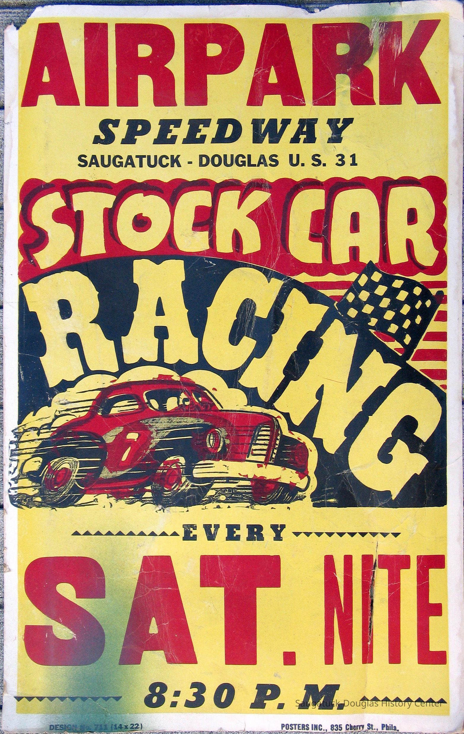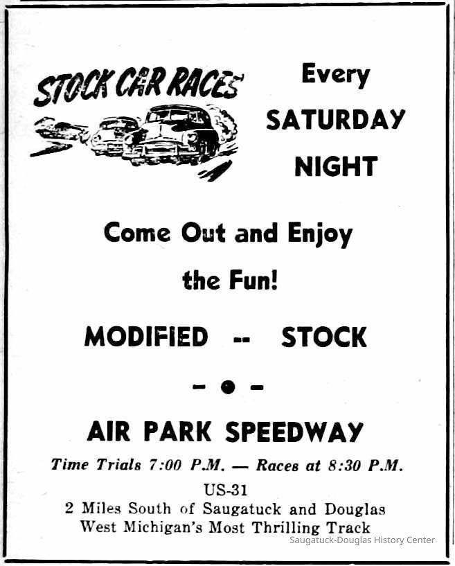 Airpark Speedway featured weekly races in stock and modified open competition classes. Mechanical specifications, from a rule sheet for the 1959 season included: MODIFIED OPEN COMPETITION 1. Any American make or year engine for open competition, 2. Engines may be installed in any position. Drivers protected by firewall, 3. Any transmission permitted. Gear change optional, 4. Carburetion, ignition and fuel optional, 5. Gas tanks of heavy steel may be inside securely fastened, with firewall between tank and driver. 6. Four wheel brakes compulsory and in good working order, 7. Intake manifold of any kind, but may be reworked. Exhaust headers permitted. STOCK TO THE EYE 1. Any vehicle will be allowed to run as long as it is stock, 2. Bodies and engine, transmission and rear end, stock to the eye, 3. Cars between years 1932 and 1953. 4. Any overhead valve has to be run in same chassis in which manufacturer installed engine. In addition to car races a few other events were held at the Airpark Speedway. One of the last was the Second Annual Saugatuck Jazz Festival in 1960. The first annual festival had been held at Saugatuck's Big Pavilion in 1959. On May 6, 1960, the Big Pavilion burned and shortly after the ashes cooled a sign appeared reminding people that "Last year on this site was held what was obviously the hottest jazz festival in the country... "The sign also identified the Airpark Speedway as the new site. The festival was held in August and included the Dave Brubeck Quartet with Paul Desmond on Friday and Duke Ellington and his orchestra headlining the Saturday night show. But it did not do well as an outdoor event. Portions of the land were later sold as home sites. The building that housed the old Airport Grill still exists remodeled as a residence. The road to the north is what is left of the east-west runway.