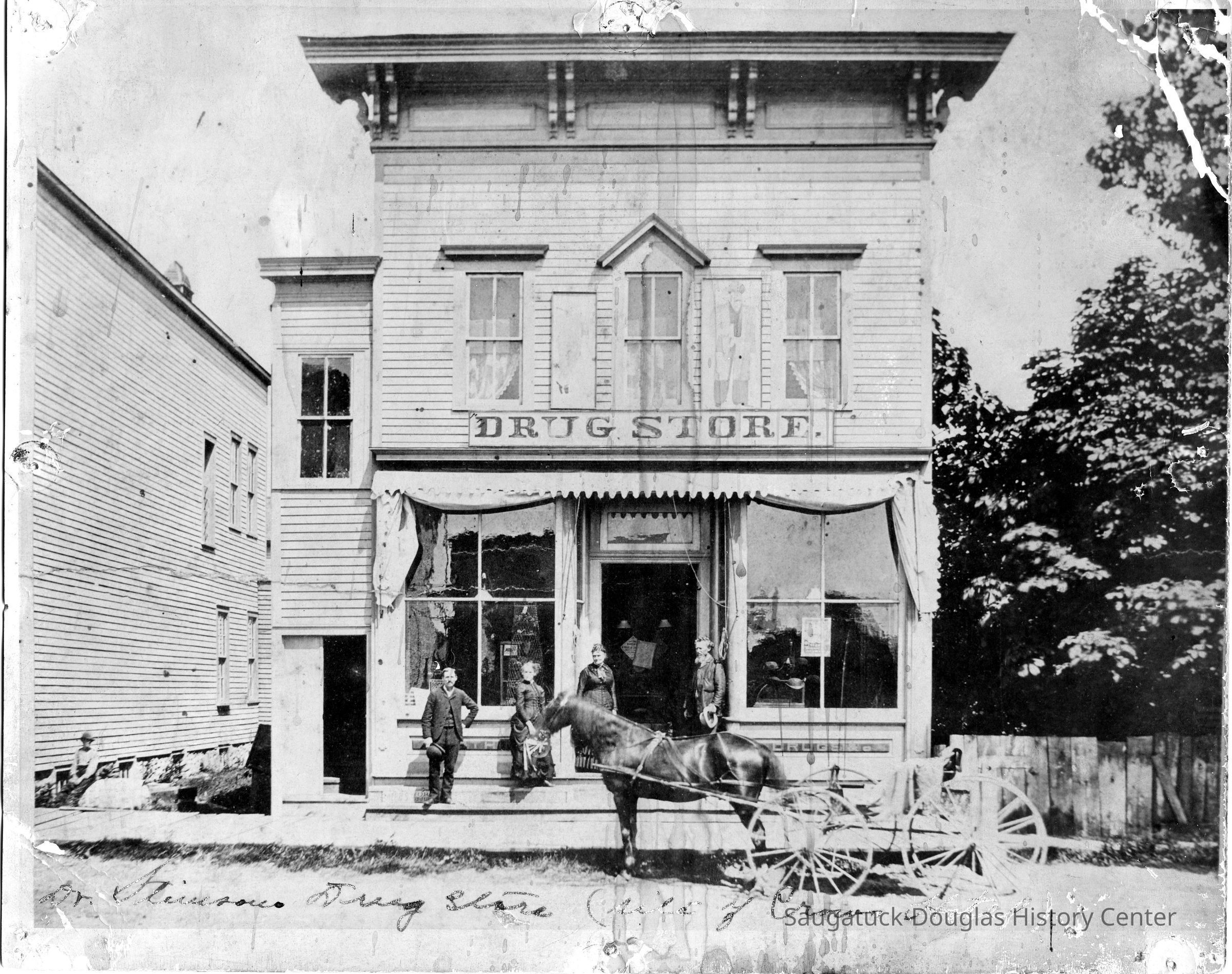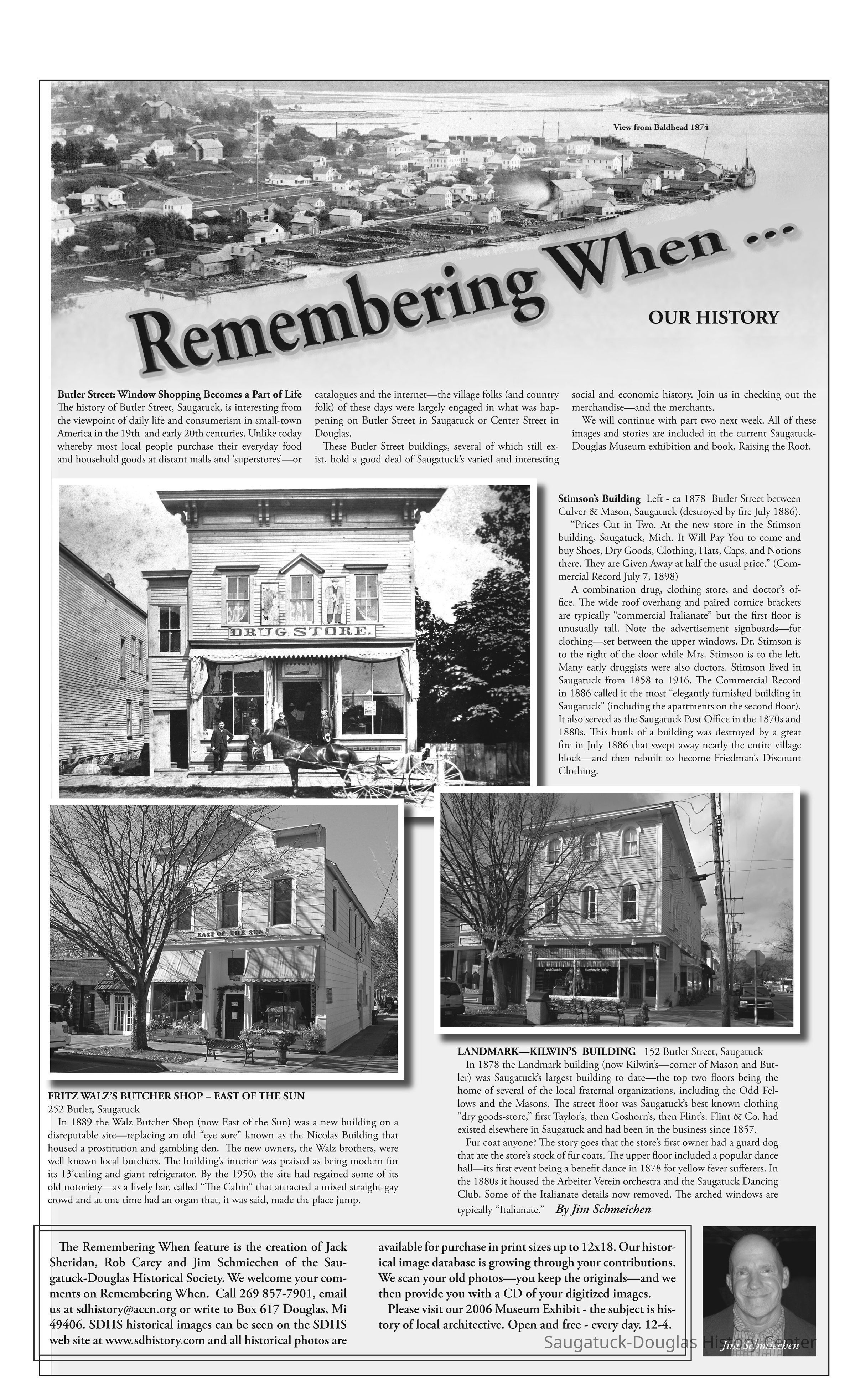 Butler Street: Window Shopping Becomes a Part of Life The history of Butler Street, Saugatuck, is interesting from the viewpoint of daily life and consumerism in small-town America in the 19th and early 20th centuries. Unlike today whereby most local people purchase their everyday food and household goods at distant malls and ‘superstores’—or catalogues and the internet—the village folks (and country folk) of these days were largely engaged in what was happening on Butler Street in Saugatuck or Center Street in Douglas. These Butler Street buildings, several of which still exist, hold a good deal of Saugatuck’s varied and interesting social and economic history. Join us in checking out the merchandise—and the merchants. We will continue with part two next week. All of these images and stories are included in the current Saugatuck-Douglas Museum exhibition and book, Raising the Roof. Stimson’s Building Left - ca 1878 Butler Street between Culver & Mason, Saugatuck (destroyed by fire July 1886). “Prices Cut in Two. At the new store in the Stimson building, Saugatuck, Mich. It Will Pay You to come and buy Shoes, Dry Goods, Clothing, Hats, Caps, and Notions there. They are Given Away at half the usual price.” (Commercial Record July 7, 1898) A combination drug, clothing store, and doctor’s office. The wide roof overhang and paired cornice brackets are typically “commercial Italianate” but the first floor is unusually tall. Note the advertisement signboards—for clothing—set between the upper windows. Dr. Stimson is to the right of the door while Mrs. Stimson is to the left. Many early druggists were also doctors. Stimson lived in Saugatuck from 1858 to 1916. The Commercial Record in 1886 called it the most “elegantly furnished building in Saugatuck” (including the apartments on the second floor). It also served as the Saugatuck Post Office in the 1870s and 1880s. This hunk of a building was destroyed by a great fire in July 1886 that swept away nearly the entire village block—and then rebuilt to become Friedman’s Discount Clothing. 252 Butler, Saugatuck In 1889 the Walz Butcher Shop (now East of the Sun) was a new building on a disreputable site—replacing an old “eye sore” known as the Nicolas Building that housed a prostitution and gambling den. The new owners, the Walz brothers, were well known local butchers. The building’s interior was praised as being modern for its 13’ceiling and giant refrigerator. By the 1950s the site had regained some of its old notoriety—as a lively bar, called “The Cabin” that attracted a mixed straight-gay crowd and at one time had an organ that, it was said, made the place jump. LANDMARK—KILWIN’S BUILDING 152 Butler Street, Saugatuck In 1878 the Landmark building (now Kilwin’s—corner of Mason and But- ler) was Saugatuck’s largest building to date—the top two floors being the home of several of the local fraternal organizations, including the Odd Fellows and the Masons. The street floor was Saugatuck’s best known clothing “dry goods-store,” first Taylor’s, then Goshorn’s, then Flint’s. Flint & Co. had existed elsewhere in Saugatuck and had been in the business since 1857. Fur coat anyone? The story goes that the store’s first owner had a guard dog that ate the store’s stock of fur coats. The upper floor included a popular dance hall—its first event being a benefit dance in 1878 for yellow fever sufferers. In the 1880s it housed the Arbeiter Verein orchestra and the Saugatuck Dancing Club. Some of the Italianate details now removed. The arched windows are typically “Italianate.” By Jim Schmeichen