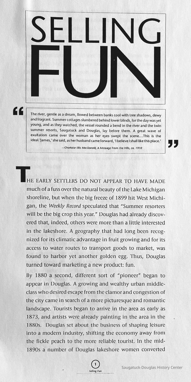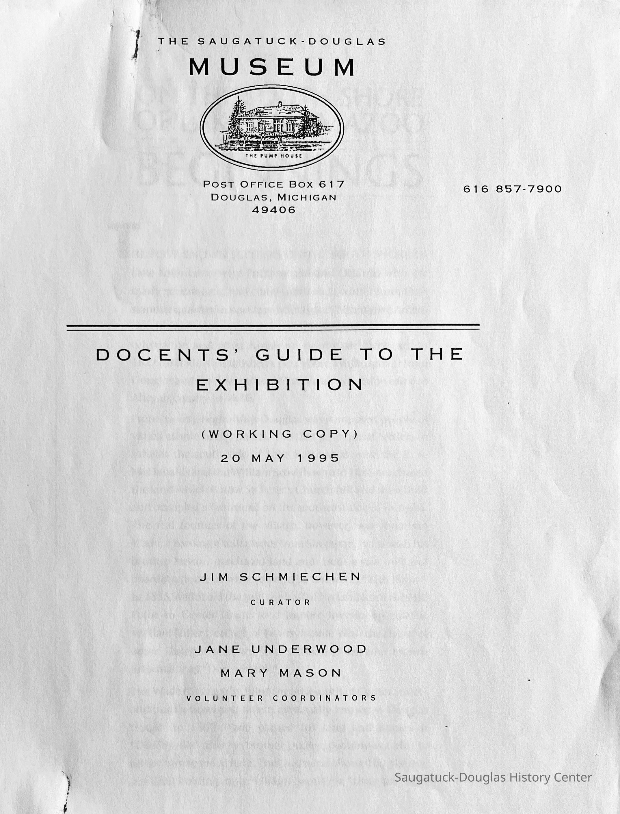 This draft text brought the museum's docents up to speed on Douglas history. The guide's language is friendly, accessible and pleasantly readable. It is labeled as a working copy and contains factual errors. Topics covered include the first settlers/pioneers, the building and population boom in the 1870s, the origin of the name Douglas, the lumber economy, tanning, peaches, basket factory, tourism and resorting, the Douglas Union School, the Douglas Hospital, Dutcher Lodge and churches. The guide includes profiles of the following people and their families: Jonathan and Nelson Wade, Michael B. Spencer, Robert McDonald, Homer Manvel, William Dutcher, Dr. Asa C. Goodrich, Daniel Gerber, Dyer C. Putnam, David Wiley, Joshua Weed, John Kirby and Sara Gill Kirby The text contains errors. Douglas peach farmer David Wiley is cited as inventor of anti-cutworm tin tree belts - this may be the invention of Edwin House of Saugatuck. Three copies of the guide exist. One copy is in the folder about the 1995 museum exhibit.