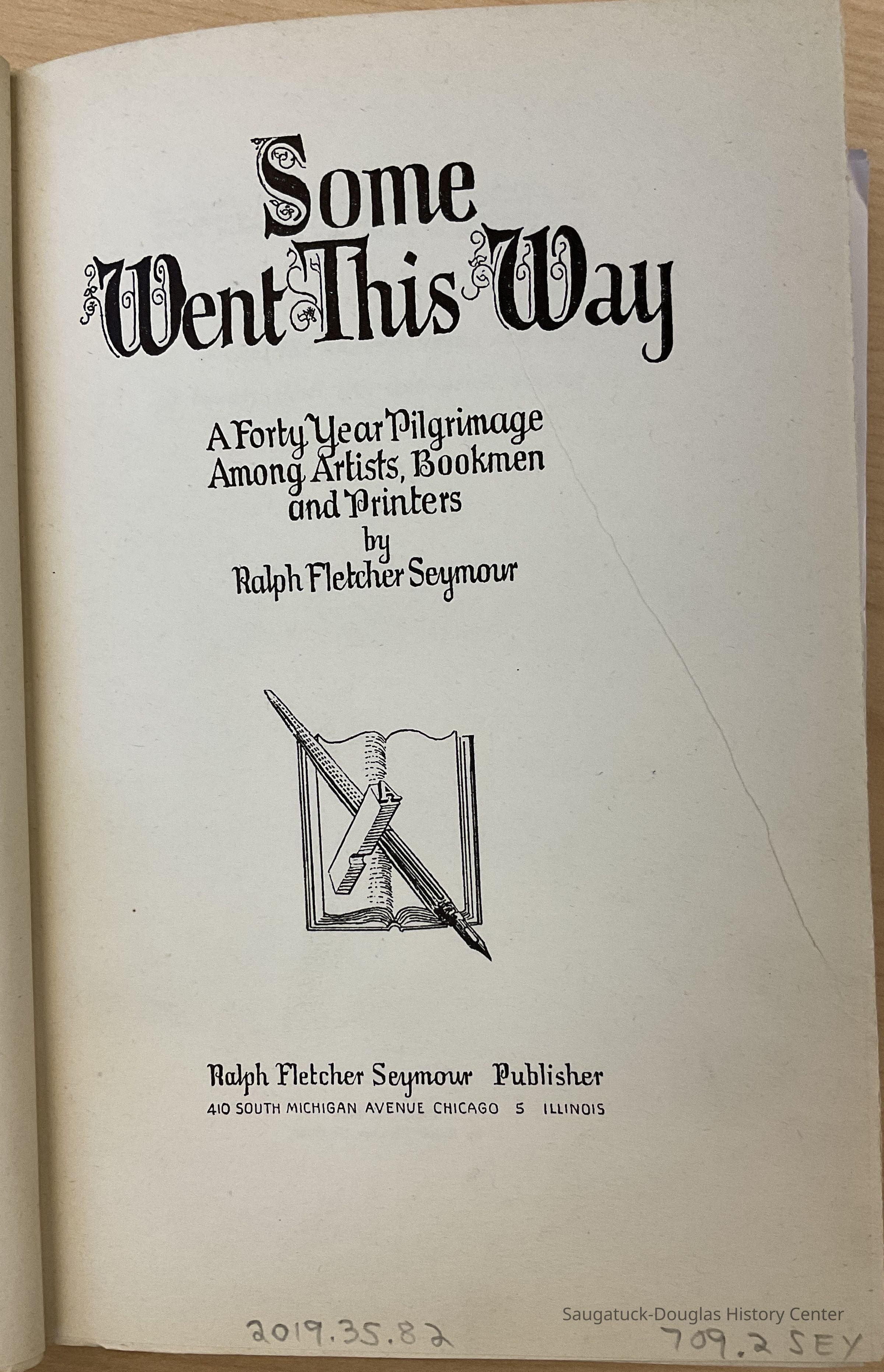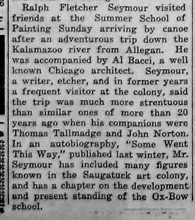 In 1945, Chicago artist and printmaker Ralph Fletcher Seymour published a book entitled Some Went This Way. In it he describes the art world of Chicago beginning about 1900, covering many of the artists who were important to the Saugatuck area. First, he describes the general life in one of America's fastest growing cities. "City life was undergoing radical changes. Thousands of strangers swarmed into them, who did not care for American institutions or standards. Cities became less attractive centers, life less pleasant and more complicated. Boulevards were jammed with automobiles, congested districts overflowed into one-time exclusive sections, continual din, ever present dirt and conglomerate associates for children influenced many to pick up and move elsewhere... Some of my friends went back to live with nature because they could not remain happy in the city." He describes artist enclaves founded at the time including visits to Indiana with Frank Wilstach, a school by founded by Jens Jensen in the upper part of the Green Bay peninsula in Wisconsin, Frank Lloyd Wright at Talesien. Then he moves on to Michigan: "There is yet another retreat and school, materialized by those who have been my friends. It lies on the big lake's eastern shore, just outside the village of Saugatauk [sic]. When I think of it I think of John Norton and Thomas Tallmadge, who did much to make it what it now is. Naturally attractive features surround the place. A few old pine trees an a hillside facing a wide and placid river, behind them many acres of forest, glade and ridge, great dunes of white sand, one or two of which are notable because they are so-called traveling dunes, and in their laps Goshorn Lake, and Lake Michigan beyond and miles of soft, clean sand beach on which long waves of surf glow and spend; a great marsh and a fabulous buried city, once the lumbering town of Singapore; all these are part of the lay-out into which Norton and Tallmadge moved many years ago, to build retreats for themselves and their friends. The Kalamazoo river makes a great bend around the spot where they located, cutting it away from the nearby town. this river is crossed by an ancient ferry with windlass and iron cable. On the top of a sand ridge stands an abandoned house in the wind swept rooms of which may still be founds a piano, kitchen dishes and even bedroom furnishing, it being to hard to lug them back into circulation. The Saugatauk Summer Art School hold forth at the place where Norton and Tallmadge built their cottages. Norton used to teach classes there, Tallmadge kept the school alive by diligent, zealous interest in its welfare. Francis Chapin is now its head instructor. About fifty boys and girls spend a few summer months in cottages or hot old hotel reams, finding out how to paint in the chapin way, making lithographs, modelling in wax or clay, swimming, going to night beach parties on the lake shore. Otta Schneider and I went there for our first visit in 1915, the summer after our return from France, as guests of Tom Tallmadge. Each succeeding summer until death removed first John Norton and then Tom Tallmadge this place was the summer home for these two and a week-end paradise for nee. John liked nothing better than to start a small fire, out under the pines, at dusk and sit before it until long into the night, talking on art, women and other mysteries. Friends came to this camp and school each summer. Among those counted on as "steadies" were Albert Shaver, Arthur Bissell, Eames McVeagh, Jarvis Hunt, Charles West, Harry Bigelow and Joseph Ryerson. I did not fail to get there two or three times each year until Tallmadge died in a railroad accident in the year 1940. Back of their cottages in the forest glade called "The Temple" stand three large hemlock trees. 0n one is affixed a bronze plaque bearing this inscription NATURE FIRST HE LOVED AND AFTER NATURE ART This is in memory of John Norton, whose ashes are scattered there among the fee roots. On a second tree is a similar plaque in memory of Thomas Tallmadge and the third bears another in memory of Frederick Fursman, who was the head of the school for many years until his recent death. I have an interest in these plaques for John's was designed and modelled by me, Tom's was modelled by Marion Reed after my design; the third she both designed and modelled." He ends his discussion of the artists and the back-to-nature movement: "Thus artists come and go; the dance ends, the pen rusts, the worn brush is laid aside, the ideologies they helped form change; suddenly a new world, busier than any before, stands revealed. It seems to care not at all for past thoughts and deeds, on which, however, it is built. The dull arts, whose work has just recently been taken down from the permanent exhibition at the Art Museum, lives effectively in the understanding by which his modern successor produces just what the Doctor ordered for today's needs." Some of the tall hemlock trees which formed the natural "temple" in the woods between Ox-Bow and the Kalamazoo River have, in the last ten years, succumbed to old age and weather and the plaques have been removed. What is left of The Temple is still a very special place. --- Source: SDHS newsletter, pages 501-502