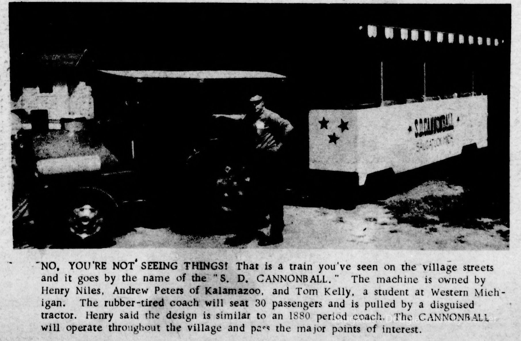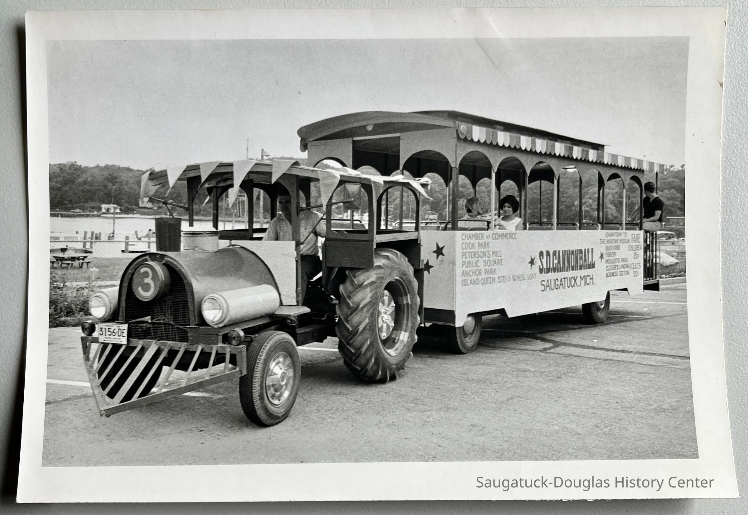 The Cannonball was a Chamber of Commerce shuttle service that transported tourists between Cook Park, Peterson's Mill, Saugatuck Village Square, Anchor Park/Island Queen Docks, the Chain Ferry to the Maritime Museum, the Duck Pond, Fishery, Mosquito Park (Willow Park) Clover's Landing and the "Business Section". Adult fare was 50 cents, children 25 cents.