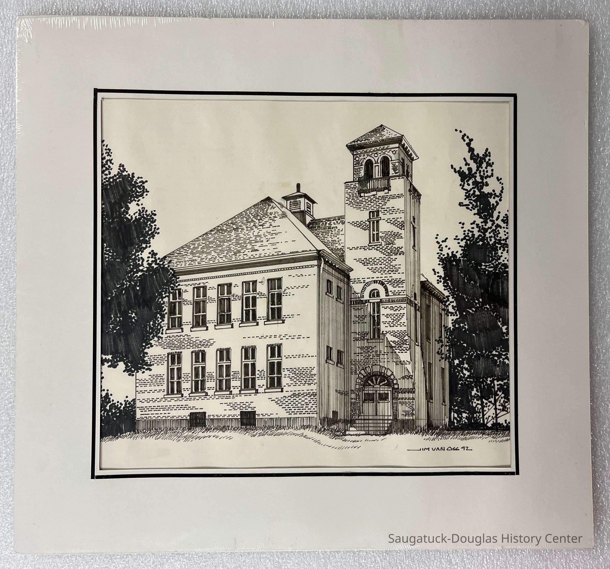 James Van Oss, "Saugatuck Highschool", 1897-1950", 1992 - India ink drawing. 16"x14"