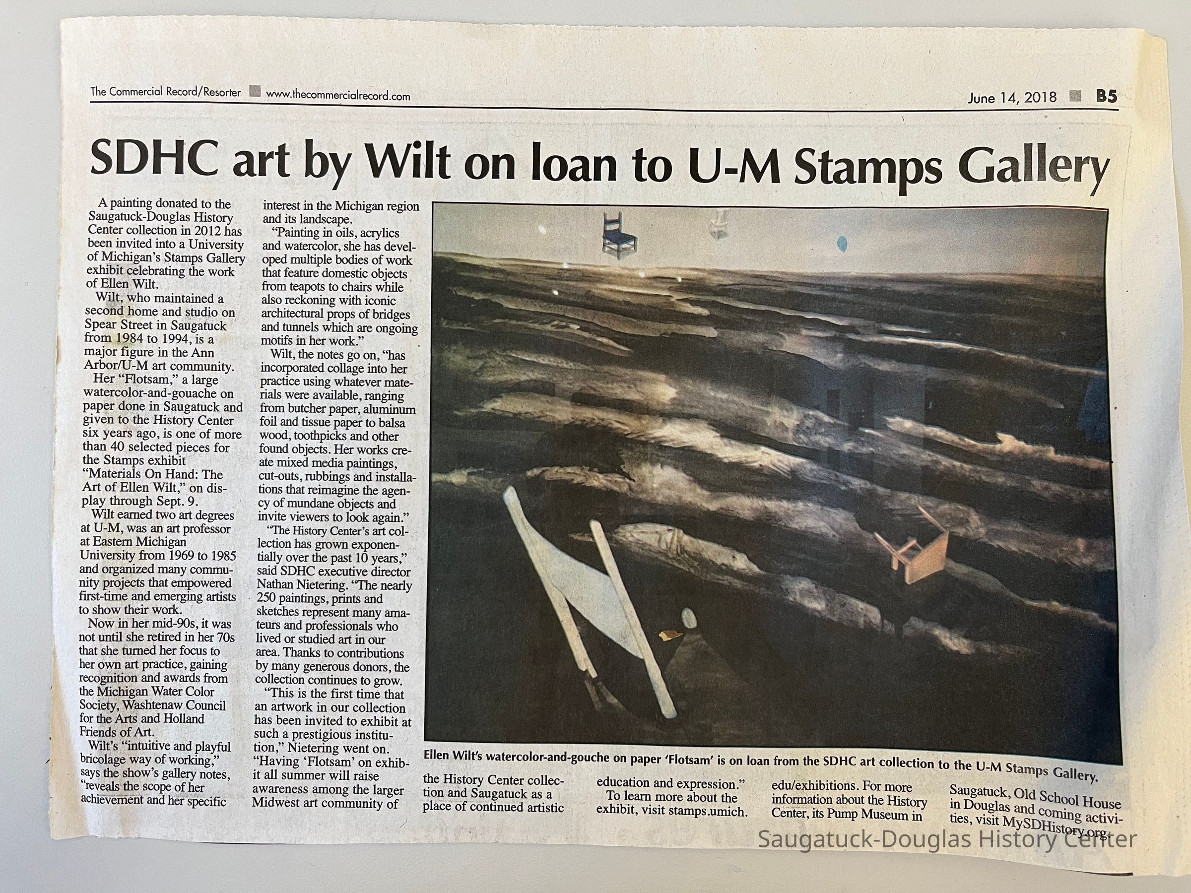 Ellen Bonar Wilt b. 1921 Flotsom c. 1985 watercolor on paper Notes: As a person very concerned about controversy regarding water resources, Ellen set out to create a monumental statement about protecting Michigan's greatest natural wonder, Lake Michigan. Ellen worked with the OxBow Outreach program in Saugatuck. In this painting, she uses a symbol, the chair, that is recognizable to those connected with the Summer School of Painting. She alludes to the fact that people (the chairs) are being "washed away". Wilt fears that the water is not being protected for people. The "turned away" chair seems to represent ambivalence on the part of some. Wilt considers this piece to be one of her masterpieces. The large watercolor was created in Saugatuck. It was Ellen's wish that it remain with the people and place she loved so much. Ellen's Grandfather was the well-known Pennsylvania artist, James Bonar. Ellen's husband, Richard Wilt, taught at the Ox-Bow Summer School of Art in Saugatuck during the summer of 1947. Ellen accompanied him. The couple made their home in Ann Arbor; he taught art at the University of Michigan, and she taught art at Eastern Michigan University in Ypsilanti. After Richard's death, Ellen became a part-time resident of Saugatuck, maintaining a studio on Spear Street. Collection: Saugatuck Douglas History Center Gift of: Ellen Bonar Wilt (In memory of Richard Wilt)