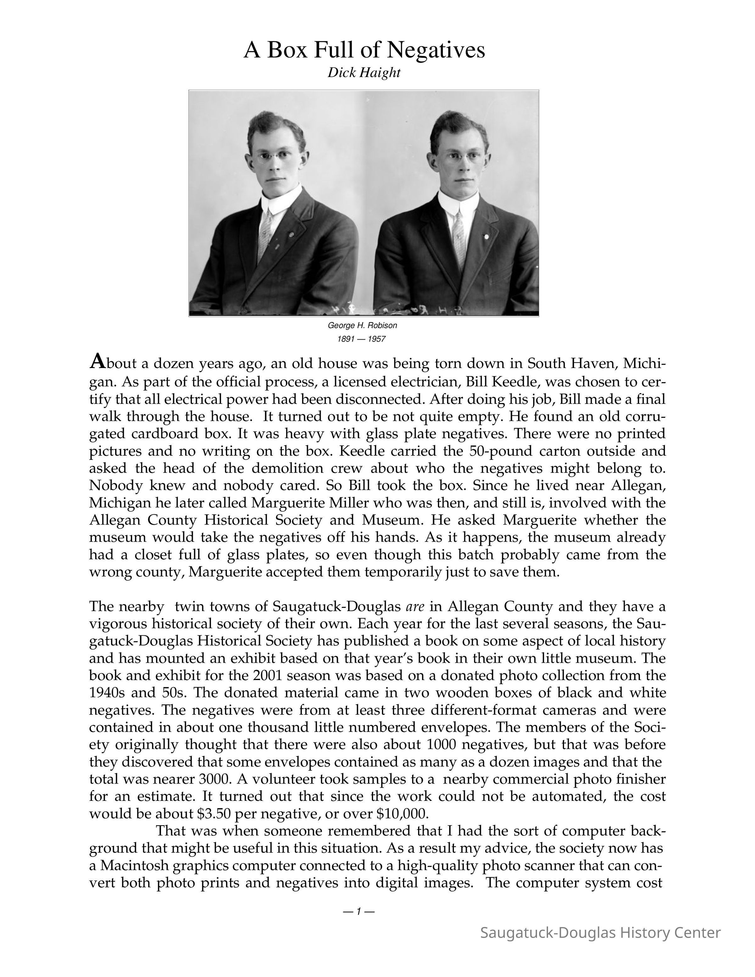 Introductory text from Mr. Haight's PDF. About a dozen years ago, an old house was being torn down in South Haven, Michigan. As part of the official process, a licensed electrician, Bill Keedle, was chosen to certify that all electrical power had been disconnected. After doing his job, Bill made a final walk through the house. It turned out to be not quite empty. He found an old corrugated cardboard box. It was heavy with glass plate negatives. There were no printed pictures and no writing on the box. Keedle carried the 50-pound carton outside and asked the head of the demolition crew about who the negatives might belong to. Nobody knew and nobody cared. So Bill took the box. Since he lived near Allegan, Michigan he later called Marguerite Miller who was then, and still is, involved with the Allegan County Historical Society and Museum. He asked Marguerite whether the museum would take the negatives off his hands. As it happens, the museum already had a closet full of glass plates, so even though this batch probably came from the wrong county, Marguerite accepted them temporarily just to save them. The nearby twin towns of Saugatuck-Douglas are in Allegan County and they have a vigorous historical society of their own. Each year for the last several seasons, the Saugatuck- Douglas Historical Society has published a book on some aspect of local history and has mounted an exhibit based on that year’s book in their own little museum. The book and exhibit for the 2001 season was based on a donated photo collection from the 1940s and 50s. [Simmons Collection] The donated material came in two wooden boxes of black and white negatives. The negatives were from at least three different-format cameras and were contained in about one thousand little numbered envelopes. The members of the Society originally thought that there were also about 1000 negatives, but that was before they discovered that some envelopes contained as many as a dozen images and that the total was nearer 3000. A volunteer took samples to a nearby commercial photo finisher for an estimate. It turned out that since the work could not be automated, the cost would be about $3.50 per negative, or over $10,000. That was when someone remembered that I had the sort of computer background that might be useful in this situation. As a result my advice, the society now has a Macintosh graphics computer connected to a high-quality photo scanner that can convert both photo prints and negatives into digital images. The computer system cost under $5000 and it has been used to do lots of other tasks beyond just viewing the 3000 negatives. One of the things that it turned out to be good at was scanning old glass plate transparencies. I didn’t plan it that way — it just happened to work out. In the fall of 2001 the society started work on their 2002 book about shipwrecks of the Saugatuck area. [Storm, Fire and Ice] Kit Lane, society president and co-author of the new book, wanted pictures of artifacts from a locally-famous wreck, the Chicora. The artifacts are housed in the old county jail building in Allegan, which is now the Allegan County Museum. So she dragged her co-author, Jack Sheridan, and me to Allegan. Here the plot thickens: As you have guessed by now, the people equipped to scan glass plates have arrived at the temporary home of the orphaned negatives. And guess who greeted us at the museum? Well, that self-same Marguerite Miller who had saved the negatives a decade earlier, that’s who. And after we photographed the Chicora’s mast and purser’s cashbox, Marguerite rather forcefully offered us a 50-pound box of glass plate negatives to take back with us. It felt like being offered a second helping of dessert after Thanksgiving dinner, but how could we refuse? Jack is younger than I am so he got to carry the box to the car. There seemed to be no urgency about that box. It hadn’t even been found in our county. But a week or so later, Jack held a few negatives up to the light and, as a result, took some promising plates to the Saugatuck-Douglas Library — where the Historical Society’s Macintosh computer is housed. And there he scanned them. Surprise, surprise! Most of the pictures were not taken in South Haven proper. As a guess, 30% were taken at Kalamazoo College and another 50% at or near a farm called Fern Glen that was at the northern (i.e., Allegan County) edge of South Haven. The remainder are mostly of unidentified and now unidentifiable places.