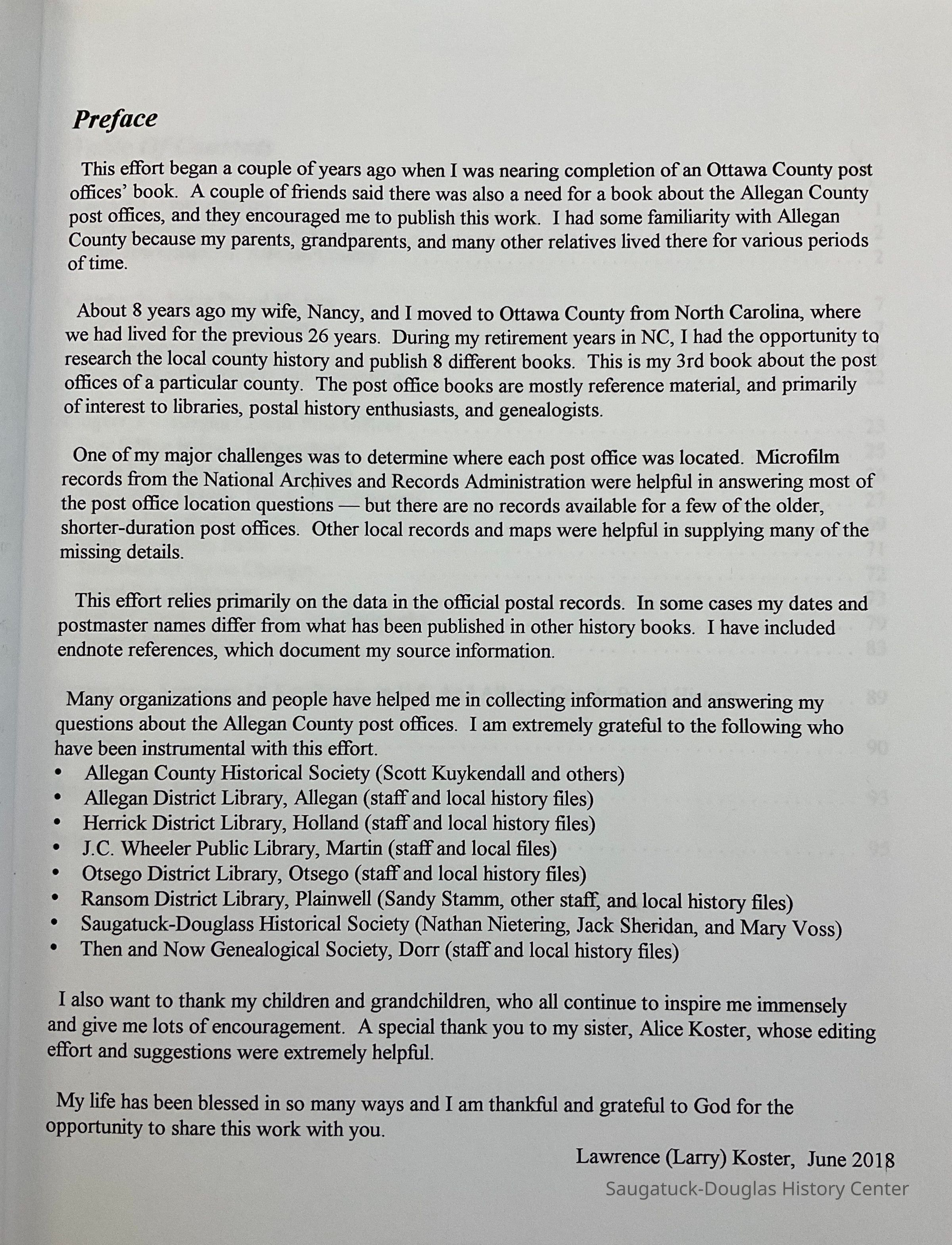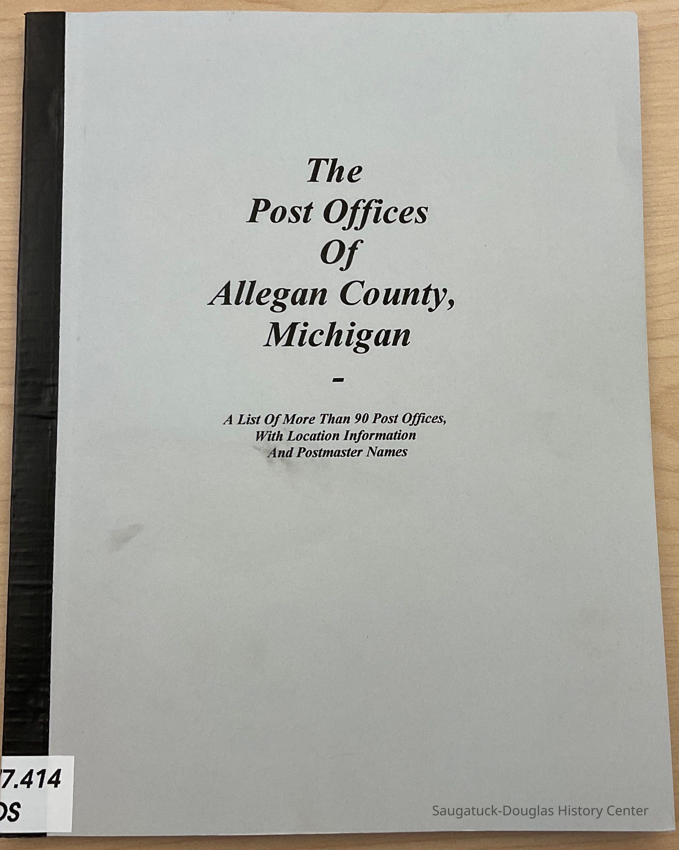 A 101 page book listing the post offices of Allegan County - A list of more than 90 Post Offices with location information and postmaster names.