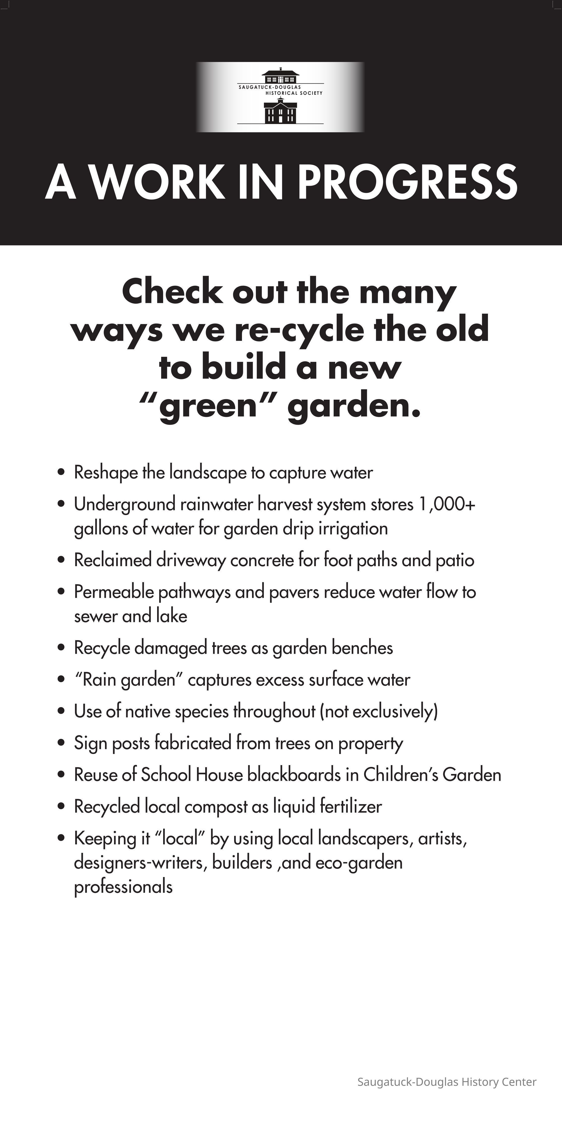 Documents about the development of the gardens surrounding the History Center in Douglas. Information about the boathouse is in box 182 - The Old School House Project.
