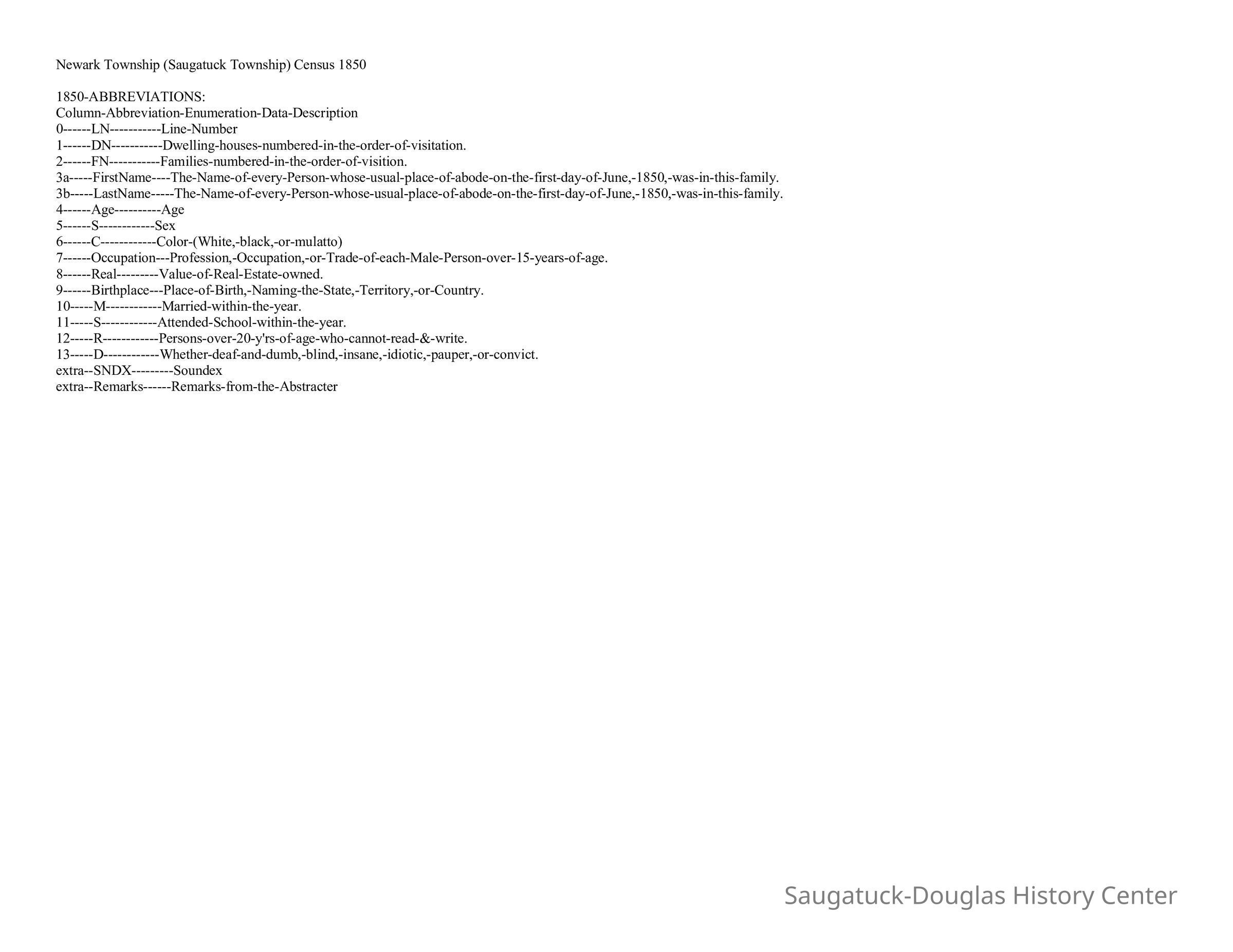 The 1850 census data recorded the surname [family name], age, sex, race, occupation, birthplace, marital and educational status of everyone found in Newark Township, today's Saugatuck Township.