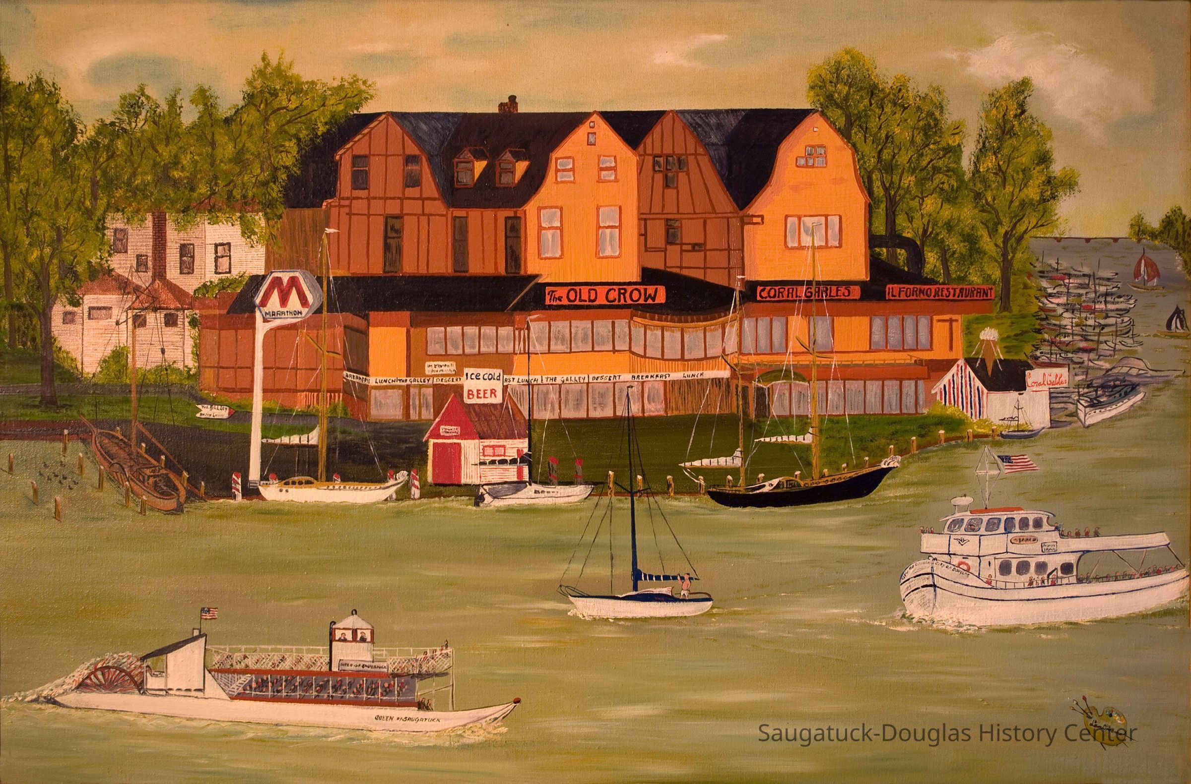 from "Pieces of our Past" 2017 at OSH A local scene captured by local a artist. Coral Gables by Len Lynema 1979, oil on canvas Gift of Chris Spencer and Charles Aschbrenner in memory of Paul Fried Len Lynema was a Saugatuck area artist who ran an antique store in the village in the 1960s. He painted around town when artists were to be found everywhere, occasionally setting up their easels in the streets while traffic simply drove around them. Lynema’s most notable work was a series of paintings he did for a South Haven Restaurant. The building which would become the Coral Gables was begun in 1903, but it was not until 1908 that it was sufficiently completed for a grand opening. The building has gone through several owners and has changed in appearance over the years. Lynema captures the Coral Gables in 1979 when there was an ice cream shop and Marathon gas pump on the docks. The bridge to Douglas is in the right background. Two excursion boats, the Queen of Saugatuck (left) and the City of Douglas (right) go in opposite directions, clearly showing that this was the place where things were happening.