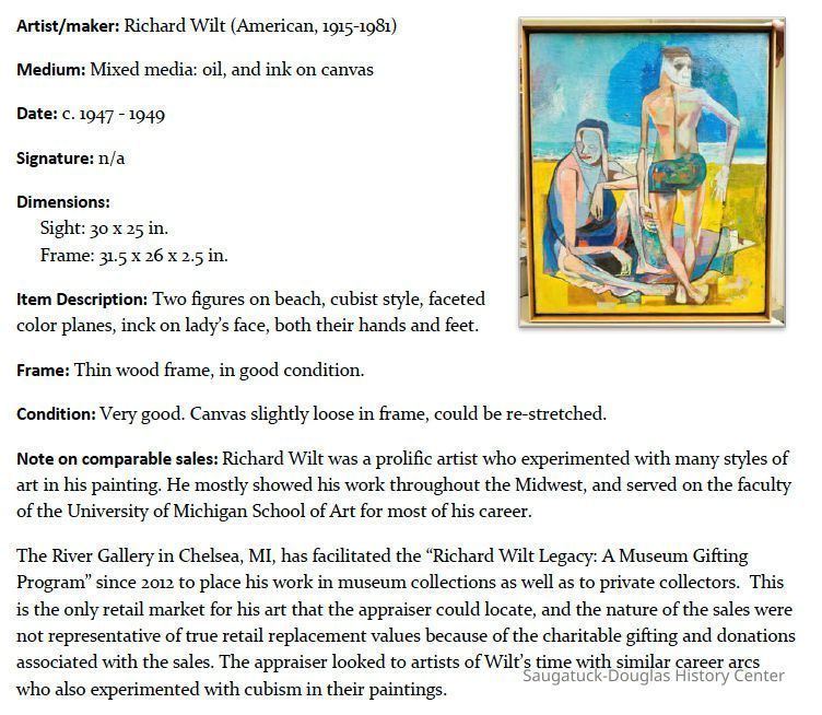 Richard Wilt 1915 – 1981 Beach Scene Lake Michigan 1947 | oil on canvas Notes: Richard Wilt, accompanied by his wife, Ellen, taught at the Ox-Bow Summer School of Painting in Saugatuck during the summer of 1947, the same year he would go on to become a professor of painting at the University of Michigan in Ann Arbor, where he made his home. During his time at Ox-Bow, Wilt pondered the thought processes that might have been part of “being Picasso”. Here he explores “Cubism” with a couple enjoying a day at Oval Beach. The work is from Wilt’s time at Ox-Bow, here in Saugatuck. It may be unfinished, indicated by the “dip” in the horizon line to the right and the fact that he did not sign the canvas. The Saugatuck area has long been famous for the light play of rays against sand and water. Here, Wilt captures the intense heat of sun on sand contrasted against the bright blue as sunlight dances on the water. Wilt also accentuates the human qualities of the figures by drawing in knuckles and toes. The female seems to be somewhat sunburned as she turns away, her head covered with a towel. The male figure almost struts in his stylish suit! Both seem to be preoccupied with activity on the beach rather than Lake Michigan. Collection: Saugatuck Douglas History Center Gift of: Ellen Bonar Wilt (In memory of Richard Wilt) Accession: 2012.62.01