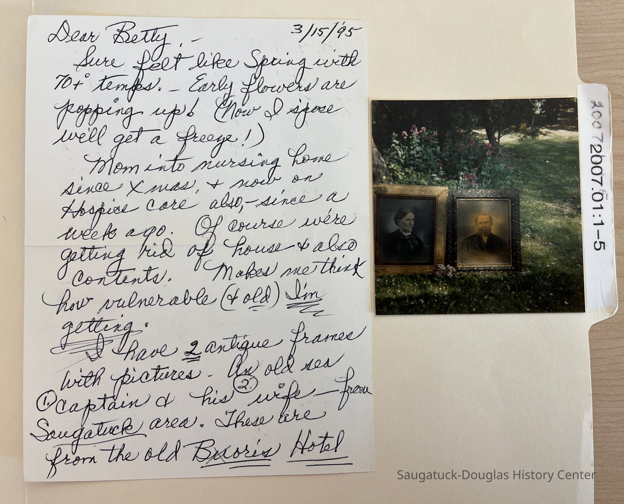 Note dated 3/15/95 from Sunny asking if Betty [Schippa] would like to have two framed photographs of Henry Bird and Elizabeth Morrison that once hung in the Buoris Hotel. The portraits are misidentified as of an "old sea captain and his wife." The Buoris Hotel was located at the corner of Hoffman and Butler St. (1956 Chamber of Commerce book advertising)