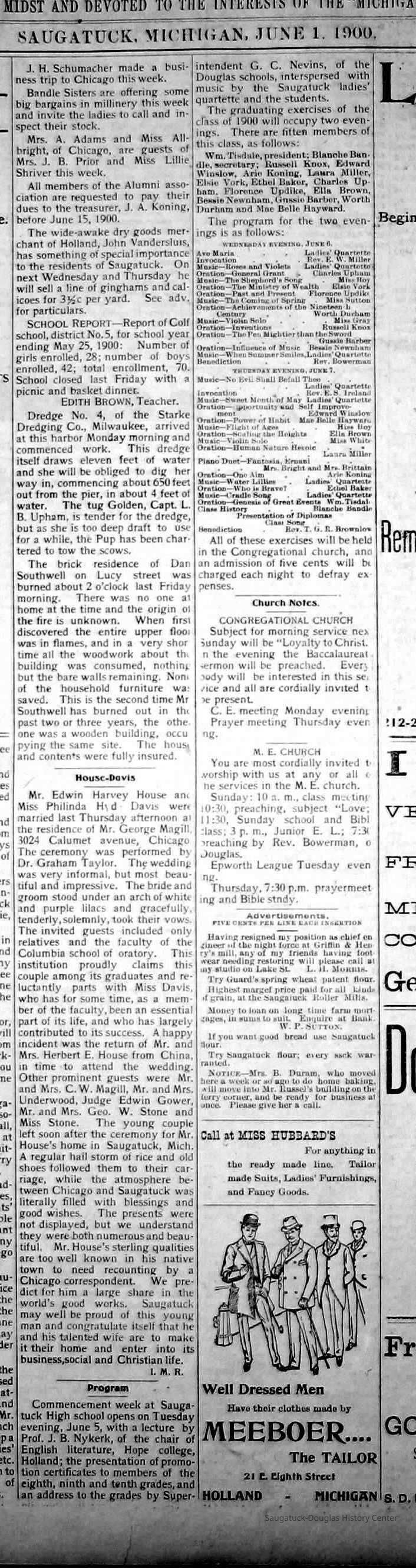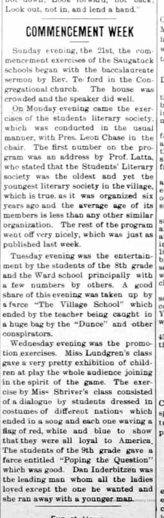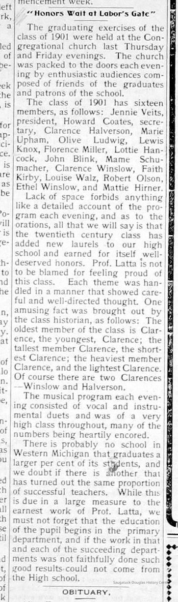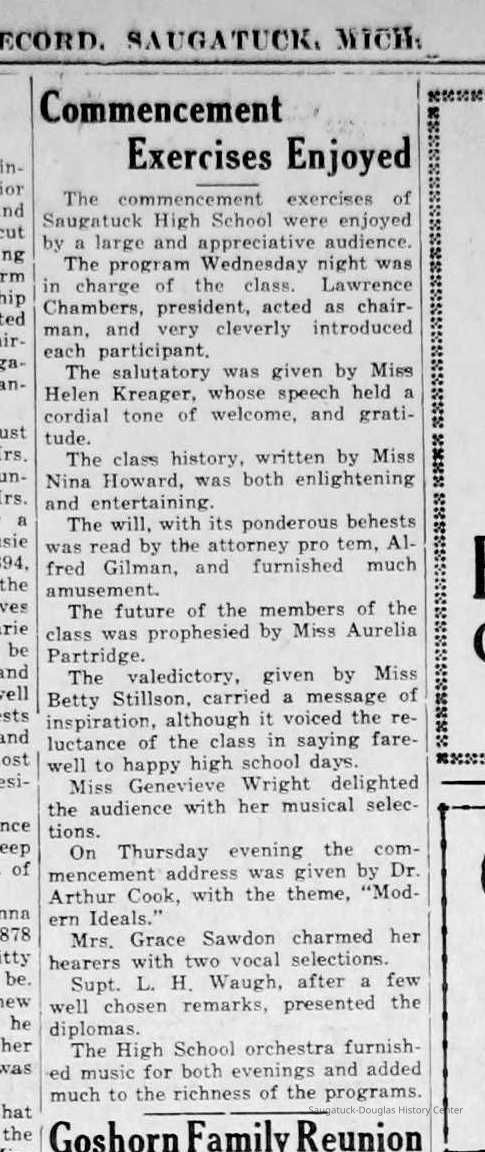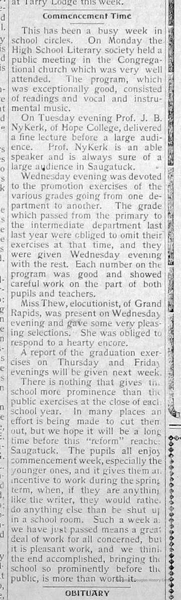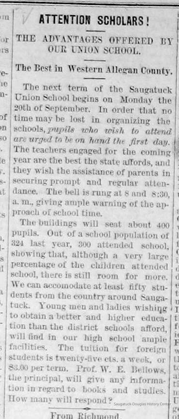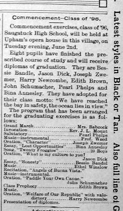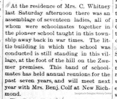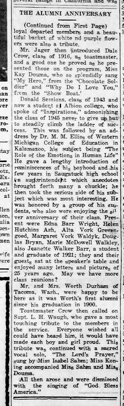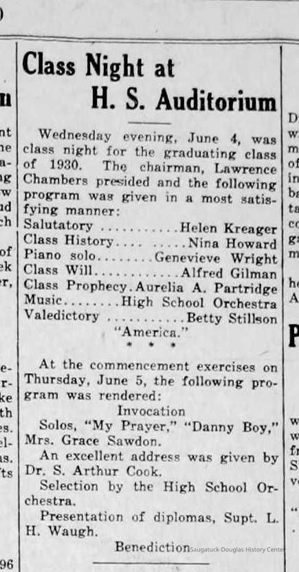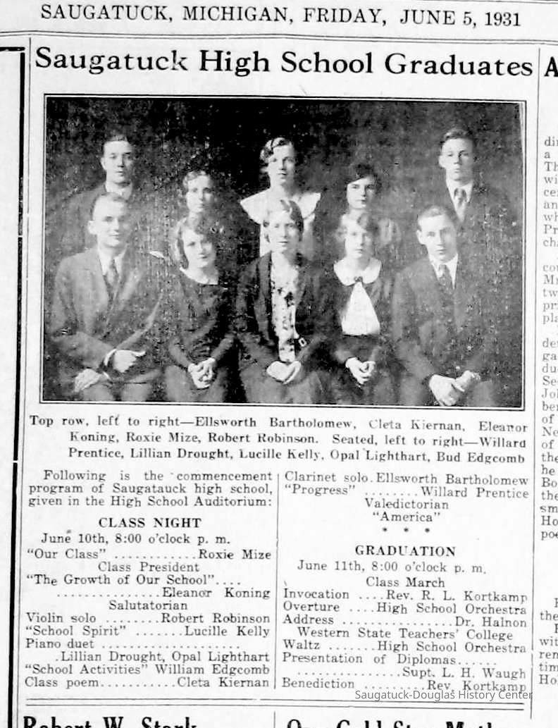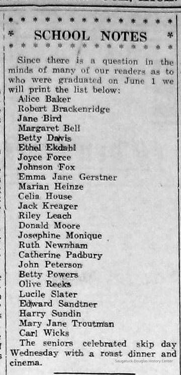 Chase School District No. 5Douglas Union School 1866-Saugatuck Public School 1897-1950Saugatuck Union School 1866-1896Dunn, George E. 1835-1903Sutton, Warner Perrin 1849-1913Warnock, James 1851-1899Skinner, Edmond 1832-1906Bandle, Elizabeth "Bessie"Zwemer, Joseph Benjamin 1879-1945Brown, Edith 1882-1954Schumacher, JohnBrown, Pearl (Phelps)Whitney, Johanna Clara (Burns) 1855-1918Colf, Ellen Elizabeth (Lamoreux) 1841-1920Barber, Daniel L. 1840-1909Dickey, J.W. 1848-1916Leland, Jessie S. (Morrison) 1851-1911Latta, Prof. P.A. c1838- 1911Tisdale, William Graham Jr. 1882-1933Bandle, Blanche HazelKnox, Russell AllenWinslow, Edward WebsterKoning, Arie James "Ira" 1883-1975Vork, ElsieBaker, Ethel LouiseCartwright, Florence Belle (Updike) 1882-1956Brown, Ella Maude 1881-1959Newnham, Bessie LenoraBarber, Gussie MaudeHayward, Mae BelleCoates, Jay Howard "Ward" 1885-1947Halverson, ClarenceKnox, LewisMiller, Florence ElizabethBlink, JohnSchumacher, Mame HelenaWinslow, Clarence Morton 1885-1958Kirby, Lois Faith 1884-1970Walz, Louise (Pfaff) 1862-1933Olson, Robert GustavisWinslow, Ethel ElouiseHirner, Helen Matilda "Mattie" 1884-1975Bradley, Helen (Kreager) 1912-2002Howard, NinaCoatoam, Genevieve (Wright) 1911-2006Bartholomew, ElsworthKoning, Eleanor 1913-1992Mize, Roxie Ann 1913-1996Robinson, Robert "Bob" R. 1913-1979Prentice, Willard Jenison 1908-2000Drought, LillianKelly, LucilleEdgcomb, William Burdette "Bud" 1913-1980Lighthart, OpalBrackenridge, Robert E. 1920-1996Van Dis, Jane Ellen (Bird) 1921-2017Brackenridge, Ethel M. (Ekdahl) 1921-2006Force, JoyceFox, Johnson 1918-2009Fosdick, Josephine (Monique)Newnham, RuthDorr, Betty Jane (Powers) Strampel 1921-1980Sundin, HarryWicks, Carl Edgar (1921-2010)Allen, Celia Martin (House) 1921-2007/8Crow, Dale John 1899-1935Sessions, Donald Douglas c1926-Wright, Edna Paula (Barr) 1900-2005Grevengoed, Alta (Vork)Bryan, Douglass C. 1901-1977Barr, Jeanette (Walker) 1902-1979Bale, JerryGoshorn, Stanley 1939-2005Nielsen, TedLovejoy, Frank Sr. circa 1939-Jones, Larry Paul 1939-Johnson, Bee Ann