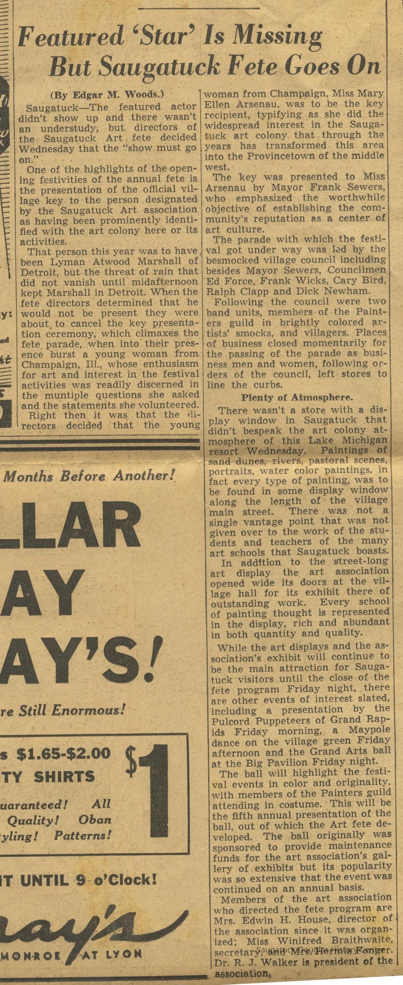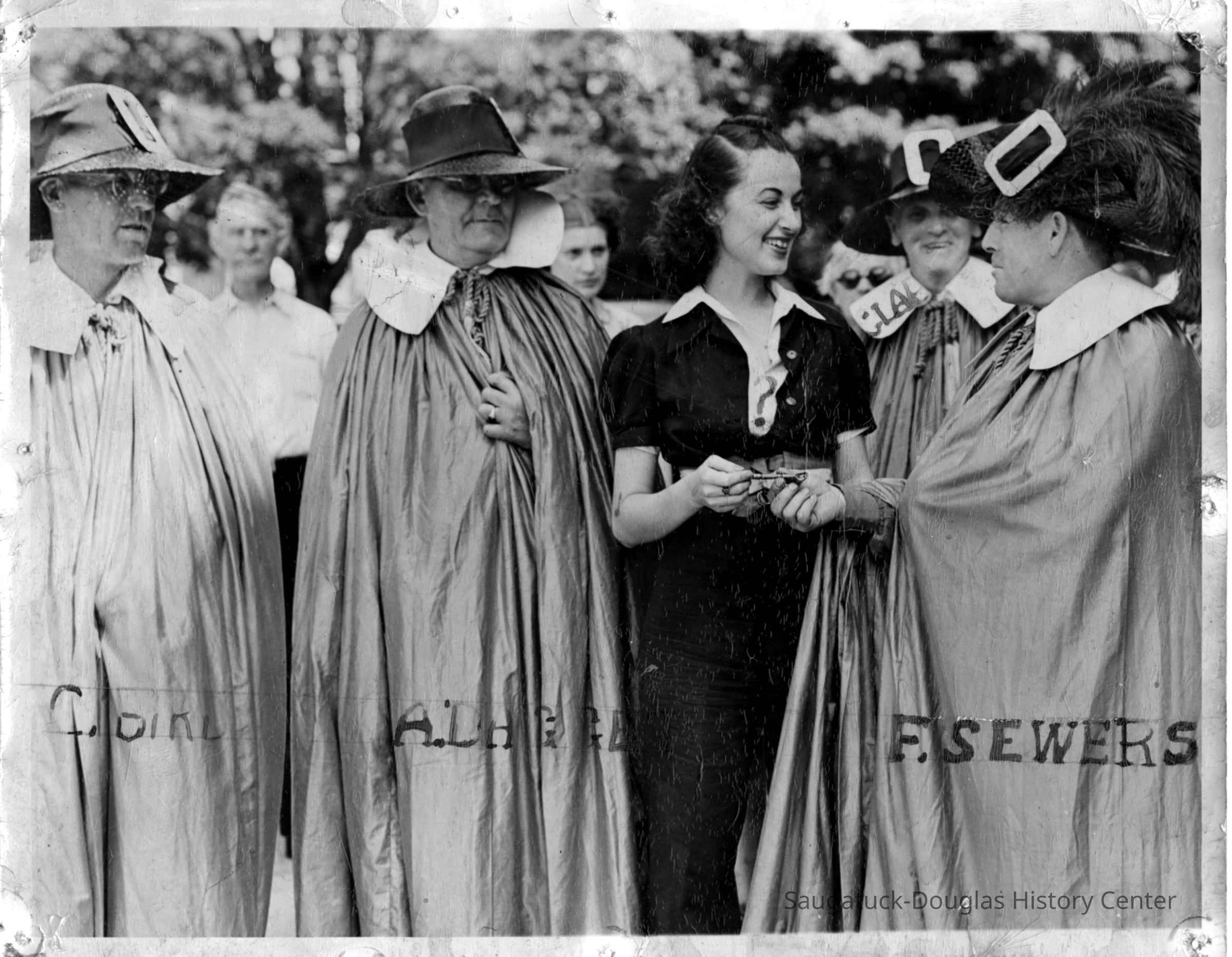 Two photographic prints of Saugatuck village leaders dressed in pilgrim or musketeer costumes that include broad-brimmed hats with plumes and oversize buckles, long cloaks with wide collars. Saugatuck president Frank Sewers is giving a village key to Mary Ellen Arsenau of Champaign, Illinois because the initially-intended recipient Lyman Atwood Marshall of Detroit was not present. Photo taken to promote the annual Arts Fete organized by the Saugatuck Art association.