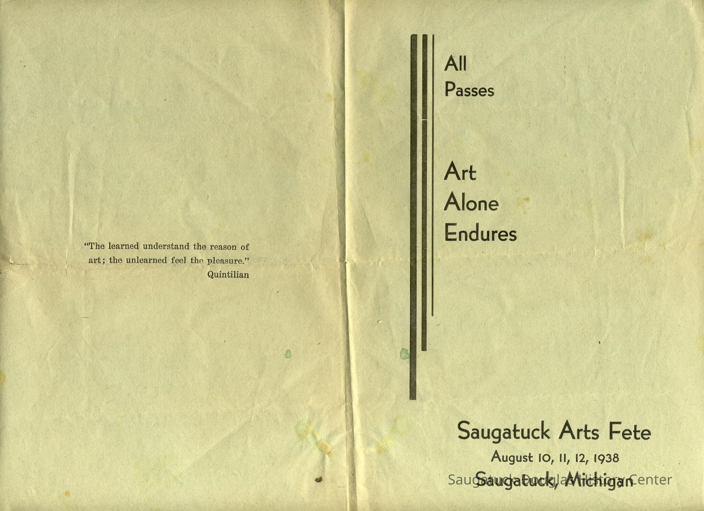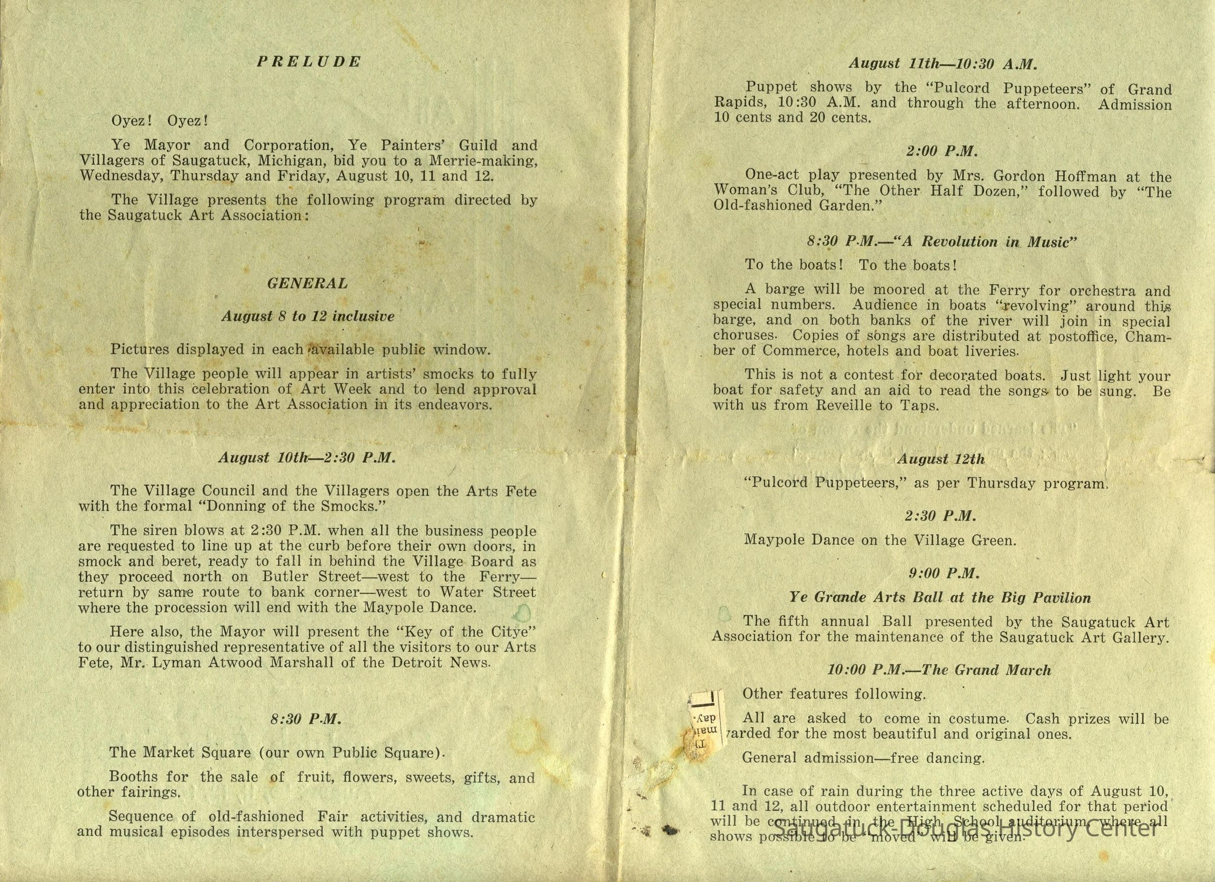 Scan of August 10-12, 1938 Saugatuck Arts Fete program that describes the "Donning of the Smocks," a parade, presentation of "Key of the Citye", a market square, puppet show by Pulcord Puppeteers, one-act play by Mrs. Gordon Hoffman aka Elizabeth Hoffman, an orchestra on a barge moored at the Ferry, a Maypole Dance on the Village Green, a ball at the Big Pavilion and a grand march of costumes.