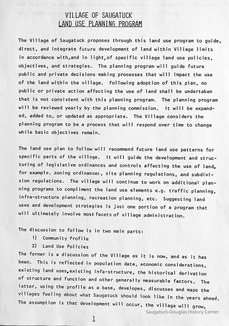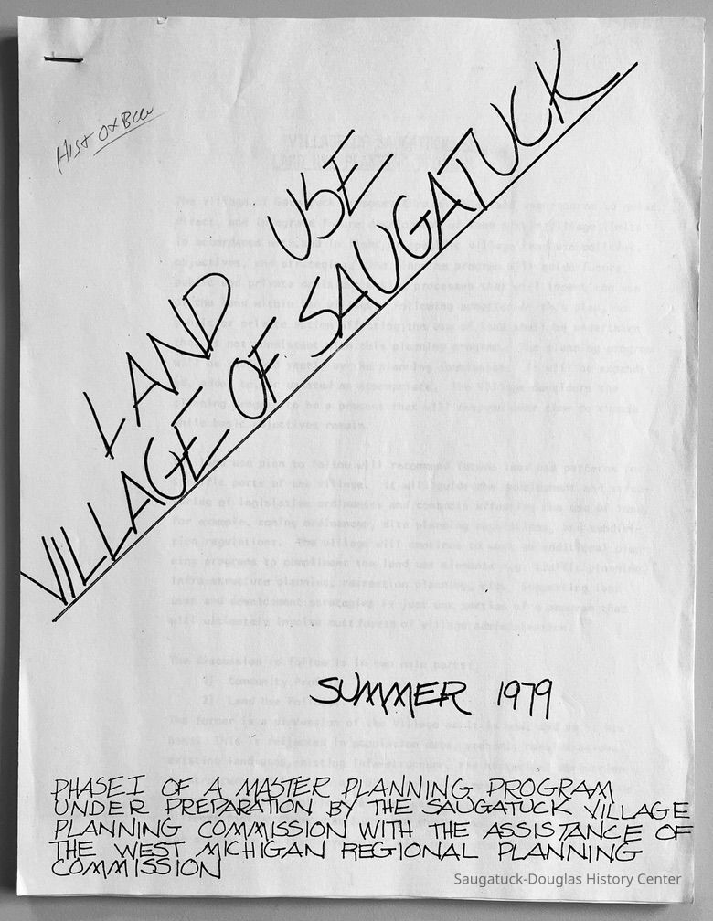 Land Use Village of Saugatuck Summer 1979, Phase 1 of a master planning program under preparation by the Saugatuck Village Planning Commission with the assistance of the West Michigan Regional Planning Commission.