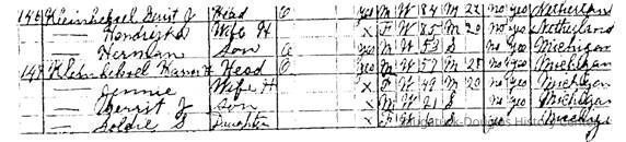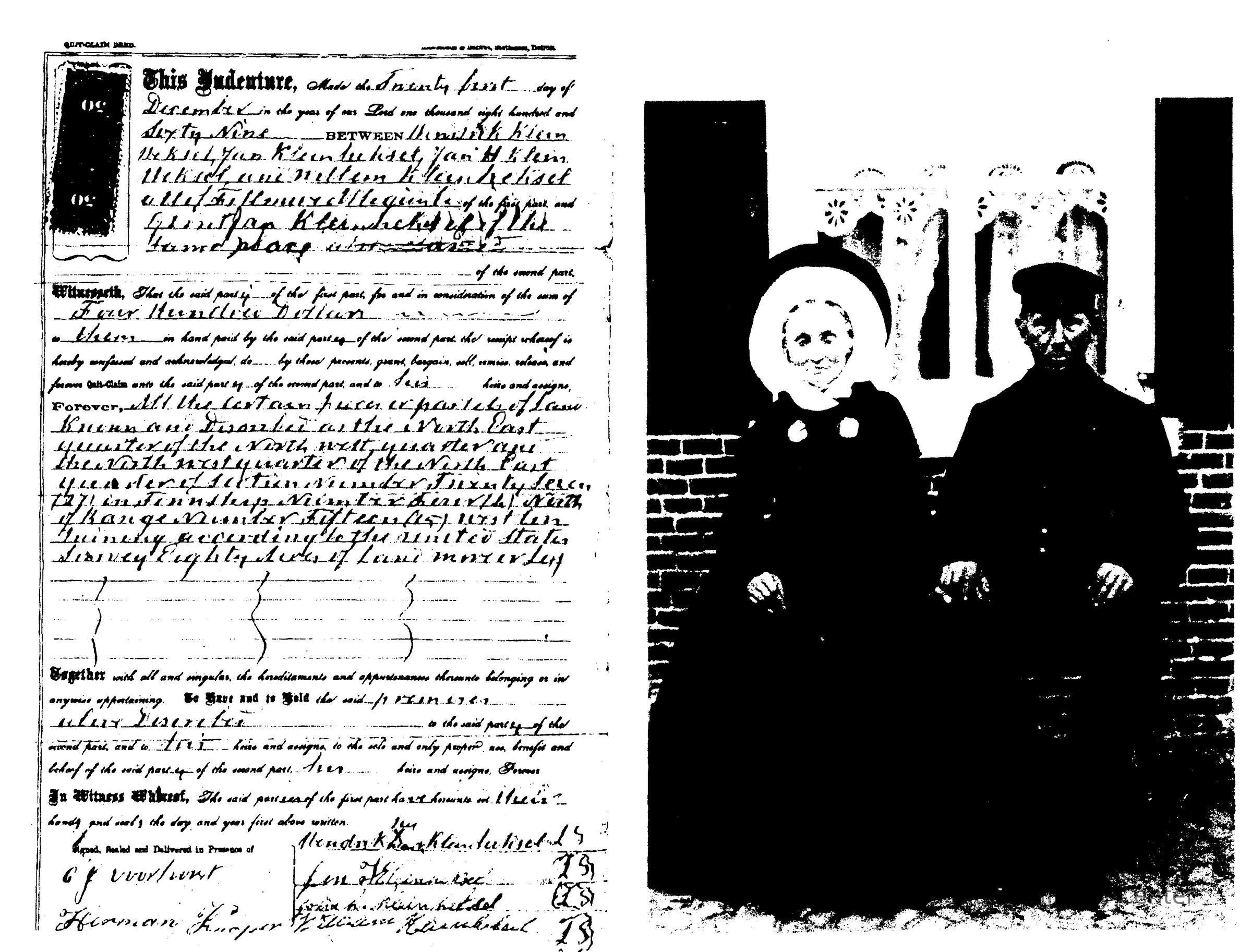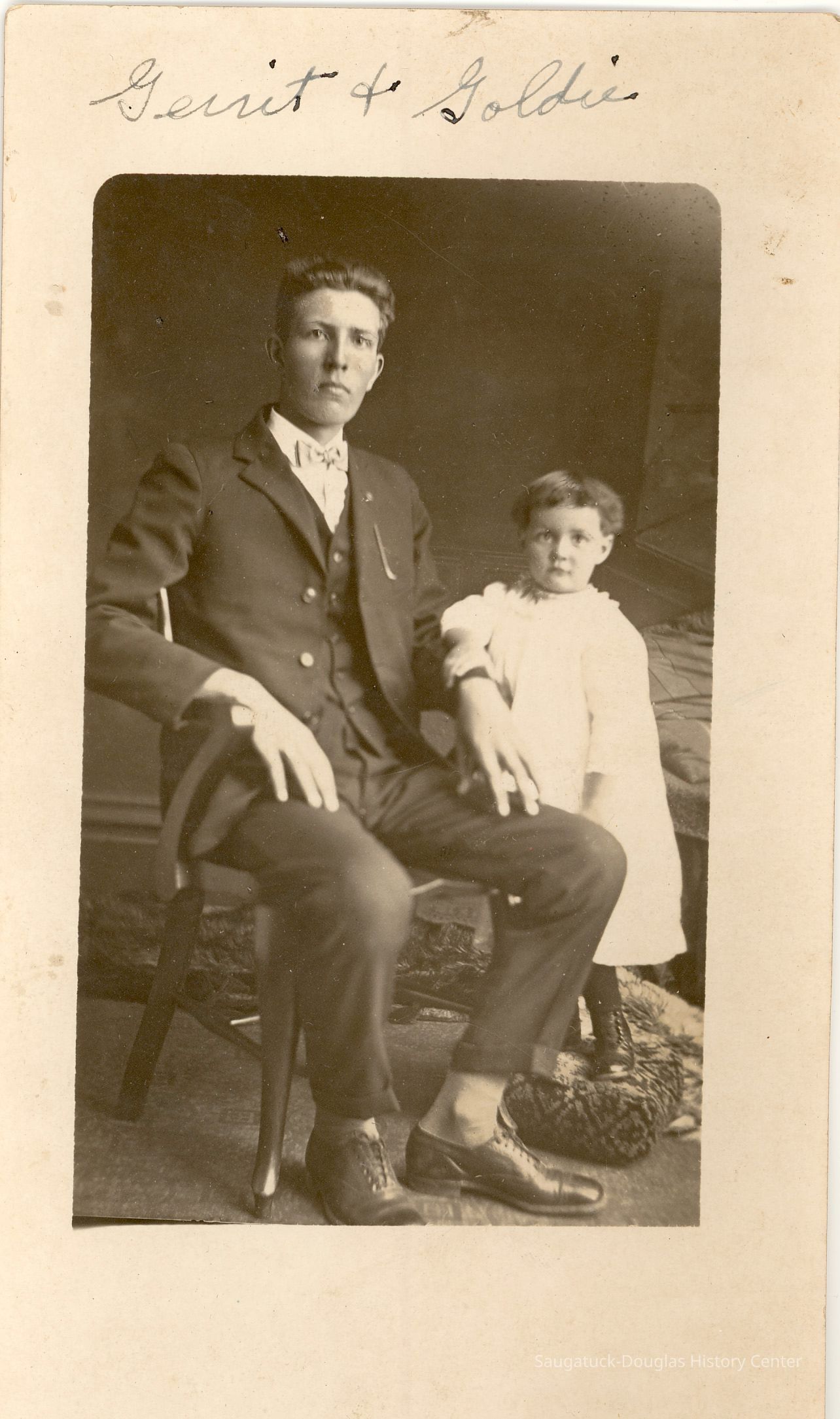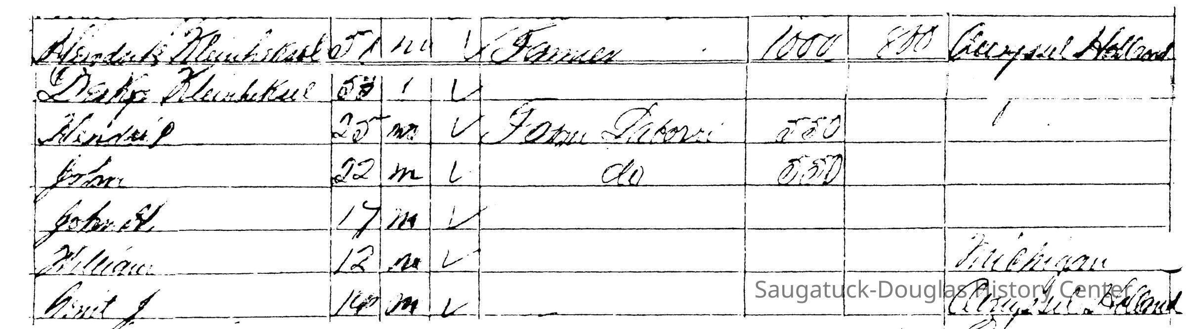 Goldie Kleinheksel was always interested in history. She lived her entire life in a small farmhouse on 140th Avenue in Fillmore Township, but in 1986 when an advertisement in Saugatuck's "Commercial Record" announced the formation of the Saugatuck-Douglas Historical Society she attended an early meeting and was a charter member. She rarely missed a meeting and was a volunteer at the museum when it was organized in 1994, enlivening the summer days by setting off the alarm in her attempts to disarm it at the beginning of a shift. When Goldie died in the fall of 2006, she provided in her will that the contents of her house go to the Historical Society. This contributed to the Society in two ways. First, it helped preserve the history of her family, early settlers in Overisel and later Fillmore townships, and, second, the antiques and other items in the house which had no direct connection to area history could be sold by the Historical Society to raise money for the museum, the recently purchased old schoolhouse in Douglas, and other Society projects. She even left instructions with the will's executor that the estate be responsible for transporting the items wherever the Society wanted them moved. From boxes of research here, and boxes of photos there, what follows is a brief, illustrated history of the Kleinheksel family. According to an old family genealogy the name was originally Kenning, but by order of the King of the Netherlands it was changed to Kleinheksel at some point before 1848 when Mannes Kleinheksel, his wife, Jane, and son, William, joined the Reverend Seine Bolks and others from the province of Overijsel, 152 in all, for a trip to the new world with a view to settling in Michigan. Hendrik Kleinheksel, brother of Mannes, is not listed among the official passengers on the original trip. His family may have followed later. According to family tradition they traveled by sailing ship and took nearly three months to cross the ocean. They landed in New York City and spent nearly a year in New York State before traveling up the Erie Canal to Buffalo, where they boarded a boat which took them around the Great Lakes to Grand Haven, and then by coastal steamer to the mouth of the Black River near Holland, Michigan. Although the Reverend A. C. Van Raalte and others in Holland, who had arrived the previous year, aided the new settlers, the newcomers decided to move south and west in Allegan County. An 1 880 history reports that the Hendrik Kleinheksel family was the first to settle in what would become Overisel. The men had built a rude structure to live in during the week, while they were building homes. On weekends they would rejoin their families boarding in Graafschap and Holland. Hendrik and family moved into the rude structure, or "tavern" as it was called to assist with provision for the workers, and became the first settlers. It was here their son, William, was born.
