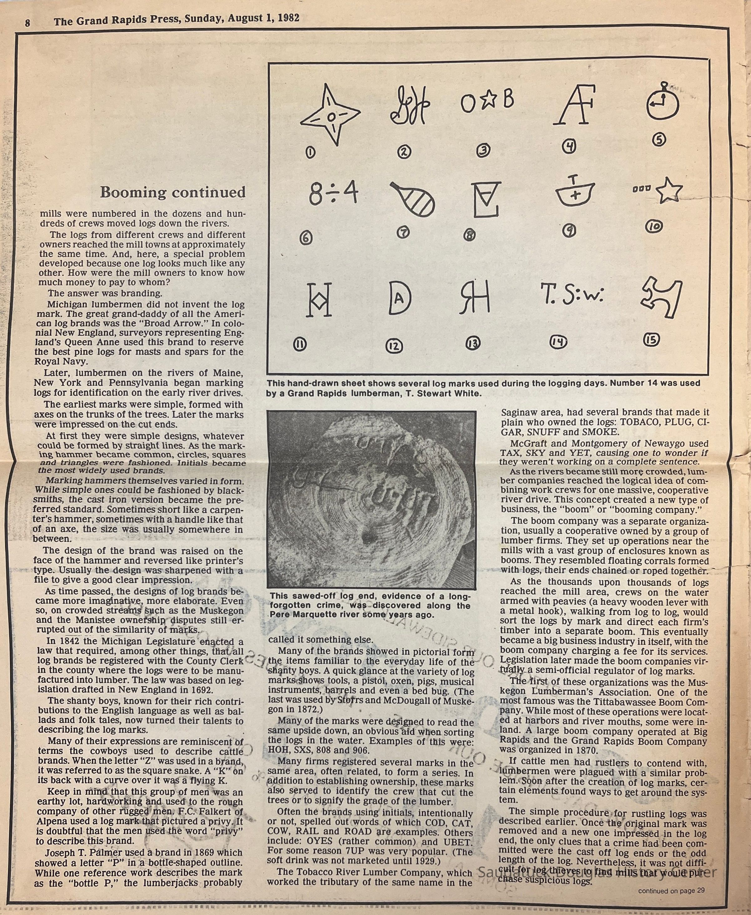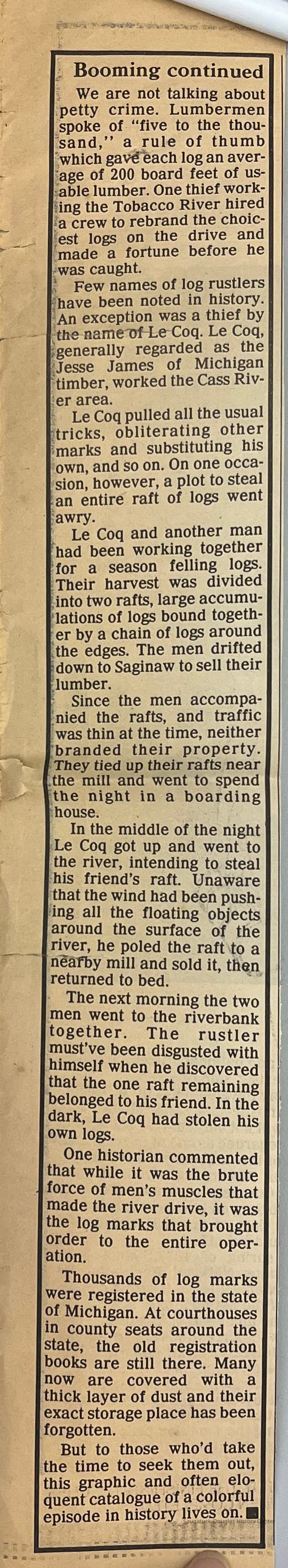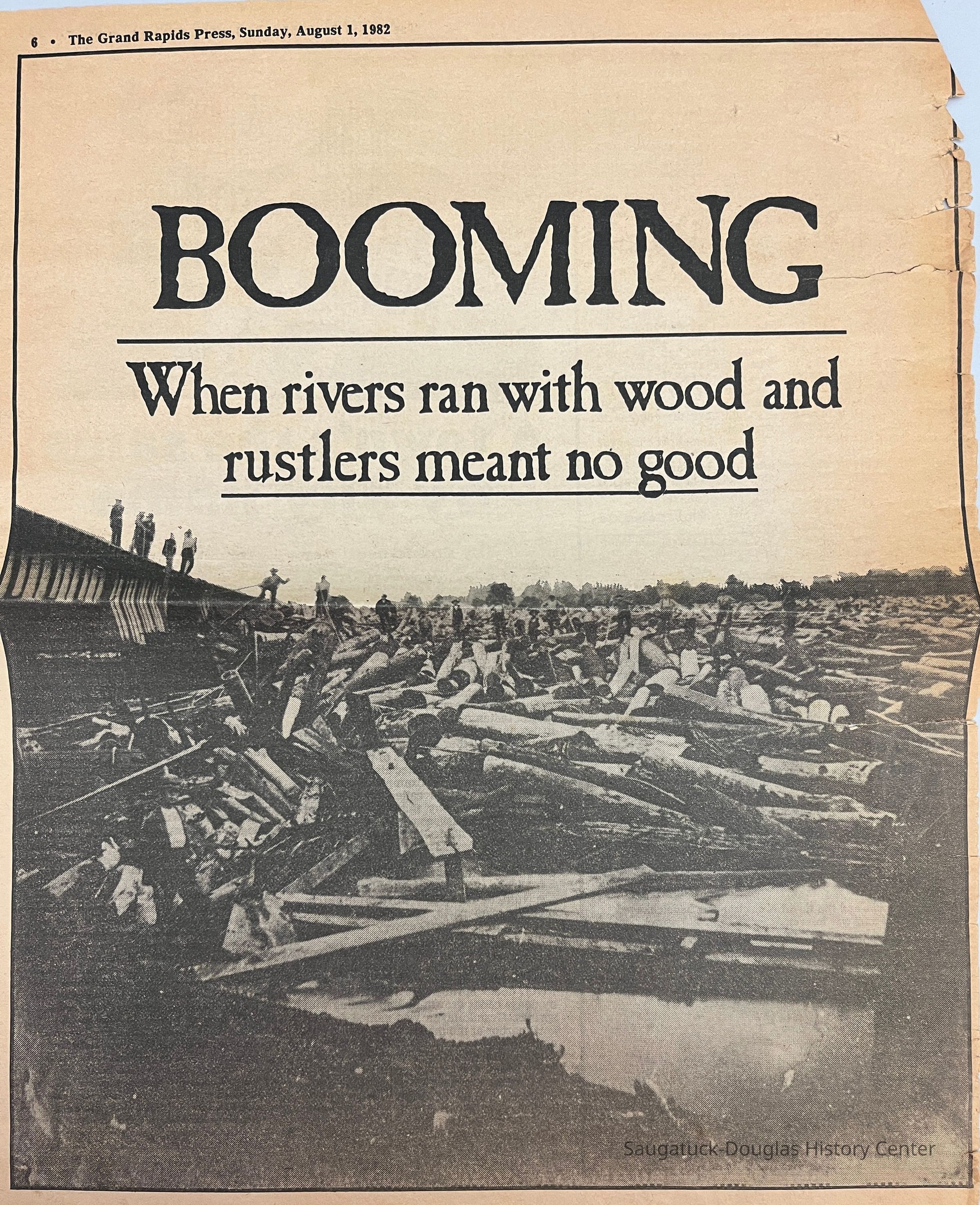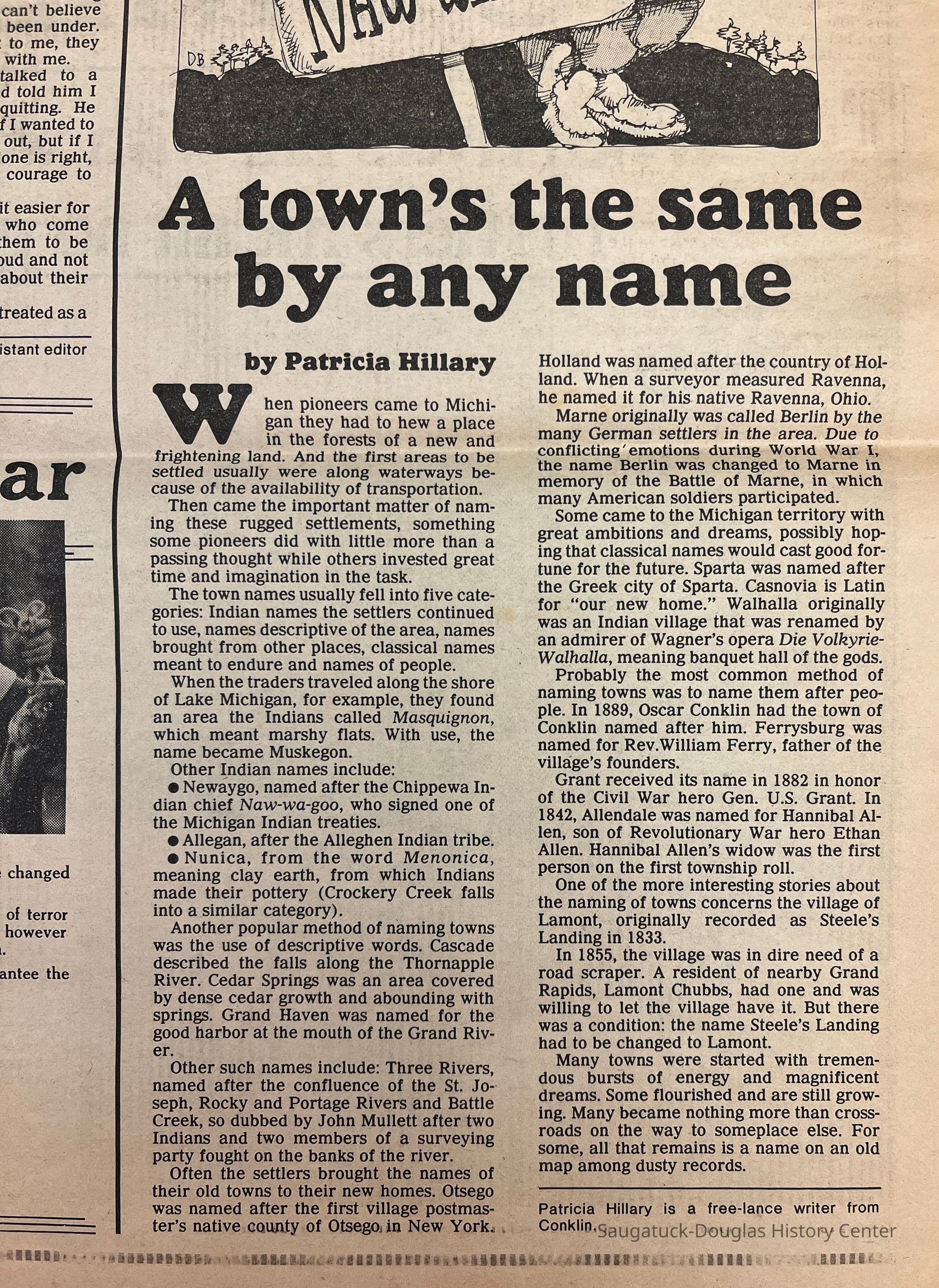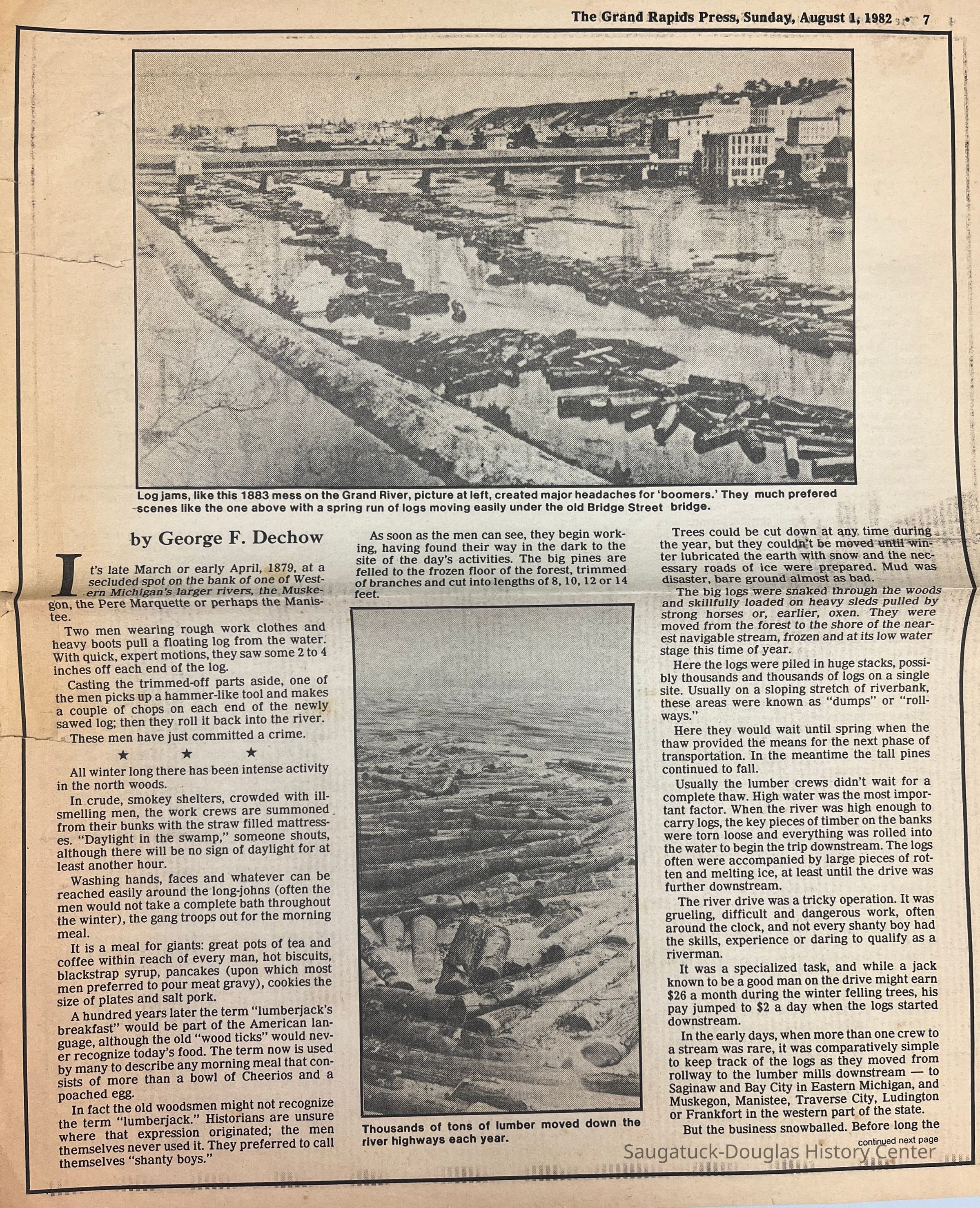 Two tabloid pages clipped from the Grand Rapids Press with an article about the lumbering or logging era. Also an article titled "A town's the same by any name" by Patricia Hillary about the roots of some Michigan town's names. [For example, Allegan is claimed to be named after the Alleghen Indian tribe.]