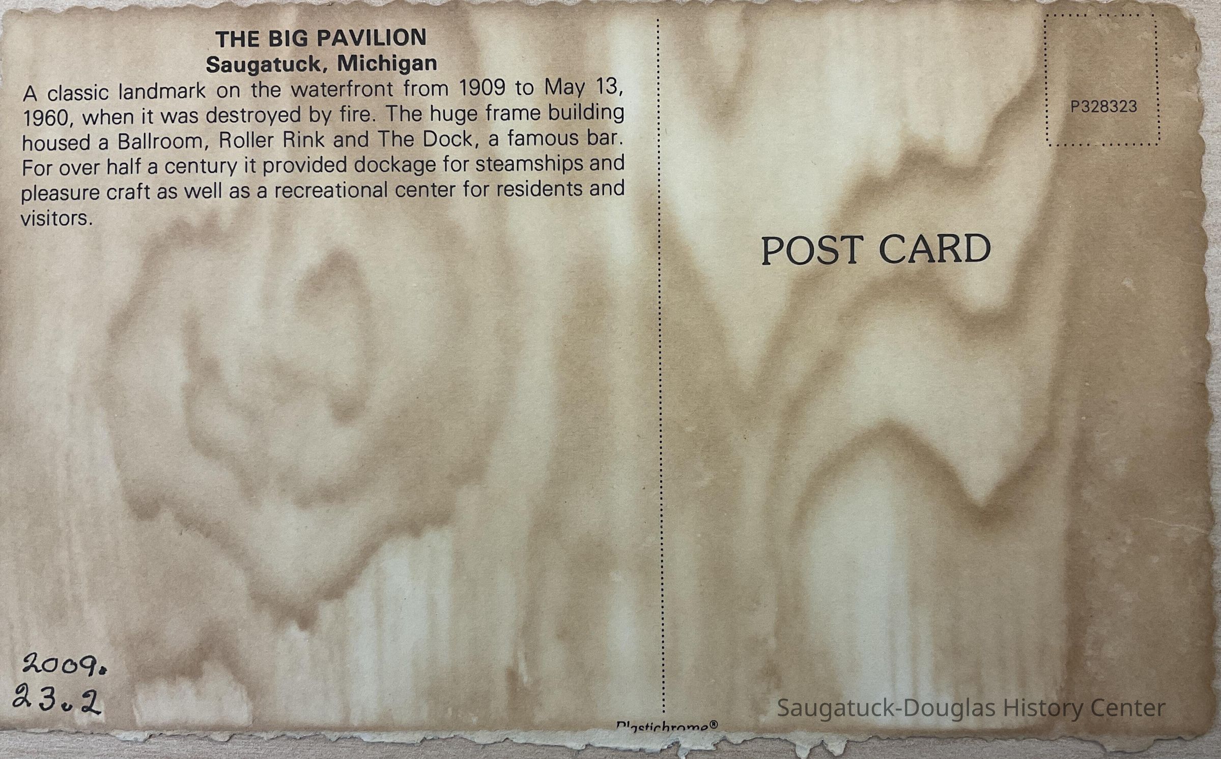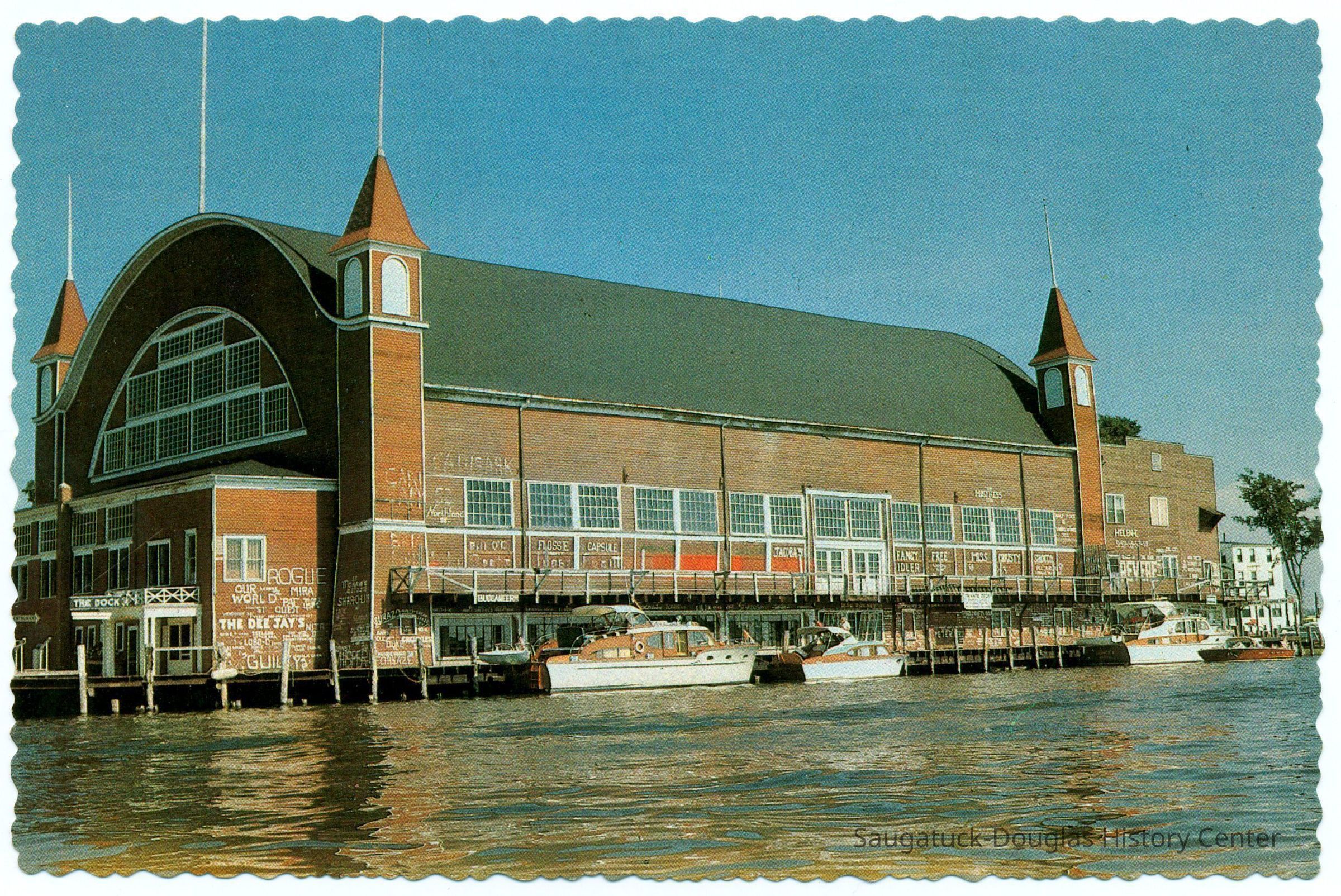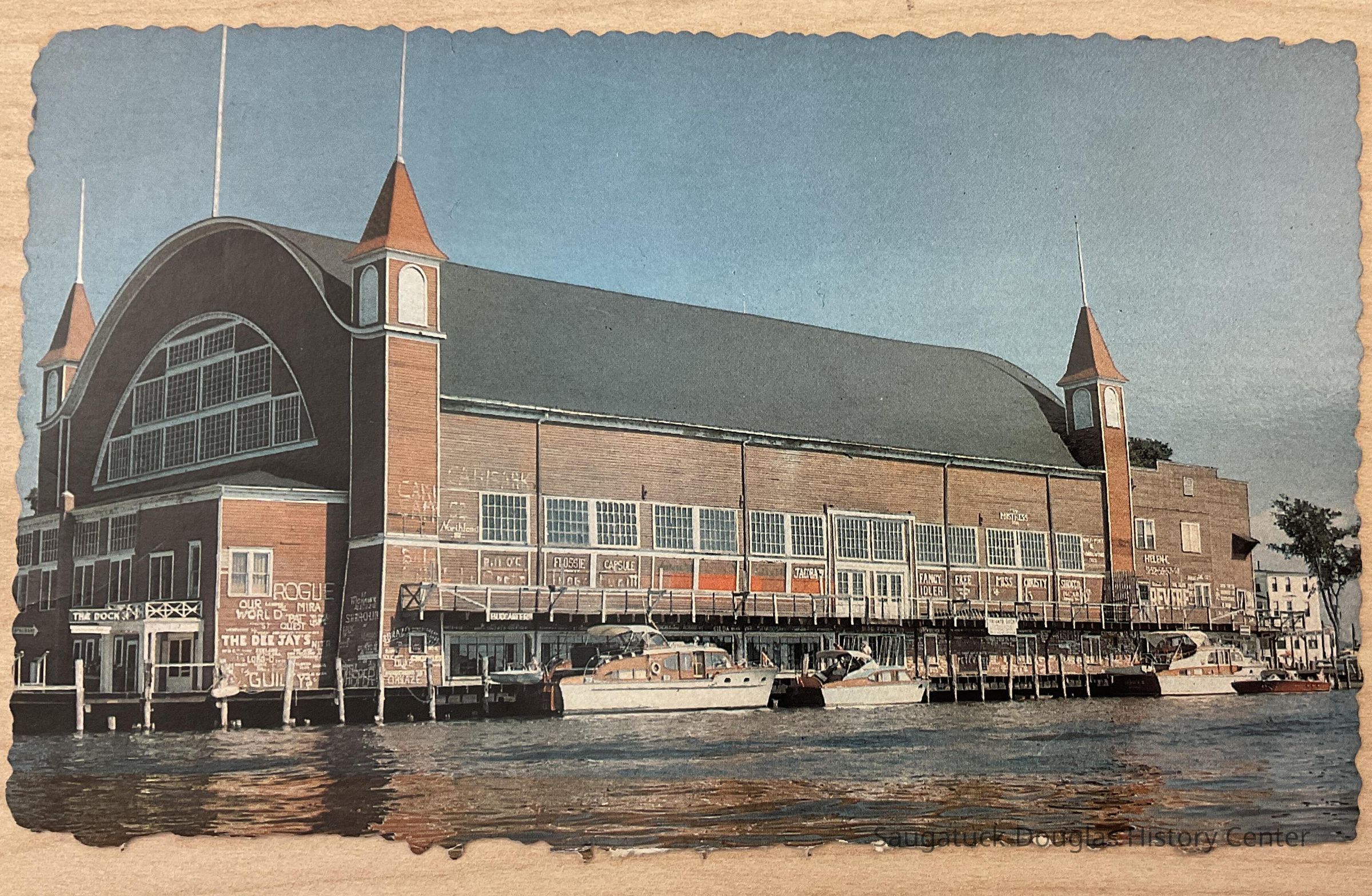 Caption on reverse side: A classic landmark on the waterfront from 1909 to may 13, 1960. when it was destroyed by fire. The huge frame building housed a Ballroom, Roller Rink and the Dock, a famous bar. For over half a century it provided dockage for steamships and pleasure craft as well as a recreational center for residents and visitors.