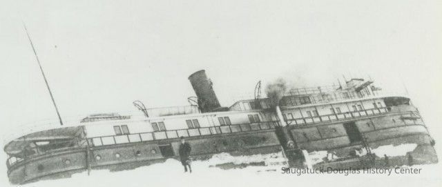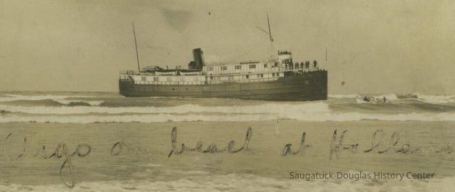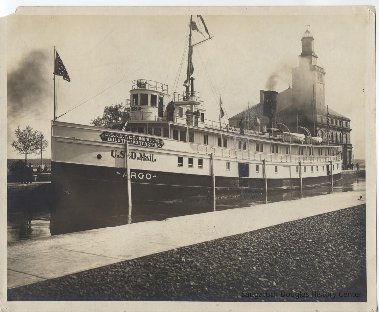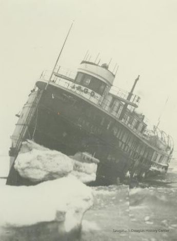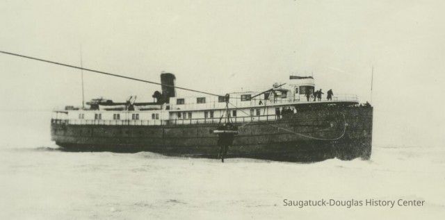 from https://www.michiganshipwrecks.org/shipwrecks-2/shipwreck-categories/surf-zone-shipwrecks-lost-and-found/argo The wreck of the nearly new steamer Argo is one of the best–remembered shipwrecks of the Holland, Michigan area, even though the ship ultimately was pulled off the bar, repaired and sailed for another 35 years. Built of steel, the Argo was 173 feet in length and 32 feet wide. Had she been constructed of wood, this probably would have been her last voyage. She was built in 1901 by the Craig Shipbuilding Company of Toledo, Ohio, as a passenger and package-freight steamship. Argo in ice - 1905The Argo operated between Chicago and Holland and built a reputation, while under the Graham and Morton flag, of not varying more than 10 minutes from her schedule during her runs across Lake Michigan in any kind of weather. In 1903, she was one of three G&M ships to operate the cross-lake route, along with the Puritan and the Soo City. On the morning of Friday, November 24, 1905, a severe southwest storm developed with 65 mile-per-hour winds. While attempting to enter the Holland harbor near dawn, the Argo slipped into the trough of the waves, hit bottom on the notorious sand bars and opened a seam. She sank in relatively shallow water. In its November 30, 1905 edition, the Holland City News reported: “The Graham & Morton steel steamer Argo, Captain John Steward in command, with 23 passengers aboard, carrying a crew of 32 men, and well laden with freight, was driven ashore north of the north pier at Holland harbor Friday morning during a terrific southwest gale. The passengers and some of the crew were taken ashore in the breeches buoy by the life-saving crew.” On December 28, a full month after the wrecking, the Holland City News reported: “The persistent battering of the waves has raised such a fortification of sand around the Argo that the men of the Great Lakes Dredge & Dock Company decided last week that it was useless to continue the attempt to release her. “So far the Argo has been a considerable bill of expense, but steamers in worse predicaments have been saved and work on the Argo will not be stopped until a much heavier strain is put on the pocketbook.” The Argo reportedly began to break up after several of these salvage attempts failed. Finally, on January 27, 1906, she was re-floated by the Reid Wrecking Company. It was reported that her hull was “not damaged to any great extent.” The Reid Company received $10,000 for releasing the steamer from the bar. On February 15, 1905, she was reported under repair in Manitowoc, Wisconsin. Text from “For Those in Peril: Shipwrecks of Ottawa County, Michigan” by Craig Rich,.