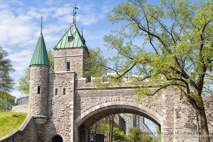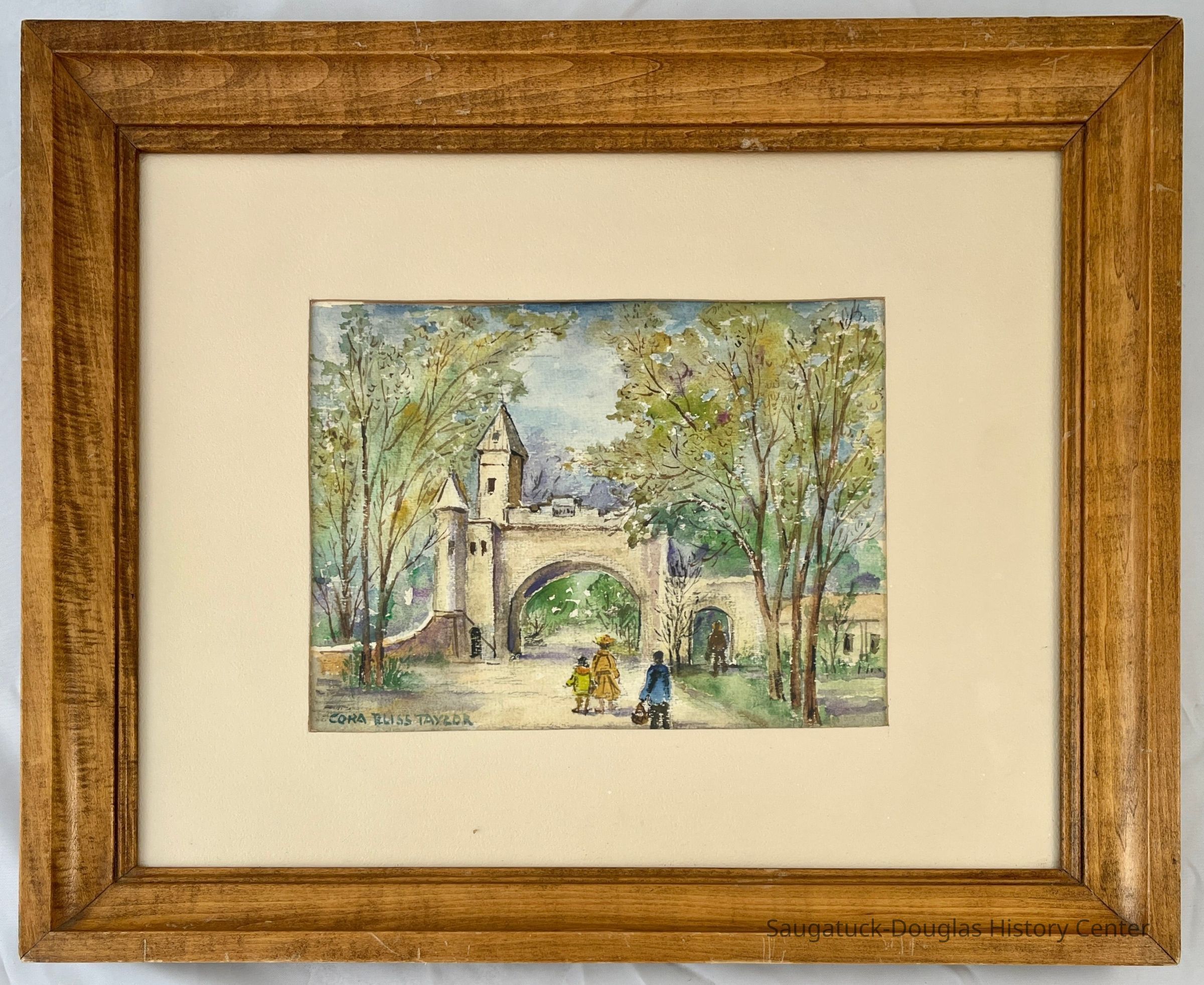 Watercolor painting of people strolling along a wooded lane toward a white, turreted gate, possibly the Kent Gate in Quebec City.