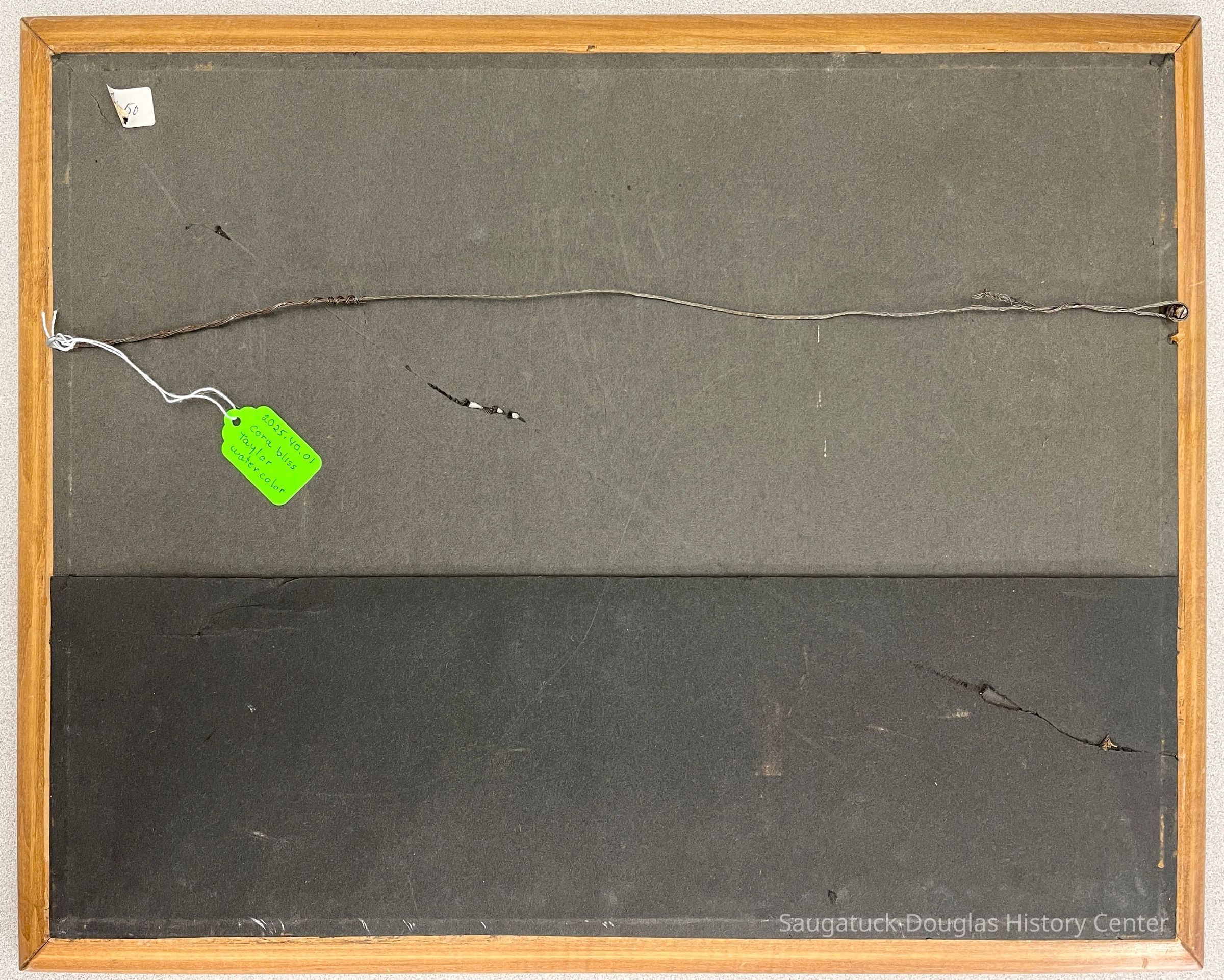 On the back of the brown wood frame is a black paper pocket [empty] and a label that reads "$650" of unknown origin. The painting is behind glass.