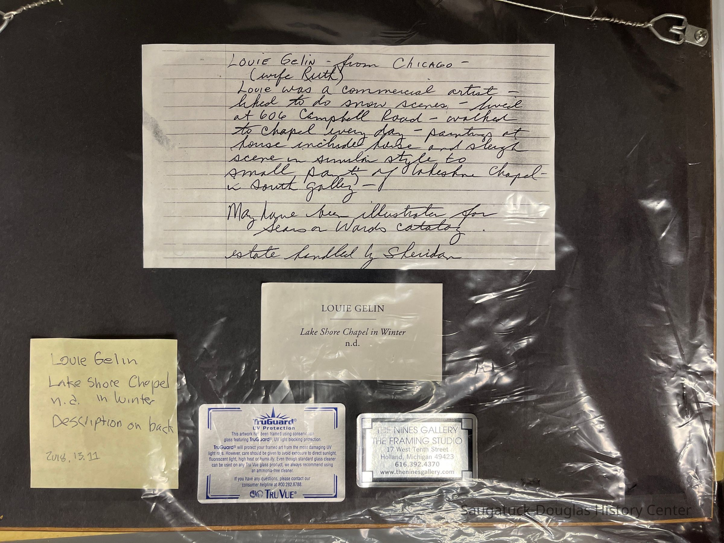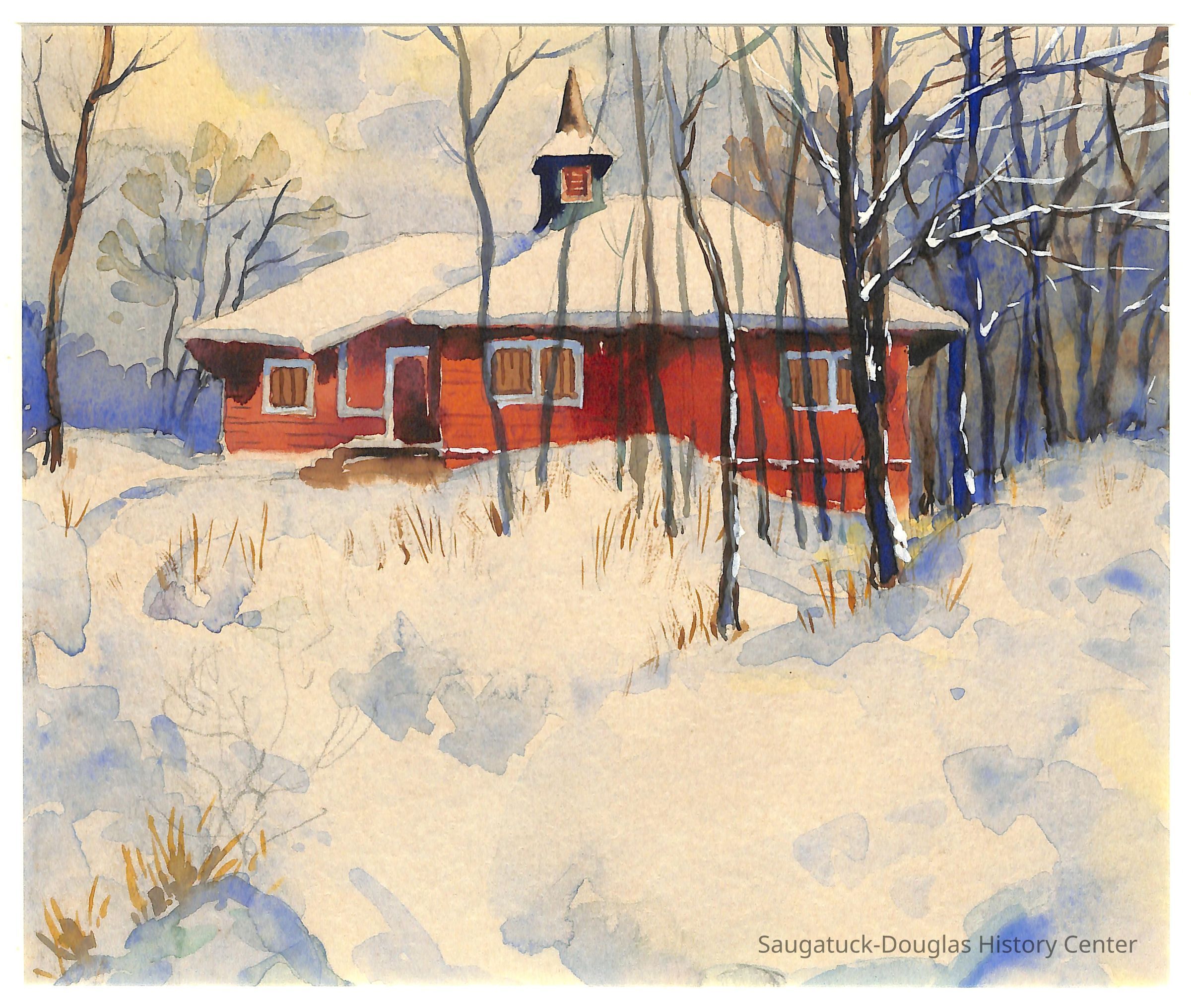 From “Keeping an Eye on History” at the OSH 2018 Lakeshore Chapel in Winter Louie Gelin watercolor, no date the story | It is said that this summertime chapel (1904), at Campbell Road and Lakeshore Drive, was invented at a businessman’s lunch meeting at the coffee shop of Marshal Field’s department store in Chicago. Architect Harry Walker, a student of Frank Lloyd Wright, provided its simple design in the Arts & Crafts manner. Lore also has it that funding for the building was begun by penny collections made by Sunday School students. Lakeshore Chapel is listed on the National Register of Historic Places. the artist | Louie Gelin (1896-1972), born in New York, worked as a commercial artist in advertising in Chicago and later moved to Saugatuck. SDHC Collection, gift of Kenneth R. Carls and James A. Schmiechen Accession number 2018.13.11