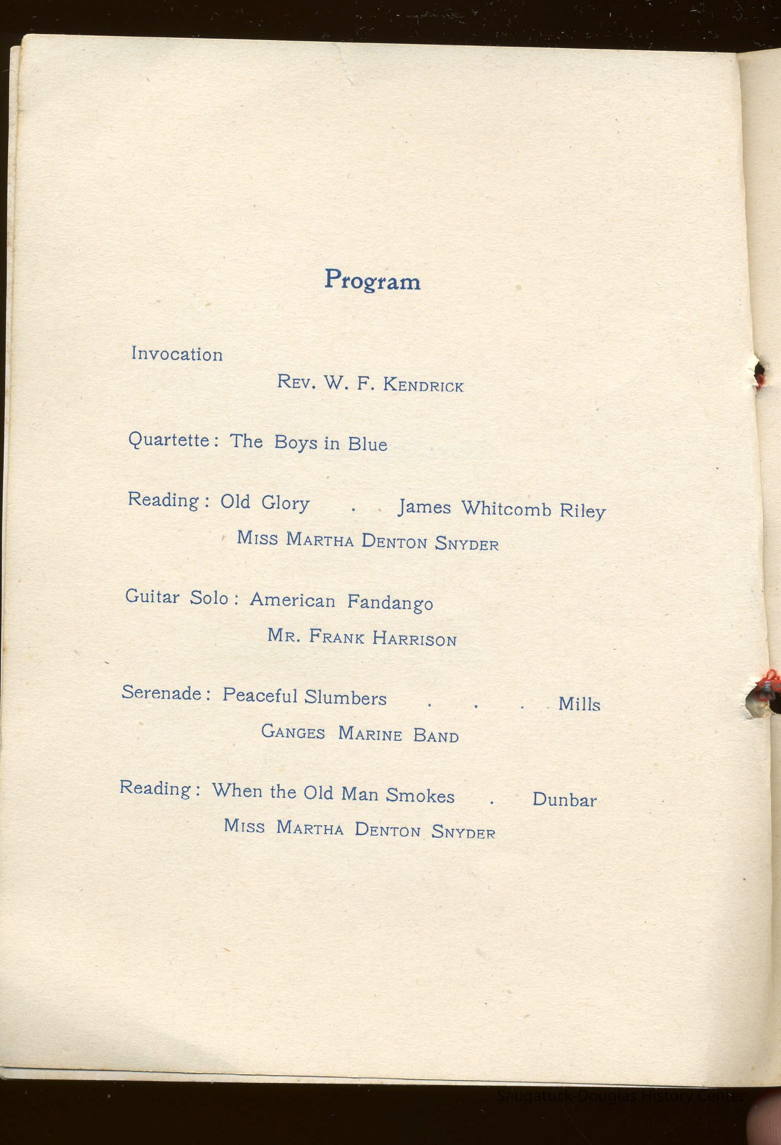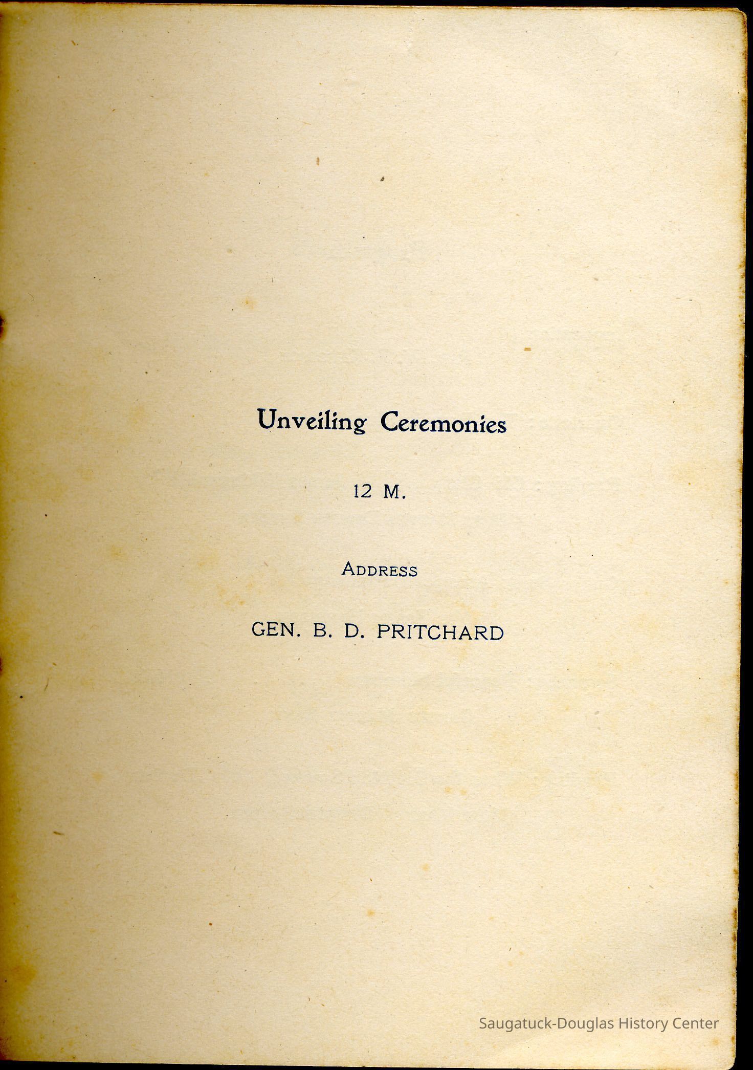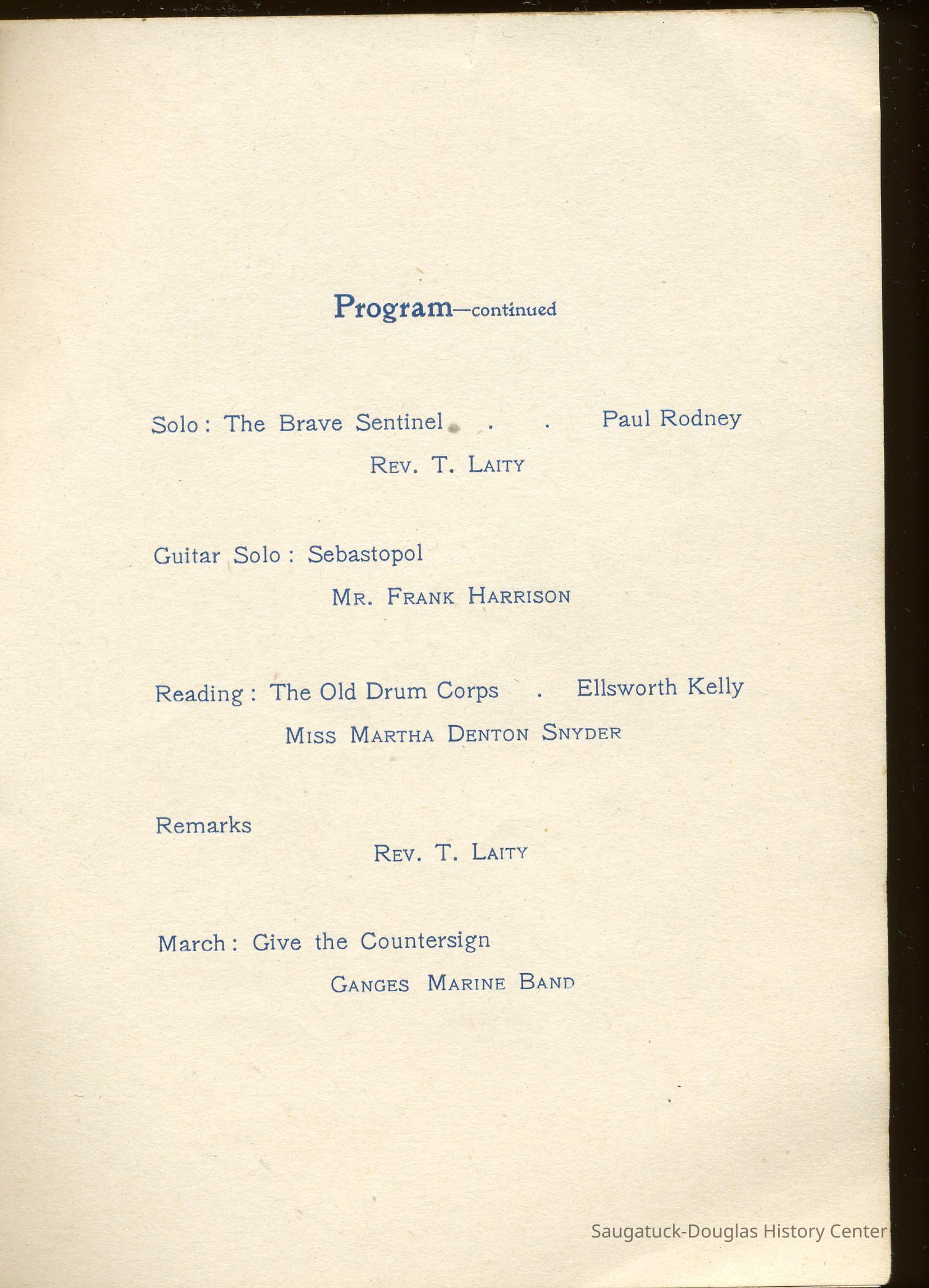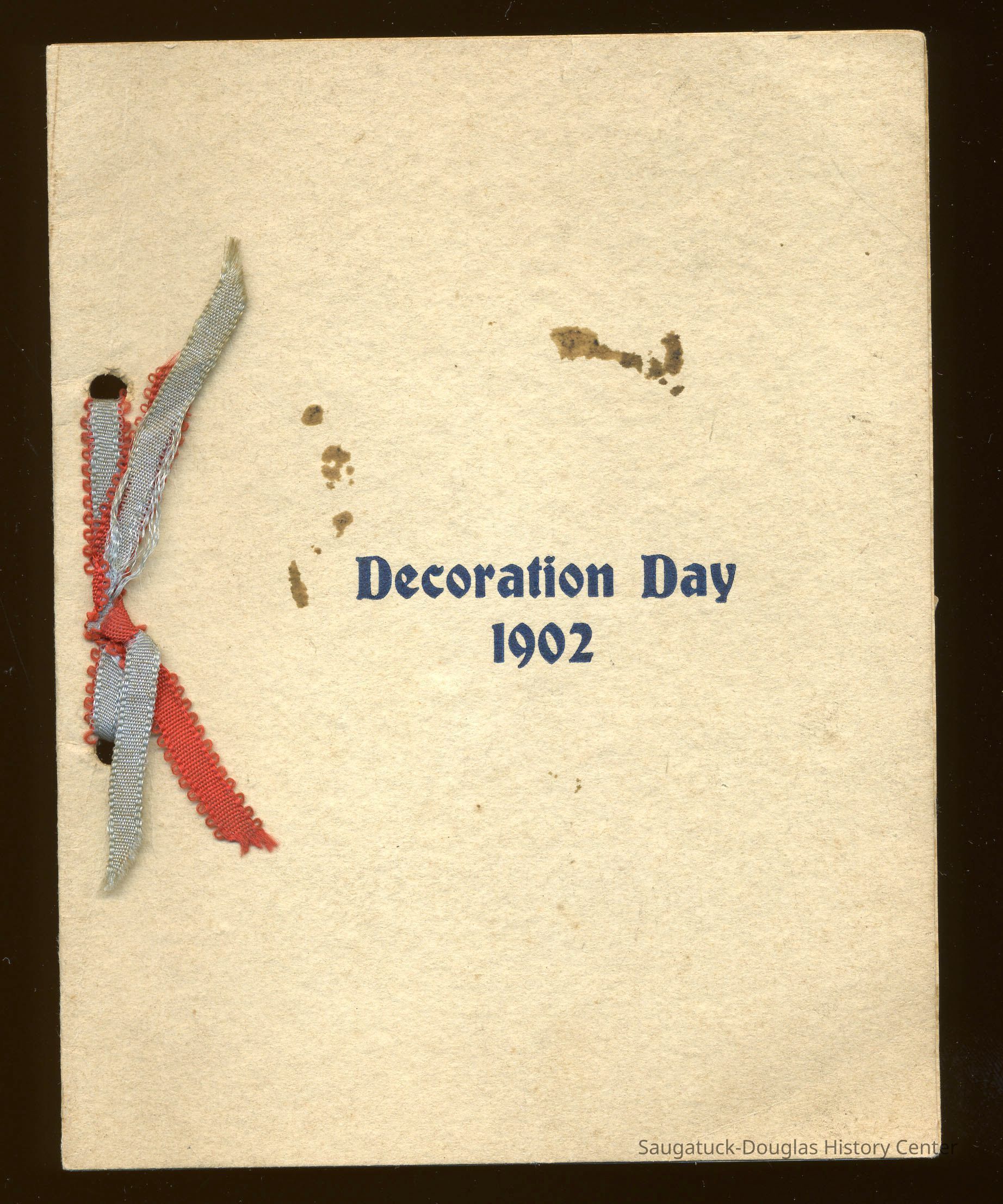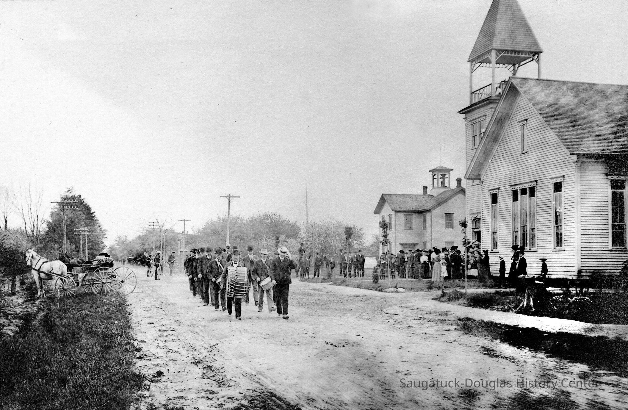 REMEMBERING THE CIVIL WAR With so many Civil War veterans in Ganges Township, Memorial Day (first called Decoration Day because it was the day the graves were decorated with flowers) was always celebrated with enthusiasm. Treva (Miller) McKeown, whose grandfather, Adam Miller, was both a Civil War veteran and a member of the Ganges band, wrote: “About the years 1906 to 1912 Civil War veterans were guests of honor at the Memorial Day services at the Ganges Methodist Church. After the benediction and tributes to those tired old men. and a program of local talent, including the reading of the “Gettysburg Address,” all who cared to “marched” to the Taylor Cemetery. On one such occasion that I remember vividly Major W. H. Dunn, a veteran cavalry officer, decided to ride a horse in the procession. As the assemblage was being organized, Major Dunn rode up on a fine looking well-groomed horse. Everything went well until the horse became excited and thrashed about and became unruly. For a few minutes much concern was felt for the elderly rider, and all those standing nearby, but with the good horsemanship of Major Dunn, and the aid of several men, the horse was quieted down. The procession finally started with the accompaniment of our local Fife and Drum Corps, consisting of George Gaze on the fife, Marion Pressler on the bass drum and my father, Bertrand Miller, on the snare drum. After reaching the cemetery the children placed the lilac and snowball bouquets on the graves of veterans.” By Kit Lane