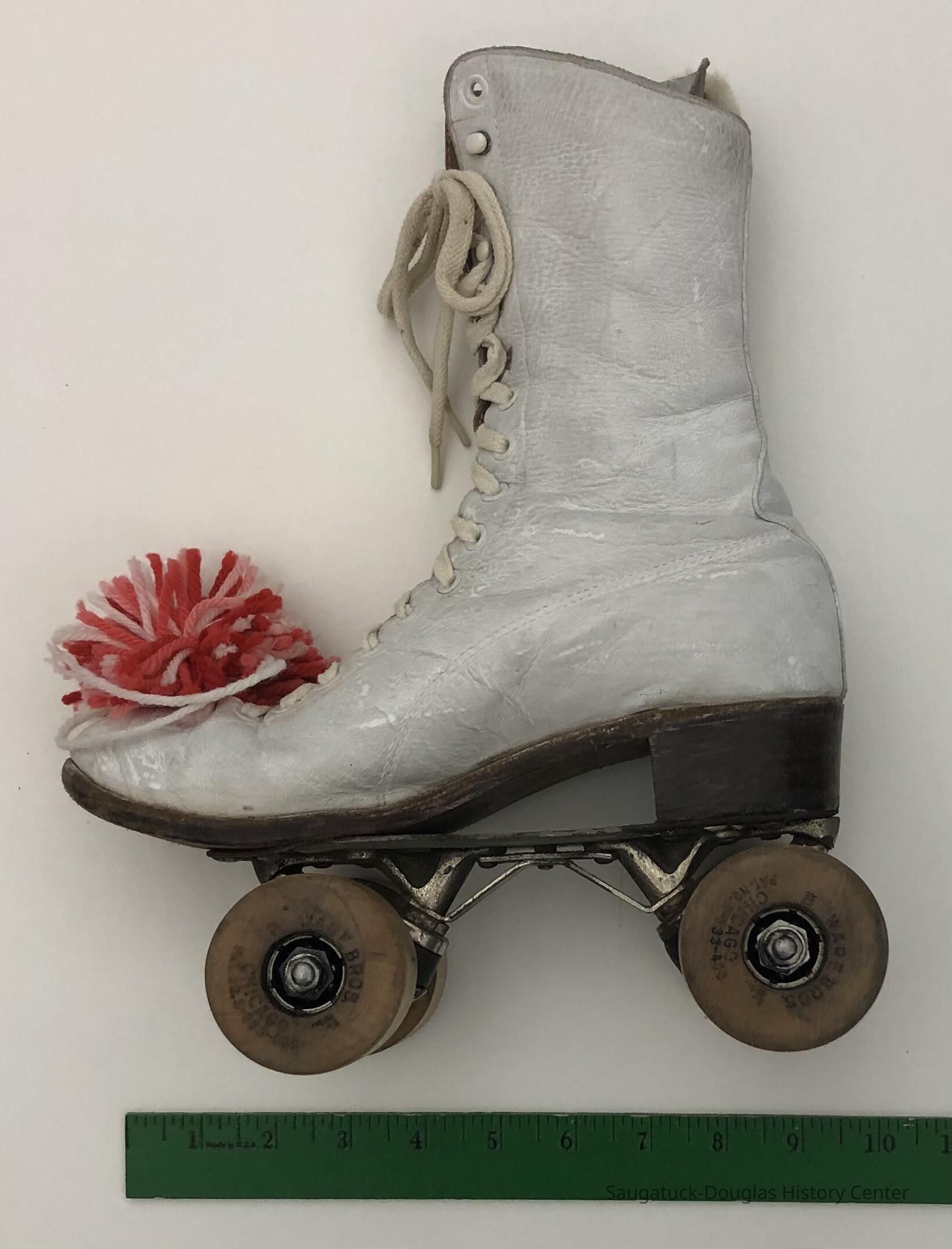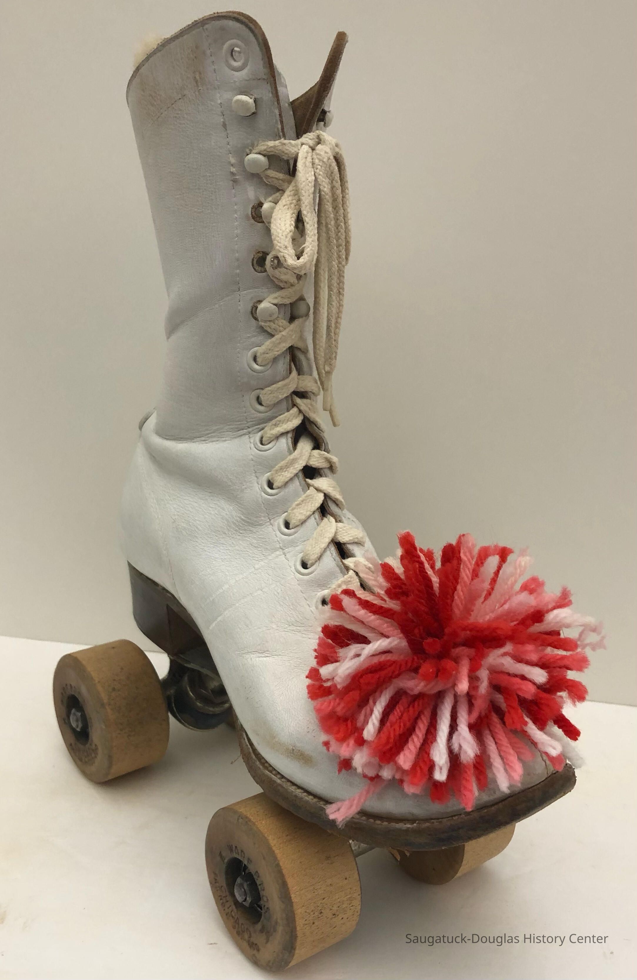 White leather women’s hightop roller skate with wood wheels. The skate has a red, white and pink yarn tassel on the toe.