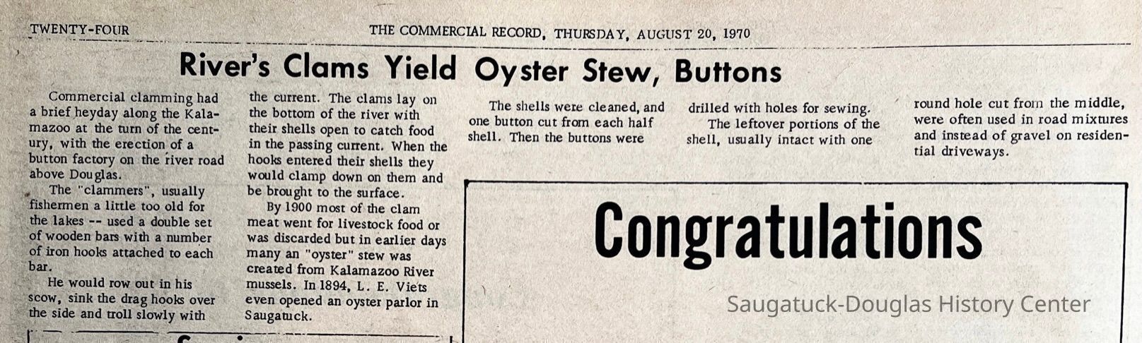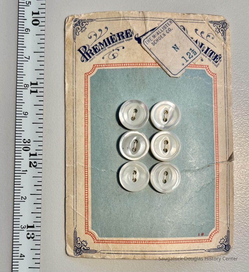Clamming the Kalamazoo to supply the button-production industry. Sewing buttons on to cards was a form of piece work often done in the home to generate extra income. The Holland newspaper reported on July 7, 1910, "Quite an industry in gathering of clam shells up the Kalamazoo River in Saugatuck is being established. The shells bring something like $16.00* per ton in the Detroit market, where they are manufactured into pearl buttons and other useful ornamental articles for the general market. A number of valuable pearls have also been obtained." *$16 was the equivalent of $522 in 2024 dollars
