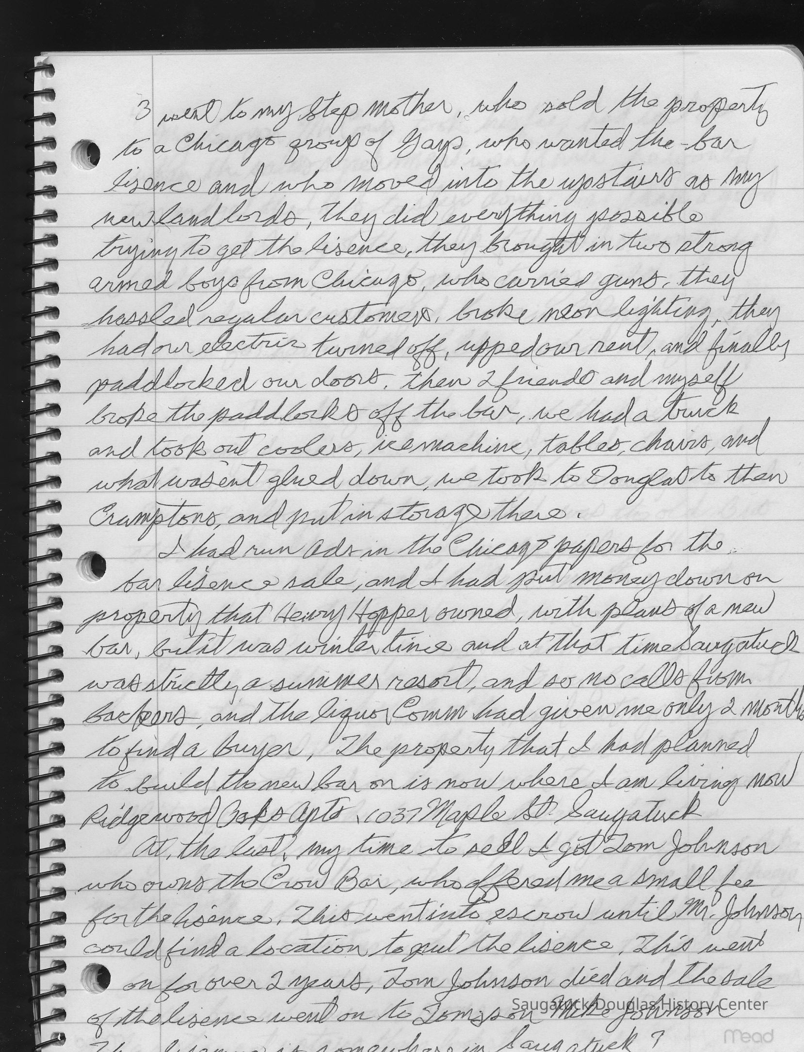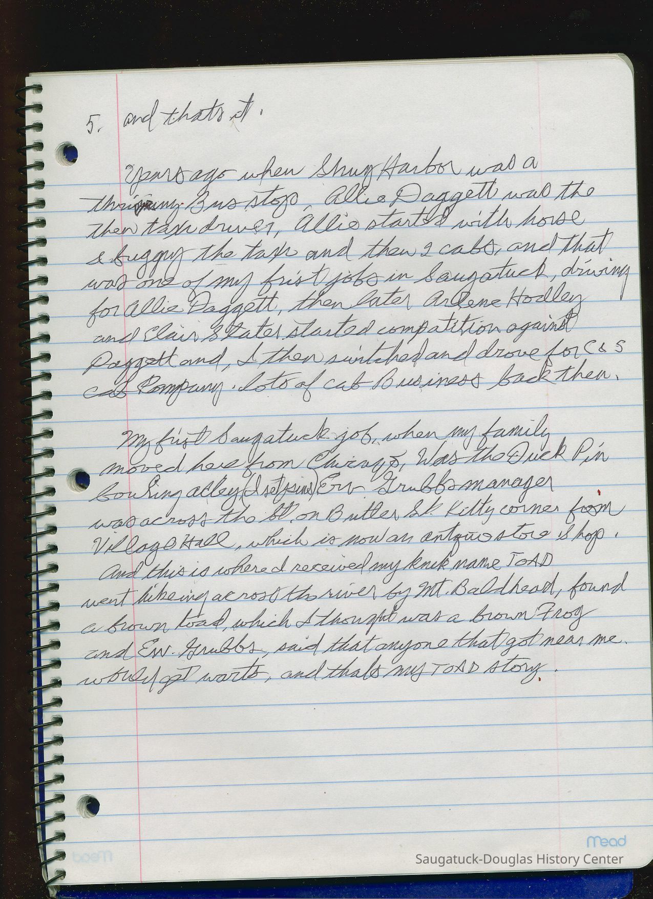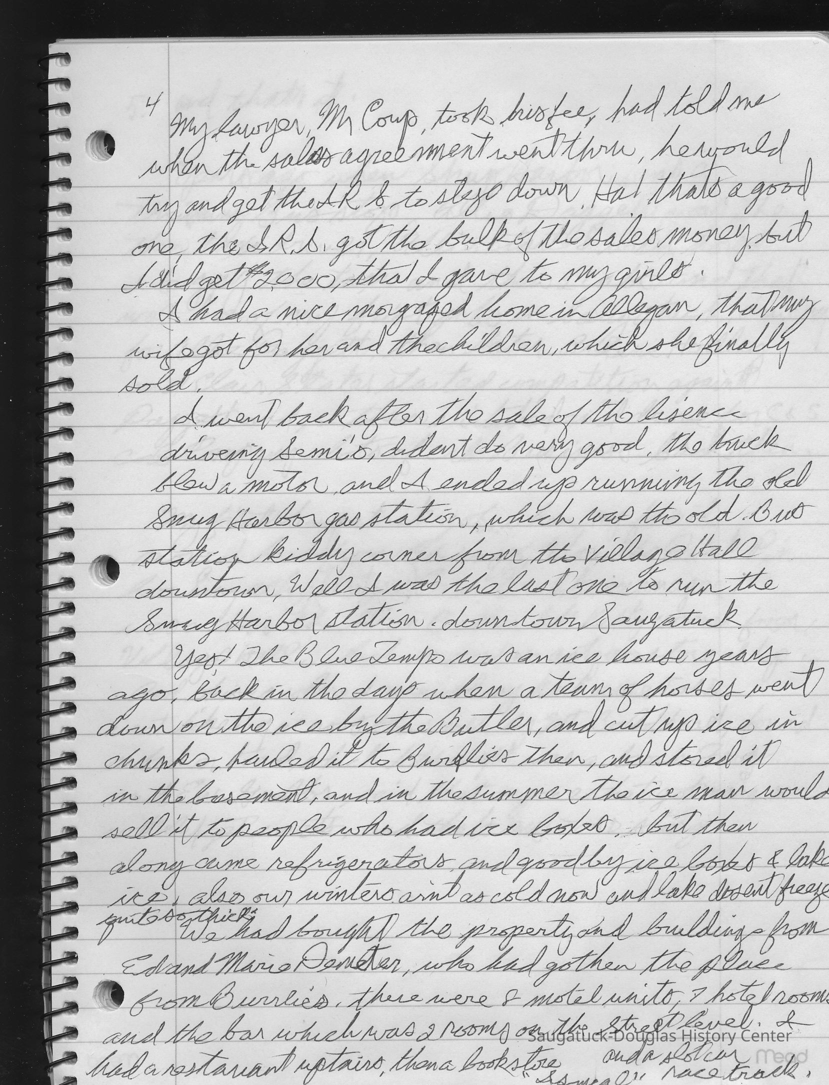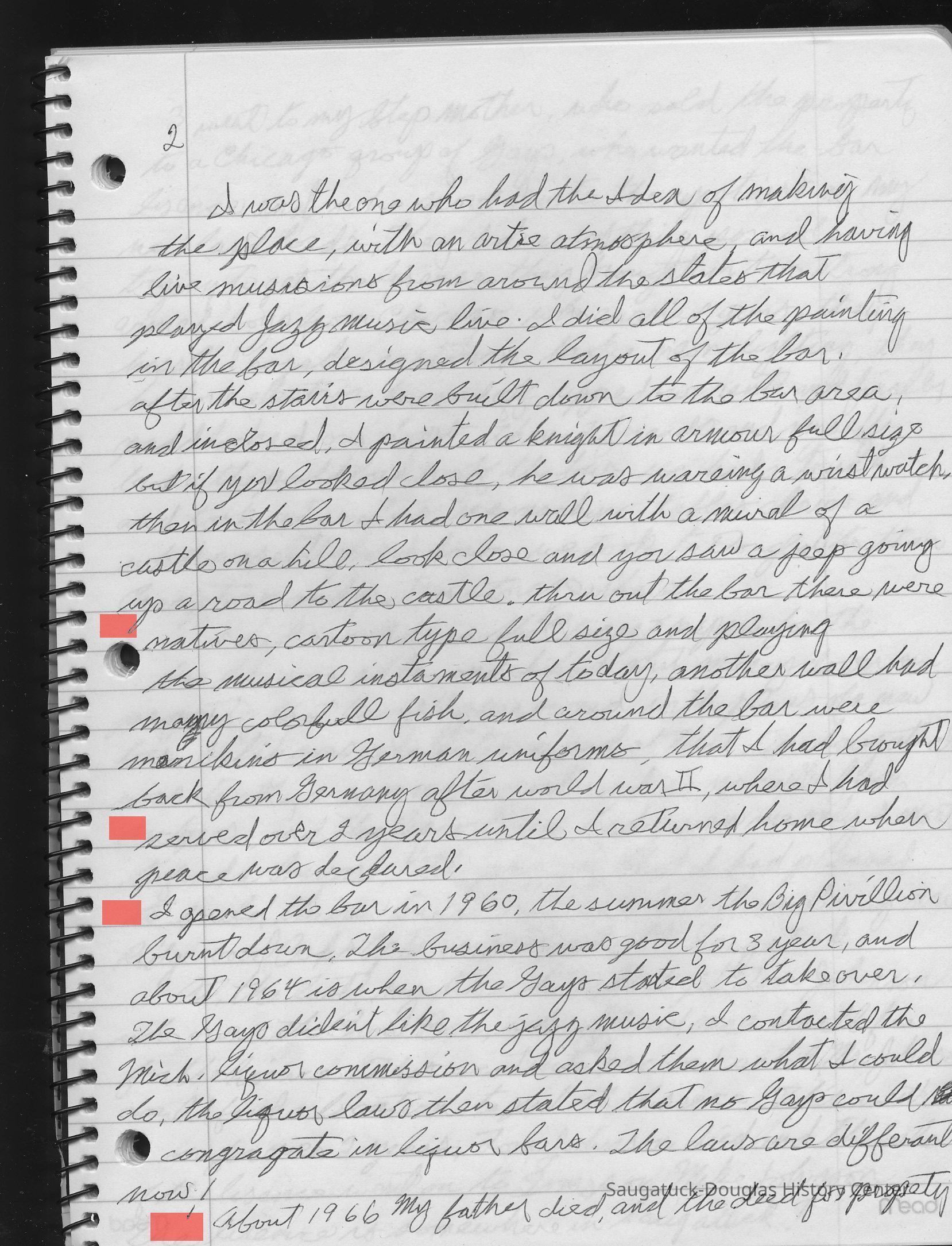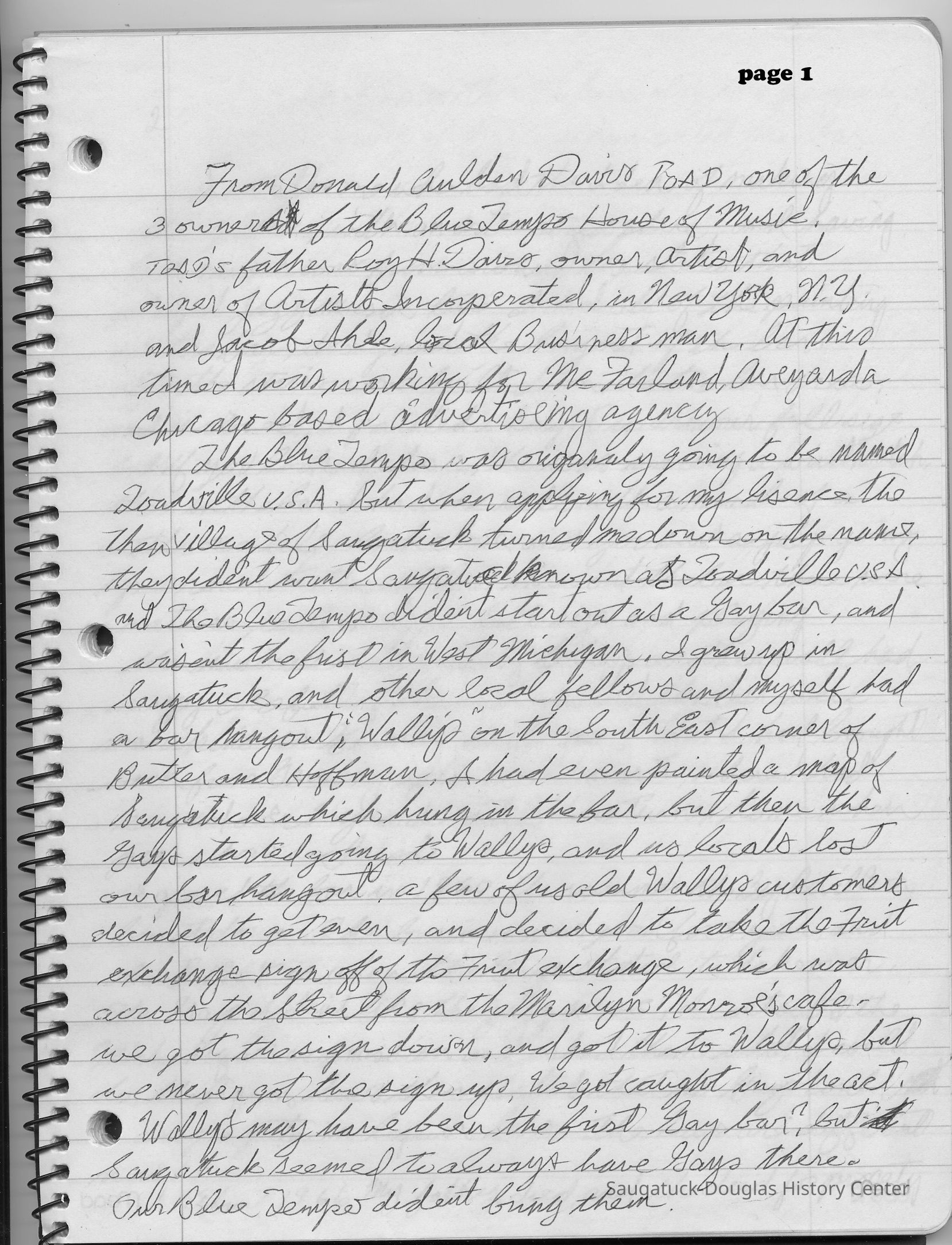 Content of Mr. Davis' handwritten notes, typed out by John Kerr in 2020 From Donald Auldan (?) Davis TOAD, one of the 3 owners of the Blue Tempo House of Music. TOAD’s father Roy H. Davis, owner, artist, and owner of Artists Incorporated, in New York, N.Y. and Jacob Ahde, local businessman. At this time I was working for McFarland, Aveyarda Chicago based advertising agency. The Blue Tempo was originally going to be named Toadville U.S.A. but when applying for my license the then village of Saugatuck turned me down on the name, they didn’t want Saugatuck known as Toadville U.S.A. and The Blue Tempo didn’t start out as a Gar bar, and wasn’t the first in West Michigan. I grew up in Saugatuck and other local fellows and myself had a bar hangout, “Wally’s” on the South East corner of Butler and Hoffman, I had even painted a map of Saugatuck which hung in the bar, but then the Gays started going to Wally’s and we locals lost our bar hangout. A few of us old Wally’s customers decided to get even, and decided to take the Fruit exchange sign off of the Fruit exchange, which was across the Street from the Marilyn Monroe’s café. We got the sign down, and got it to Wally’s, but we never got the sign up. We got caught in the act. Wally’s may have been the first Gay bar? But Saugatuck seemed to always have Gays there. Our Blue Tempo didn’t bring them. I was the one who had the Idea of making the place, with an artie atmosphere and having live musicians from around the states that played Jazz music live. I did all of the painting in the bar, designed the layout of the bar, after the stairs were built down to the bar area, and enclosed. I painted a knight in armor full size but if you looked close, he was wearing a wristwatch. Then in the bar I had one wall with a mural of a castle on a hill. Look close and you saw a jeep going up a road to the castle. Thru out the bar there were natives, cartoon type full size and playing the musical instruments of today. Another wall had many colorful fish and around the bar were mannequins in German uniforms that I had brought back from Germany after World War II, where I had served over 2 years until I returned home when peace was declared. I opened the bar in 1960, the summer the Big Pavilion burnt down. The business was good for 3 years, and about 1964 is when the Gays started to take over. The Gays didn’t like the jazz music, I contacted the Michigan Liquor Commission and asked them what I could do. The liquor laws then stated that no Gays could congregate in liquor bars. The laws are different now! About 1966 my father died and the deed for the property went to my step-mother who sold the property to a Chicago group of Gays who wanted the bar license and who moved into the upstairs as my new landlords. They did everything possible trying to get the license. They brought in two strong armed boys from Chicago who carried guns. They hassled regular customers, broke neon lighting, then had our electric turned off, upped our rent, and finally padlocked our doors. Then 2 friends and myself broke the padlocks off the bar. We had a truck and took out coolers, ice machine, tables, chairs and what wasn’t glued down. We took to Douglas to then Crampton’s and put in storage there. I had run ads in the Chicago papers for the bar license sale and I had put money down on property that Henry Hopper owned, with plans of a new bar. But it was winter time and at that time Saugatuck was strictly a summer resort and so no calls from backers and the liquor commission had given me only 2 months to find a buyer. The property that I had planned to build the new bar on is now where I am living now, Ridgewood Oaks Apts, 1037 Maple St. Saugatuck. At the last my time to sell I got Tom Johnson who owns the Crow Bar who offered me a small fee for the license. This went into escrow until Mr. Johnson could find a location to put the license. This went on for over 2 years. Tom Johnson died and the sale of the license went on to Tom’s son Mike Johnson. My lawyer, Mr. Coup, took his fee, had told me when the sales agreement went thru he would try and get the IRS to step down. Hah – that’s a good one, the IRS got the bulk of the sales money but I did get $2000 that I gave to my girls. I had a nice mortgaged home in Allegan that my wife got for her and the children which she finally sold. I went back after the sale of the license driving semi’s, didn’t do very good. The truck blew a motor and I ended up running the old Snug Harbor gas station which was the old Bus station, kiddy corner from the Village Hall downtown. Well I was the last one to run the Snug Harbor station downtown Saugatuck. Yes! The Blue Tempo was an ice house years ago. Back in the days when a team of horses went down on the ice by the Butler and cut up ice in chunks, handed it to Barflies then, and stored it in the basement and in the summer the iceman would sell it to people who had ice boxes. But then along came refrigerators and goodbye ice boxes and lake ice. Also our winters aren’t as cold now and lake doesn’t freeze quite so thick. We had bought the property and building from Edward Marie Demeter who had gotten the place from Burrlie’s. There were 8 motel units, 7 hotel rooms and the bar which was 2 rooms on the Street level. I had a restaurant upstairs, then a bookstore and a slot car race track. And that’s it. Years ago when Snug Harbor was a thriving bus stop, Allie Daggett was the then taxi driver. Allie started with horse and buggy the taxi and then 2 cabs and that was one of my first jobs in Saugatuck, driving for Allie Daggett. Then later Arlene Hodley and Clair Slater started competition against Daggett and I then switched and drove for C&S cab company. Lots of cab business back then. My first Saugatuck job, when my family moved here from Chicago, was the Duck Pin bowling alley (I set pins). Erv Grubbs manager was across the St. on Butler St. kitty corner from Villag