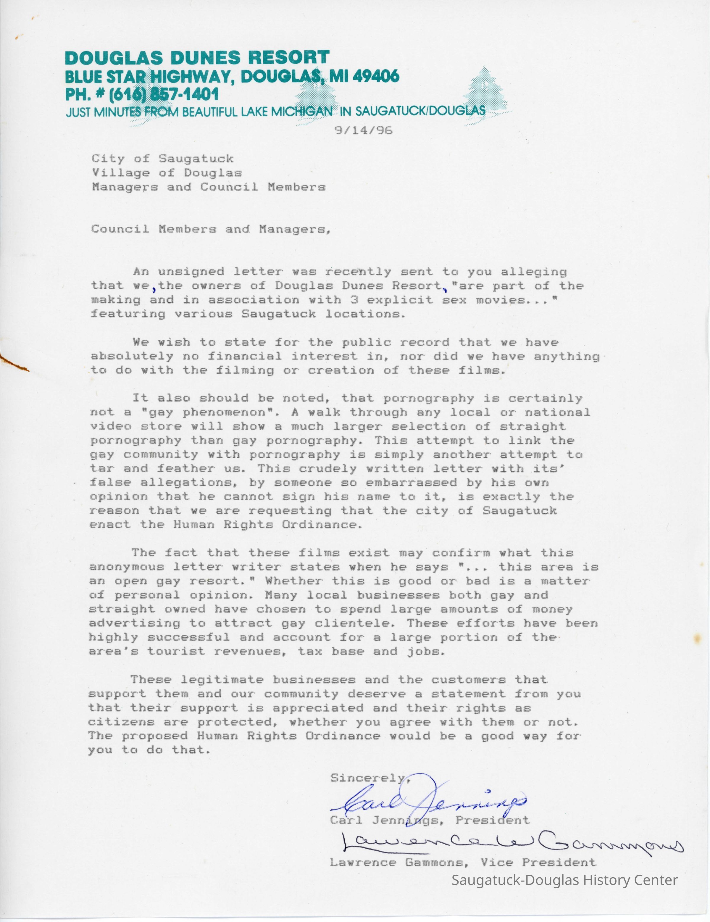 A letter to the city council members and managers of the City of Saugatuck from Carl Jennings and Lawrence Gammons of the Douglas Dunes Resort attesting they had no financial interest nor part in the production of the alleged gay porn films.