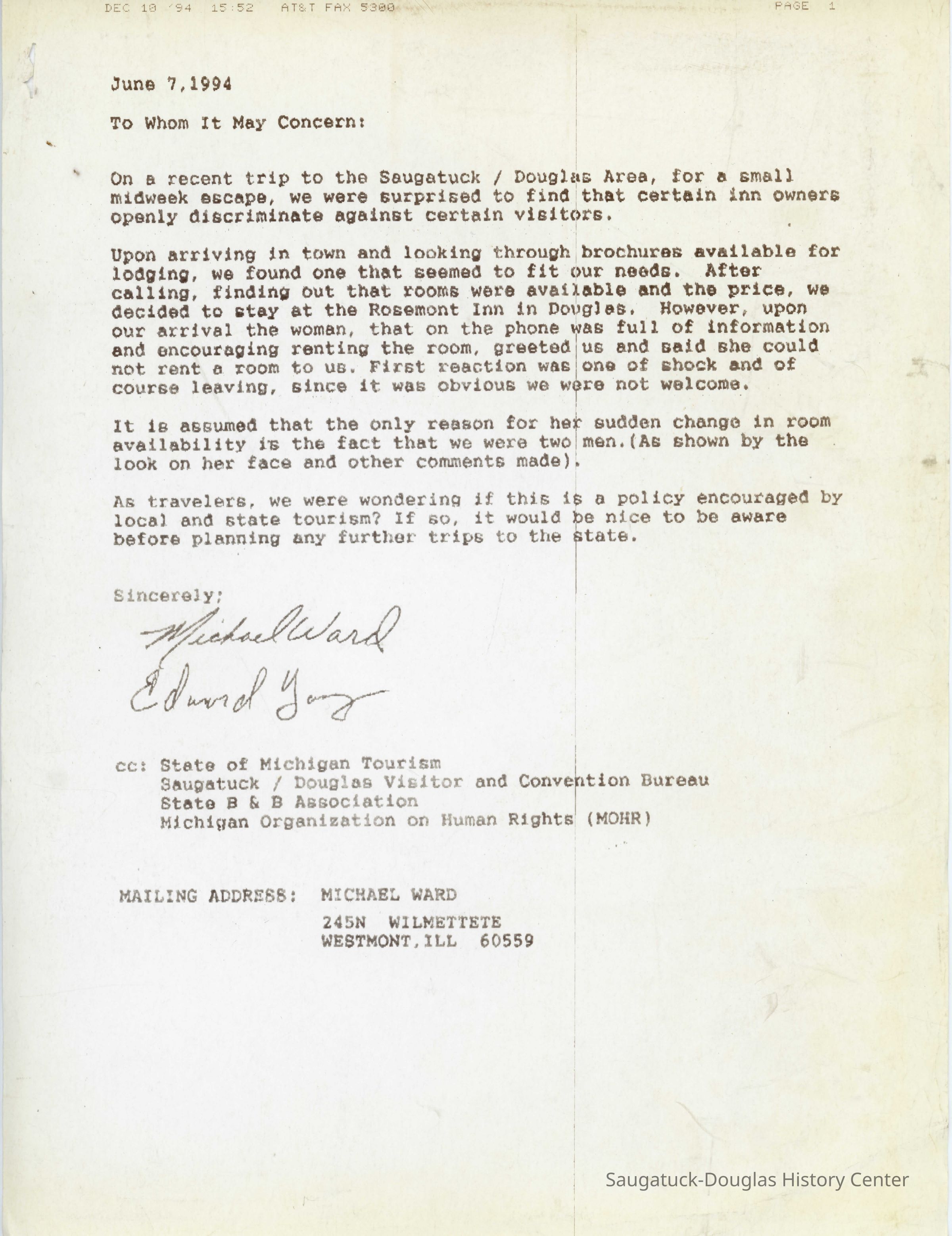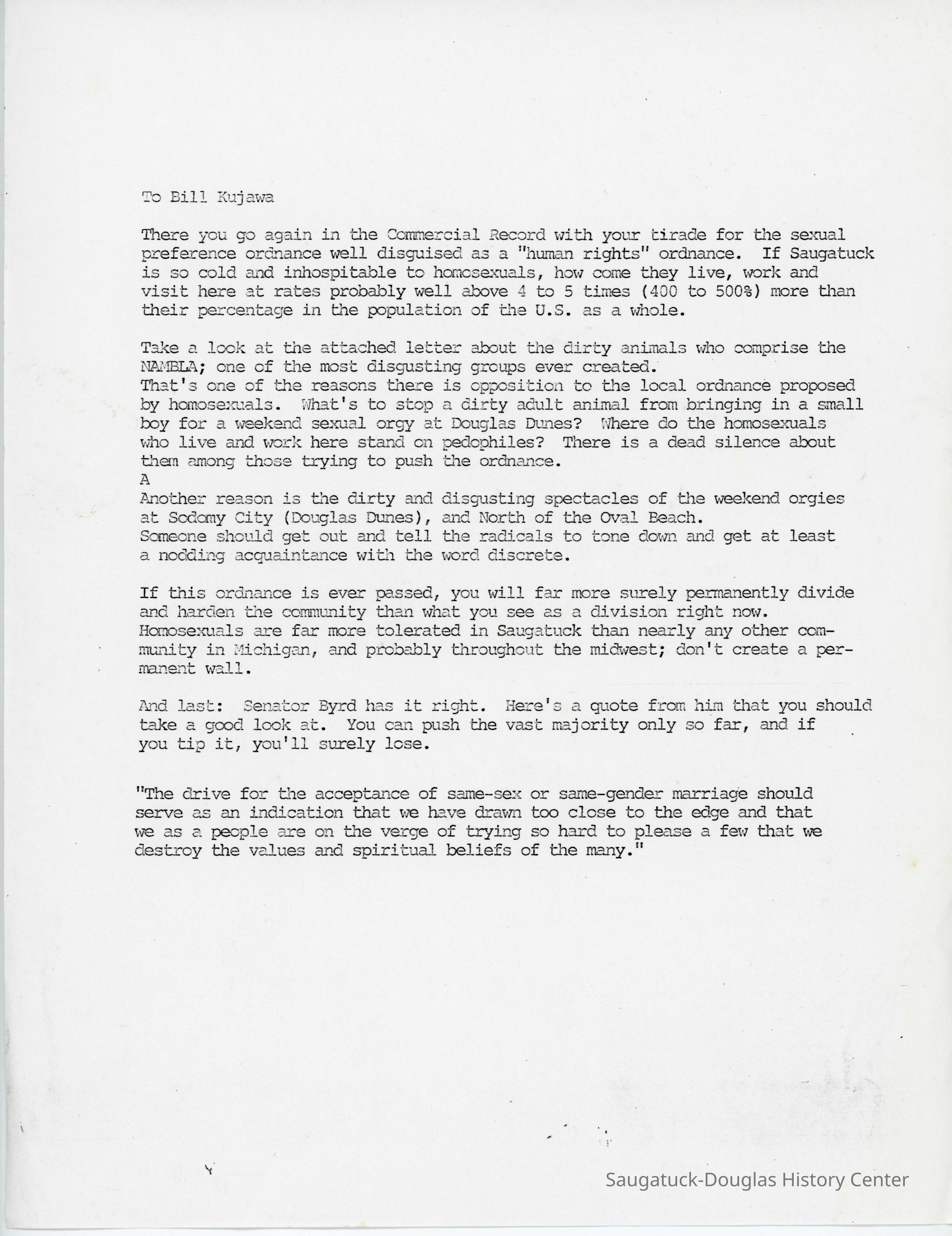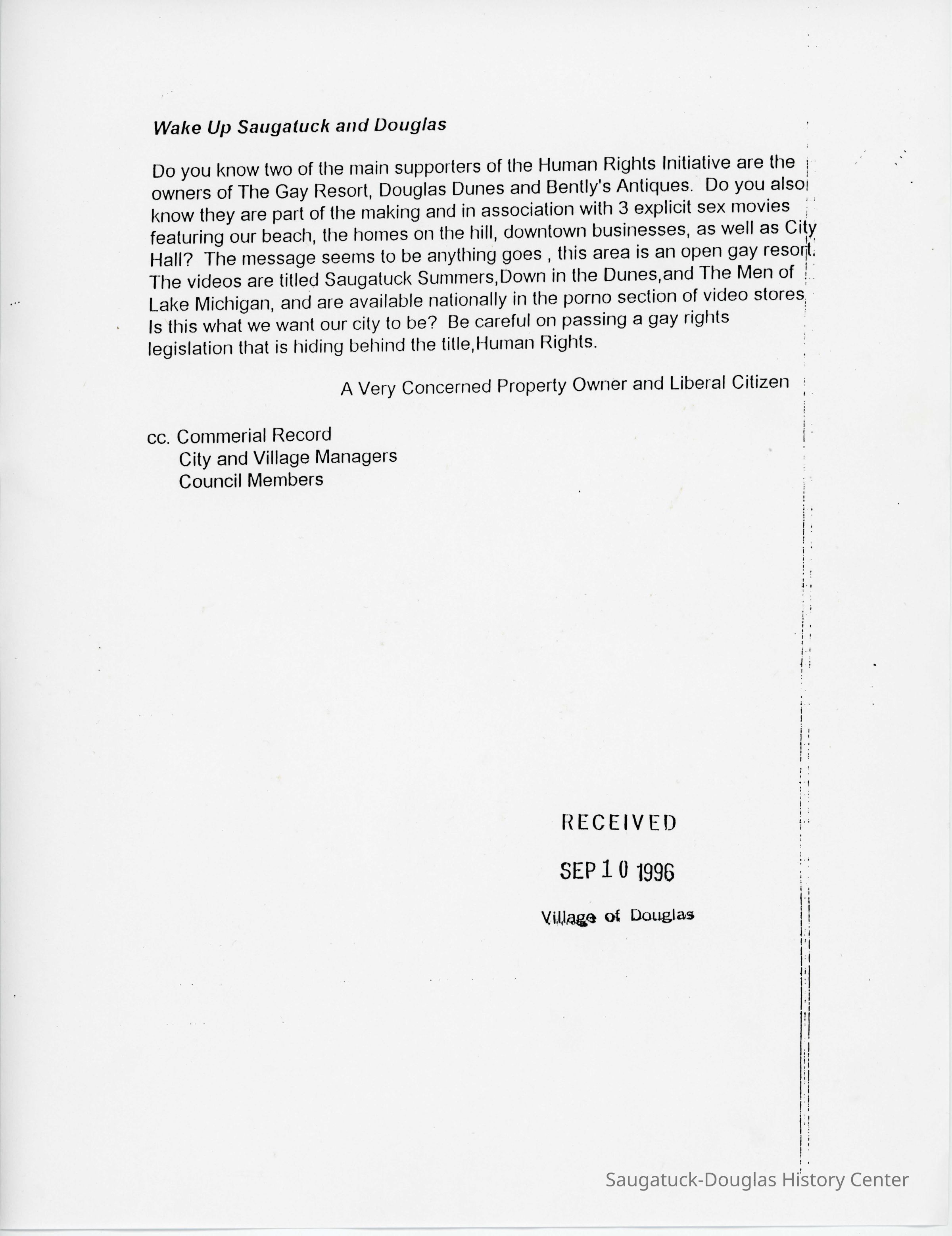 In 1994, the City of Saugatuck considered passing a Human Rights Ordinance. The proposal stirred up anti-LGBT sentiments in the community with many letters to the city council and local newspapers.