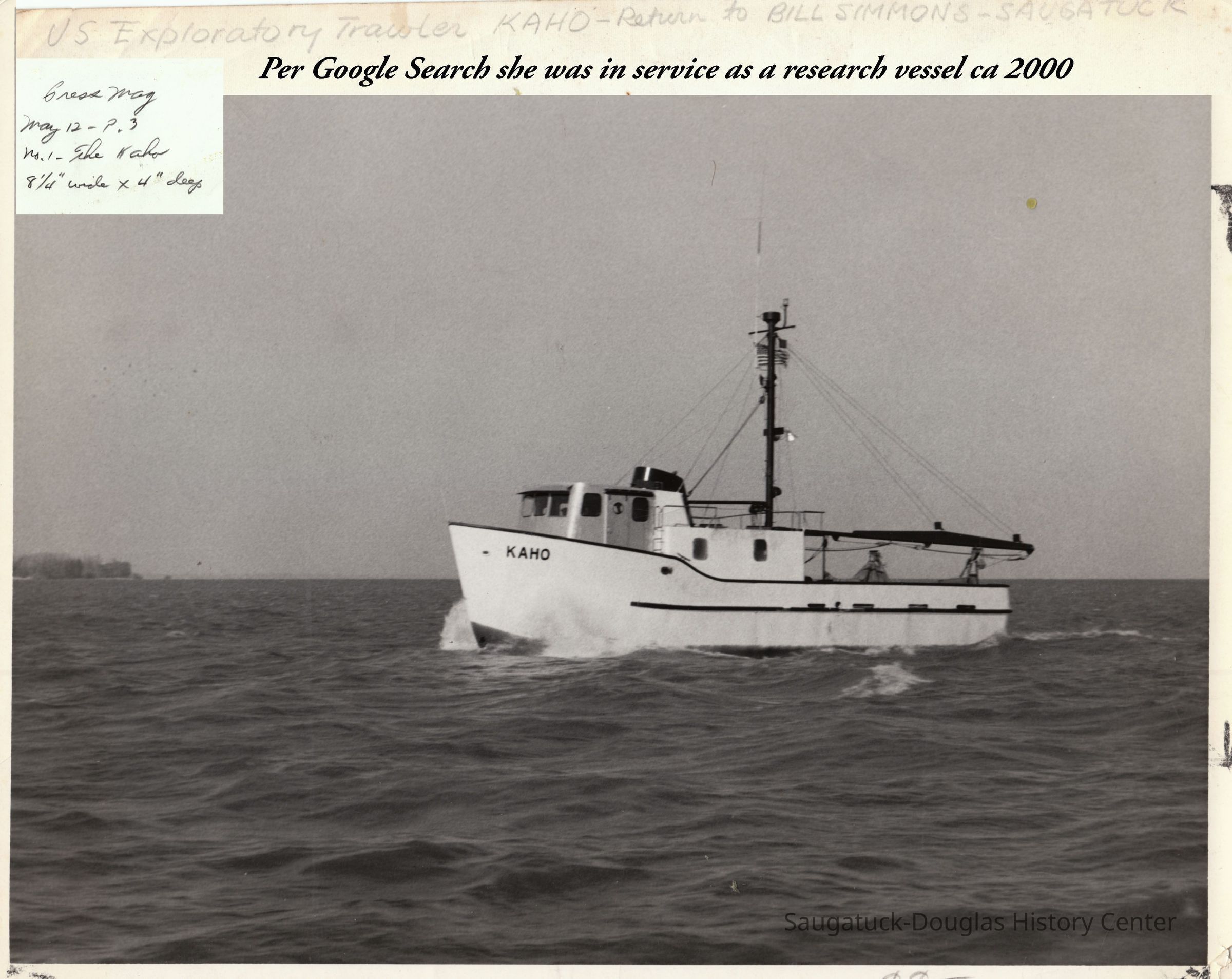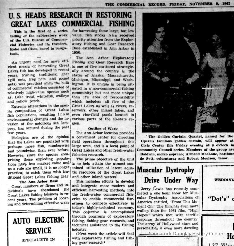 OCR scan of attached article about the Kaho from THE COMMERCIAL RECORD, FRIDAY, NOVEMBER 9, 1962 U. S. HEADS RESEARCH IN RESTORING GREAT LAKES COMMERCIAL FISHING This is the first of a series telling of the exploratory work of the U.S. Bureau of Commercial Fisheries and its trawlers, Kaho and Cisco, based in Saugatuck. An urgent need for more efficient means of harvesting Great Lakes fish has developed in recent years. Fishing traditional gear (gill nets, trap nets, and pound nets) was practical when the bulk of commercial catches consisted of relatively high-value species such as: Lake trout, whitefish, walleye and yellow perch. Extreme alterations in the species composition of Great Lakes fish populations, resulting from environmental changes and the invasion of the notorious sea lamprey, has occurred during the past few years. Biologists are of the opinion that the Lakes are populated with perhaps more fish, numberwise and poundwise, than ever before. However, since the species comprising these exploding populations have less market value and as a rule are small, it is no longer practical to catch them with traditional Great Lakes fishing gear. The Ann Arbor Base Great numbers of firms and individuals have abandoned the Great Lakes fishing business in recent years. The problem of locating and determining effective ways for harvesting these large, but low value, fish stocks has received priority attention from the Exploratory Fishing and Gear Research Base established in Ann Arbor in 1958. The Ann Arbor Exploratory Fishing and Gear Research Base is one of five scattered strategically around the country in the states of Alaska, Massachusetts, Michigan, Mississippi, and Washington. It is unique in being situated in a non-commercial-fishing community; but not more unique than it’s area of responsibility which includes: all five of the Great Lakes as well as rivers, reservoirs, other inland lakes, and even rice-field ponds located in various parts of the 18-state region. Outline of Work The Ann Arbor location provides a convenient center for directing field operations throughout this large area, and is a local point of Great Lakes and other fresh-water fisheries research. The prime objective of the unit is to help attain the utmost sustained utilization of latent aquatic resources of the Great Lakes and other inland waters. This includes efforts to develop and integrate more modern and efficient harvesting methods into the fresh-water commercial fisheries to enable commercial fishermen to compete effectively in today’s highly-technical economy. This objective is accomplished through programs of exploratory fishing, fishing gear research, and technical assistance to the fishing industry. (Next week the article will deal with exploratory fishing and fishing gear research.)