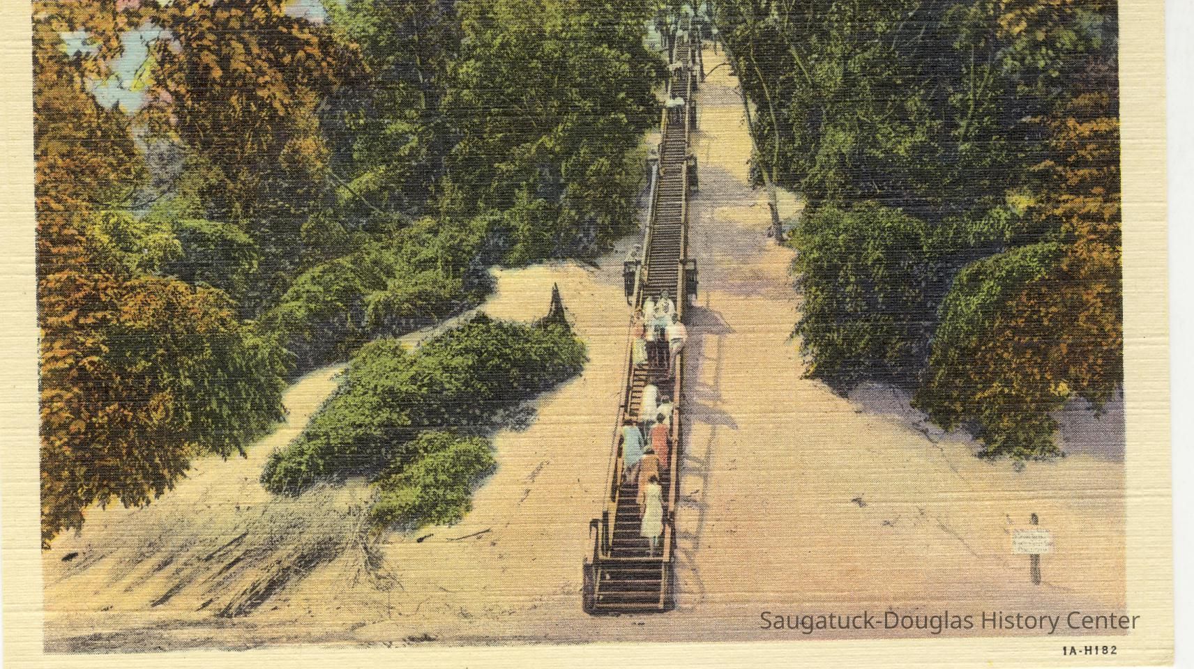 A color postcard showing the stairway up to Mt. Baldhead. Two groups of people head to the top. Sand surrounds the stairs.