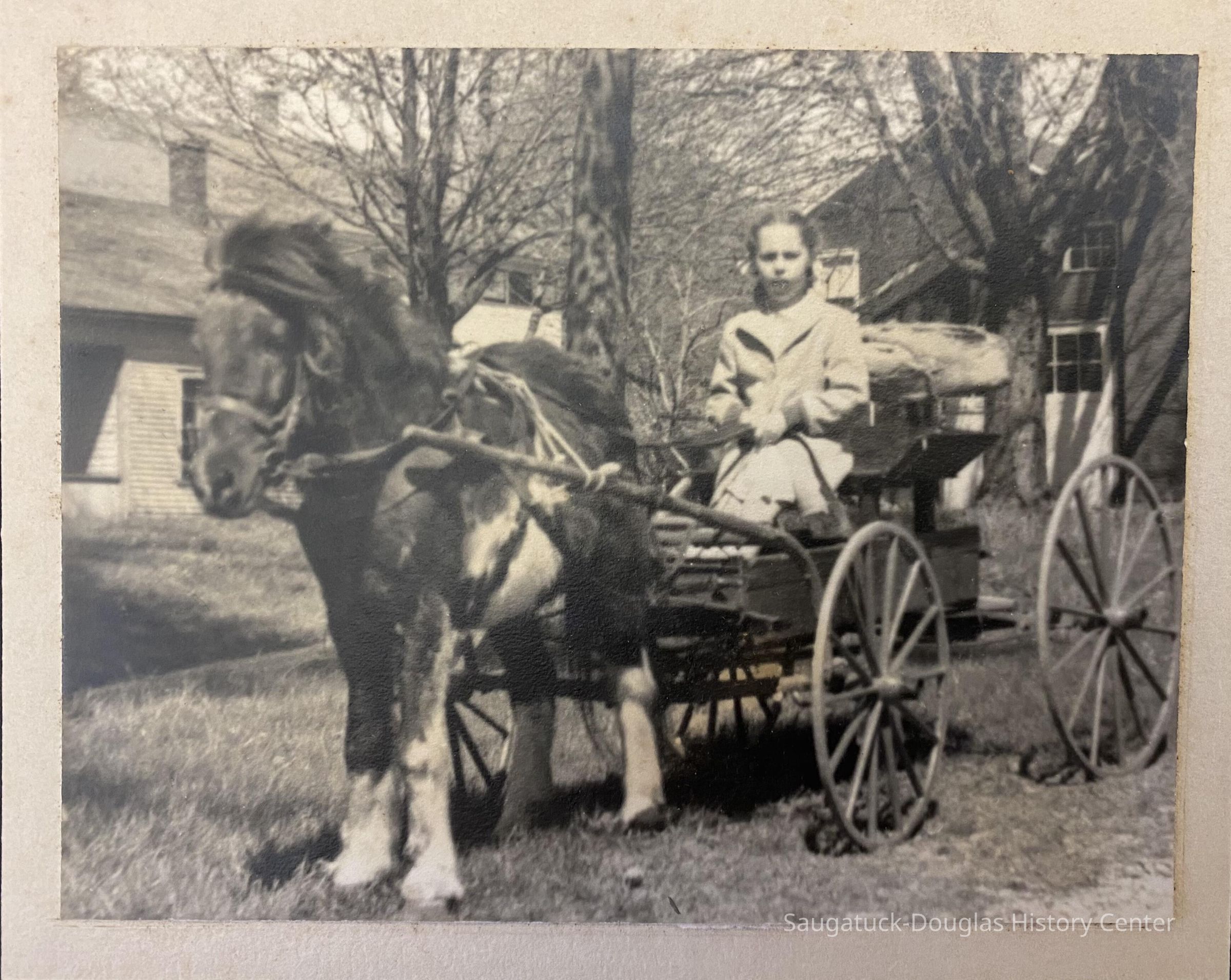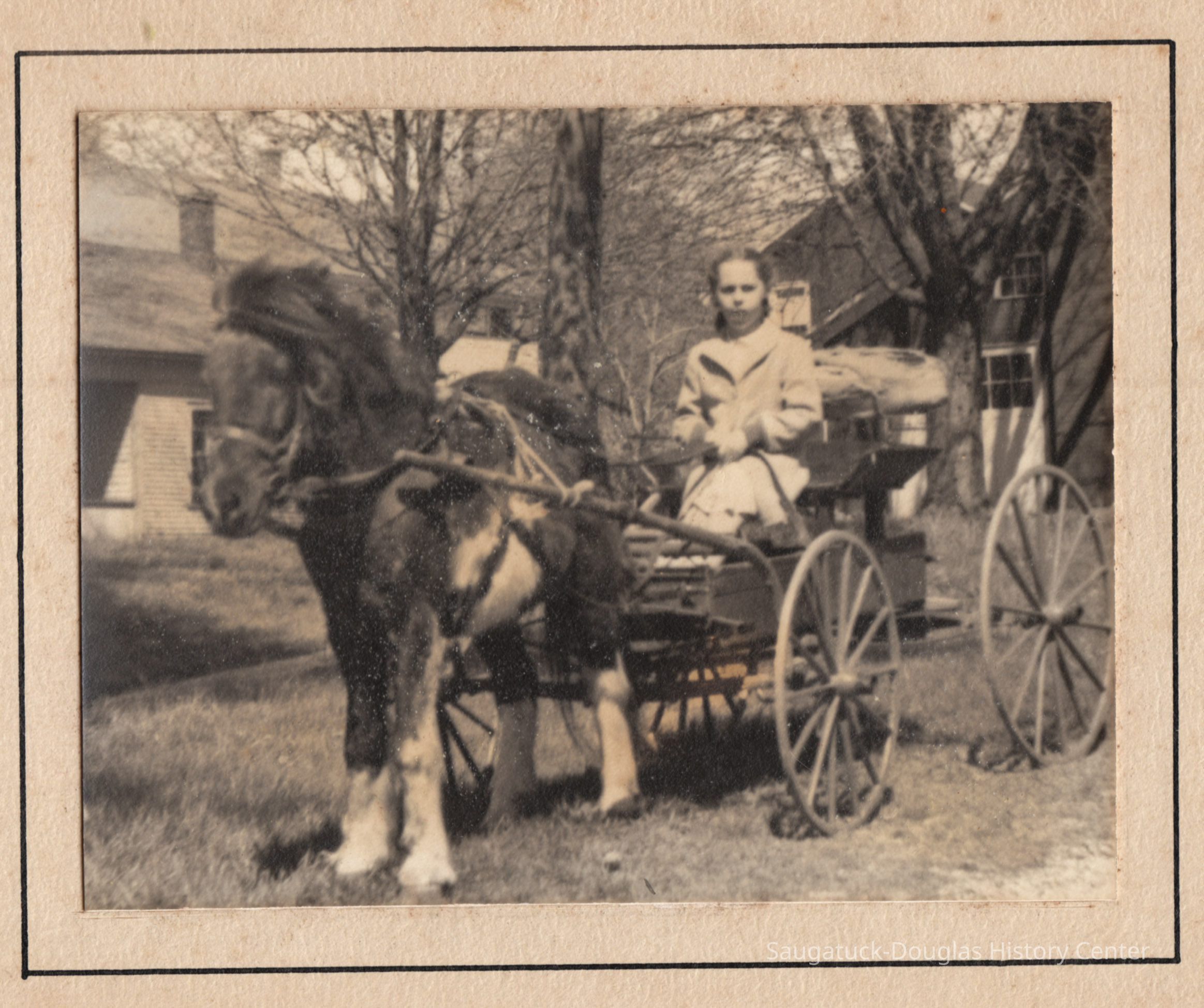 Photo of girl in holding the reins of a pony that is hitched to a cart.
