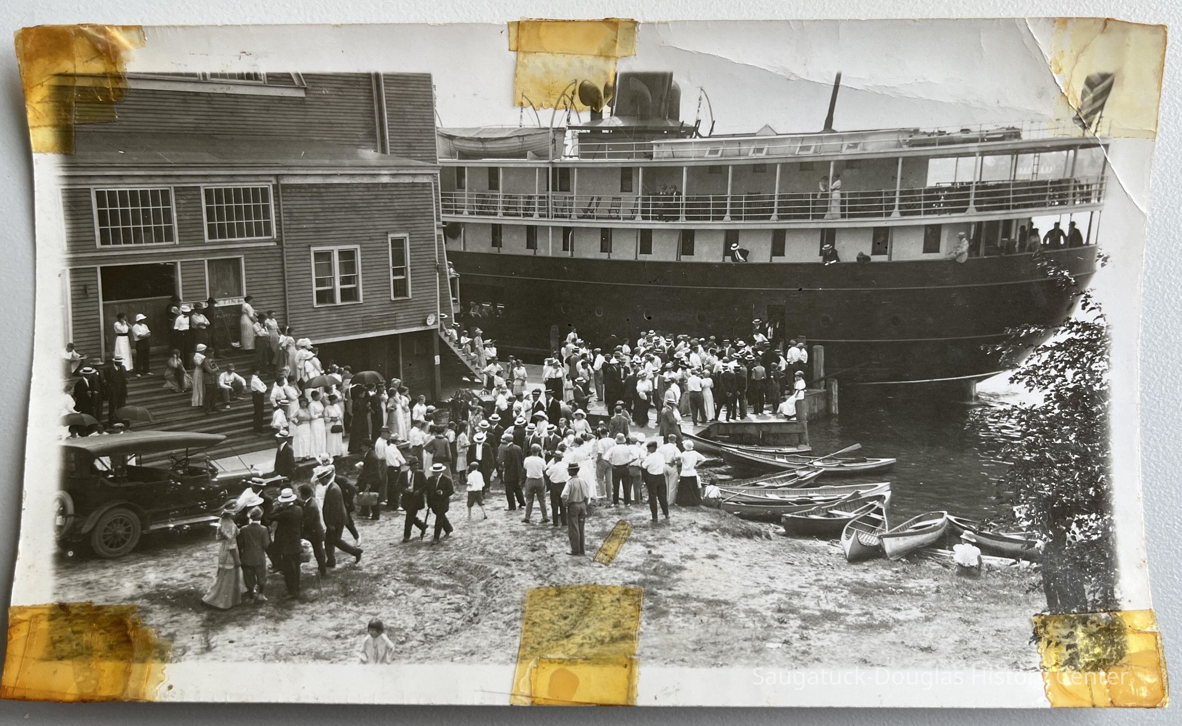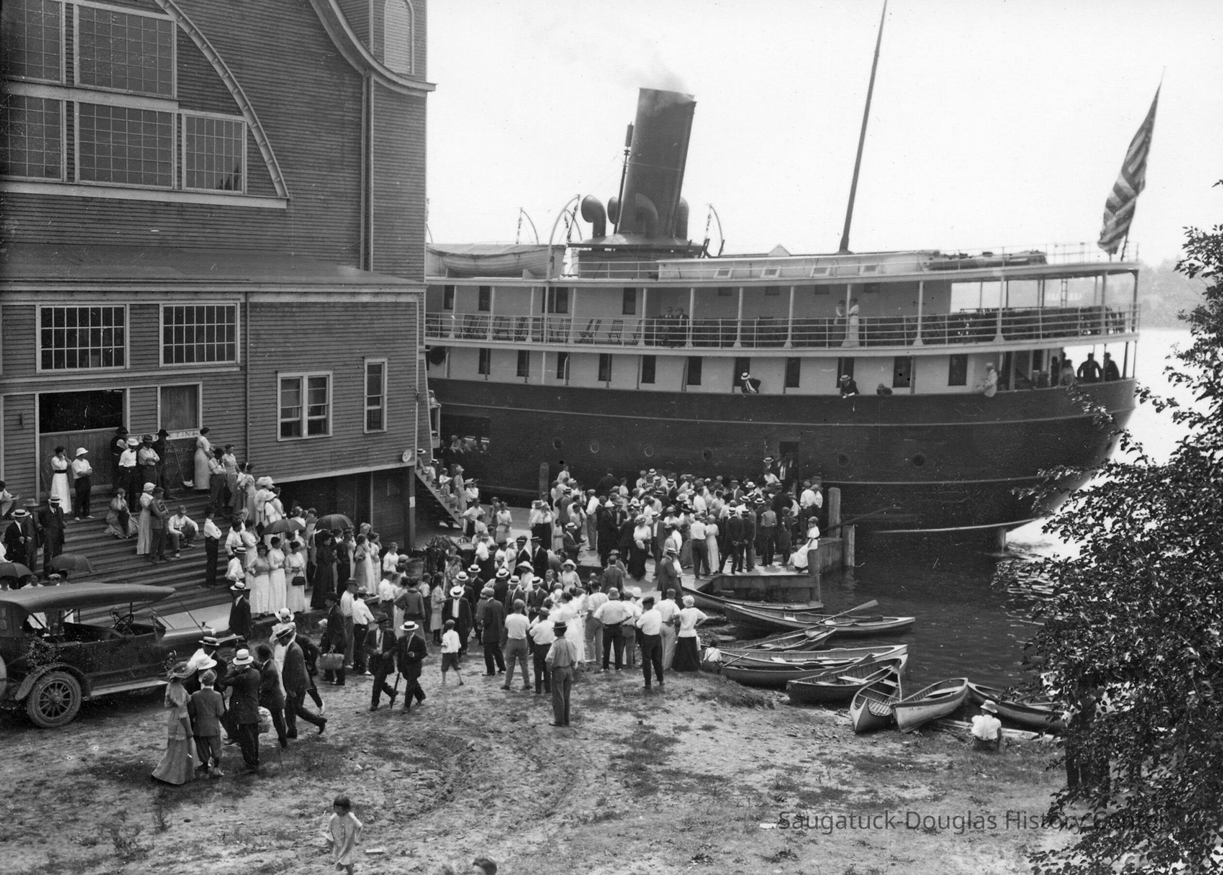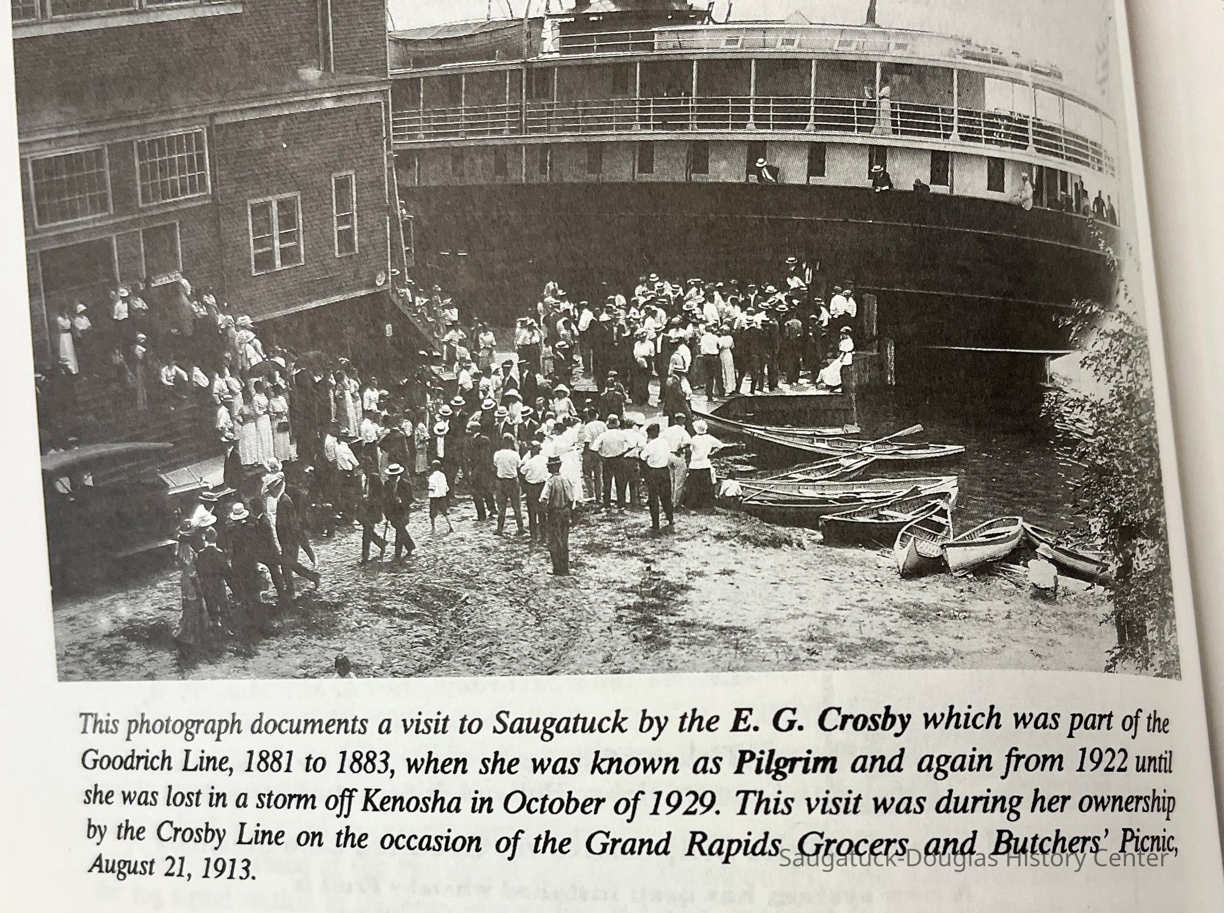 According to Jack Sheridan, the image is the Steamer E.G. Crosby with an excursion group of Grand Rapids grocers arriving, 1913. James T. Fassen thinks the ship may be the Arundell.