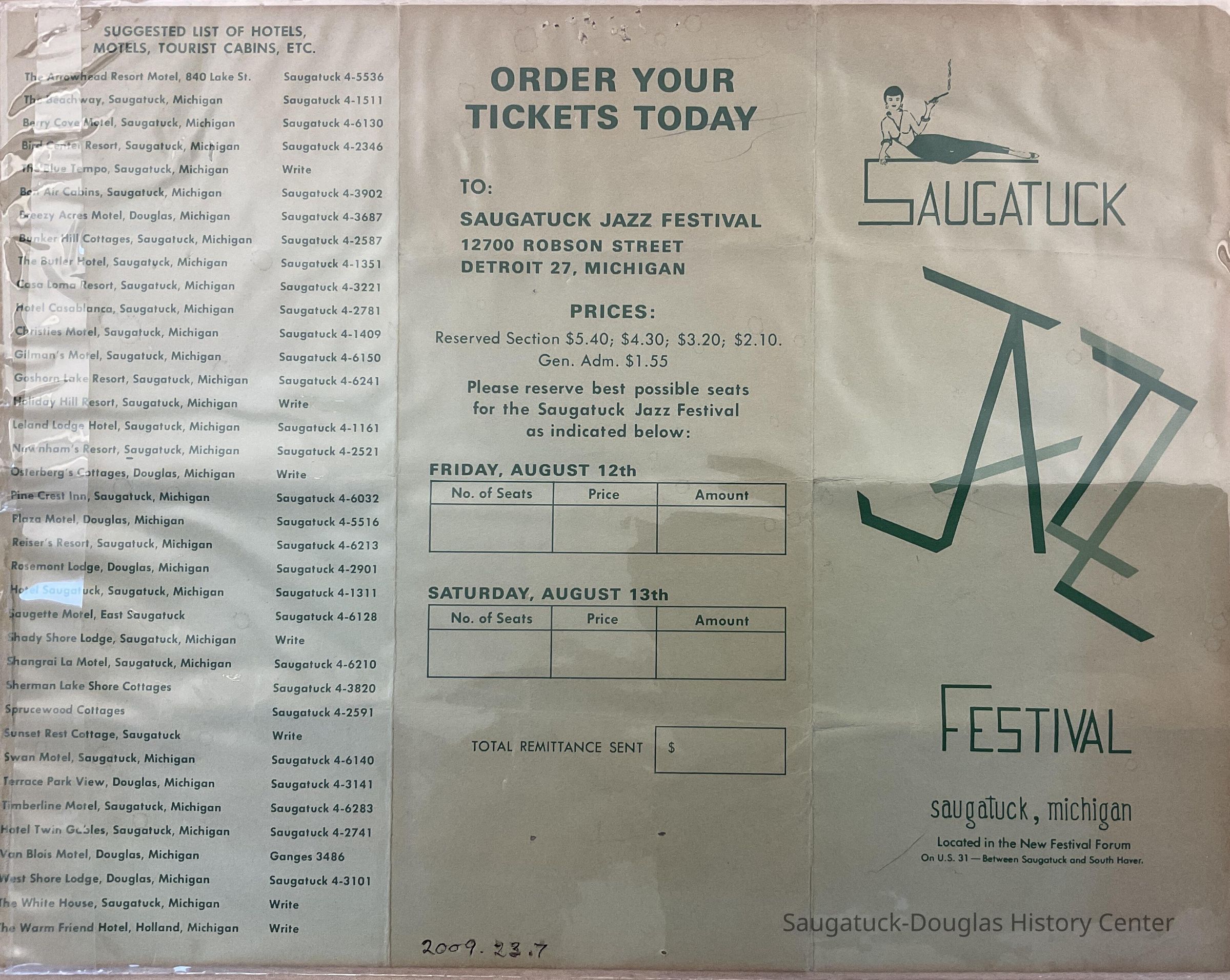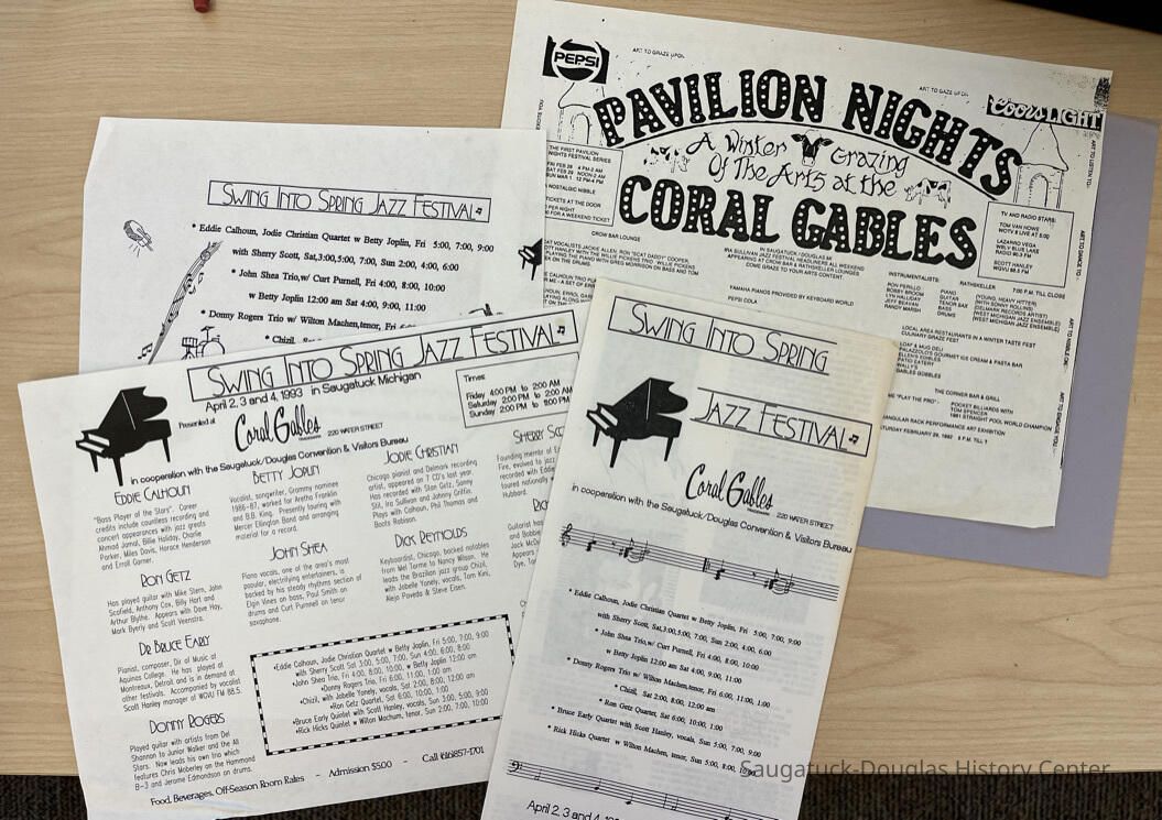Brochure about the 1960 First Annual Jazz Festival [the 1st festival was in 1959 at the Big Pavilion] plus photocopies of the "Swing into Spring Jazz Festival" at Coral Gables in 1993 and the "Pavilion Nights: a Winter Grazing of Arts" at Coral Gables, no date.
