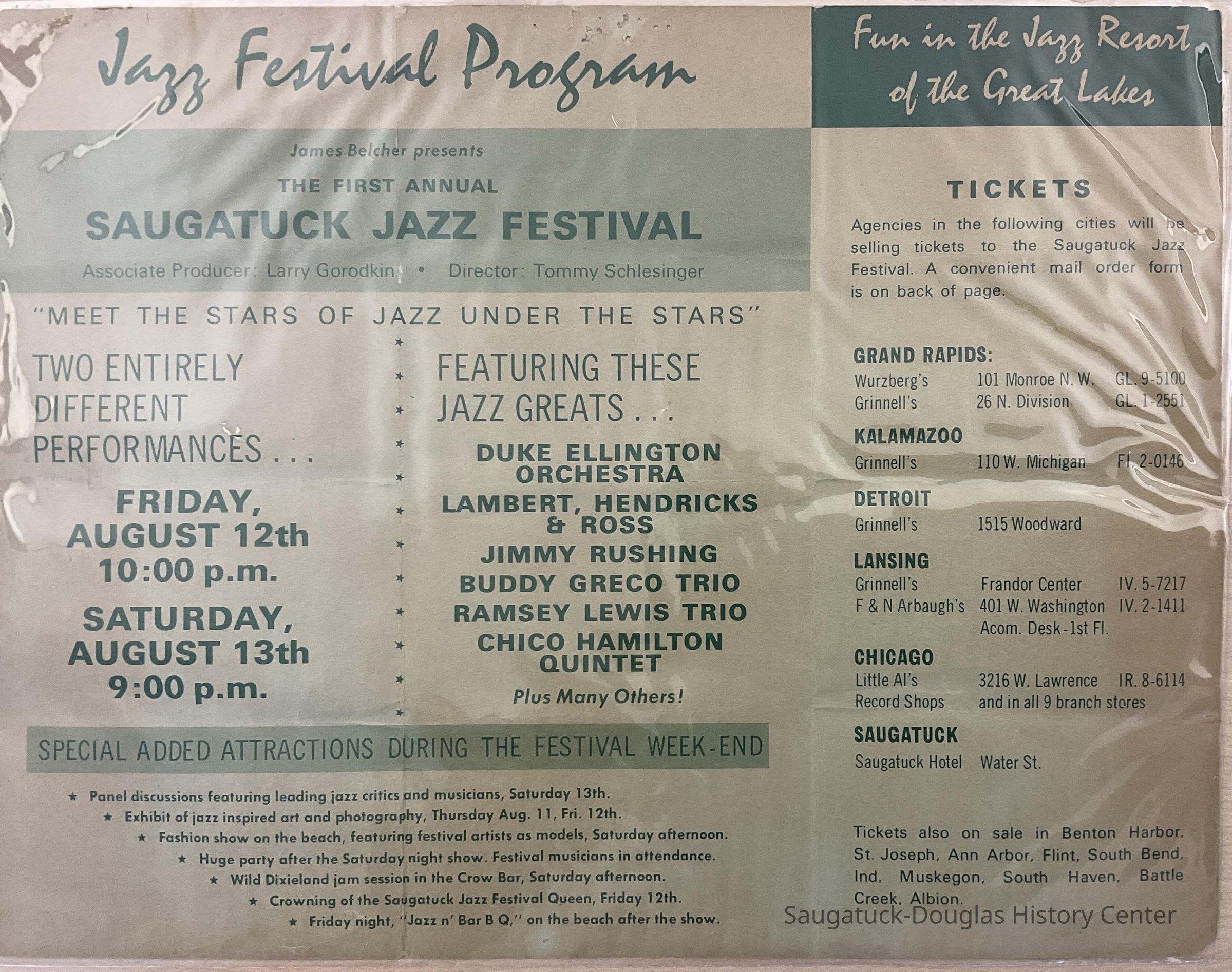Brochure about the 1960 First Annual Jazz Festival [the 1st festival was in 1959 at the Big Pavilion] plus photocopies of the "Swing into Spring Jazz Festival" at Coral Gables in 1993 and the "Pavilion Nights: a Winter Grazing of Arts" at Coral Gables, no date.