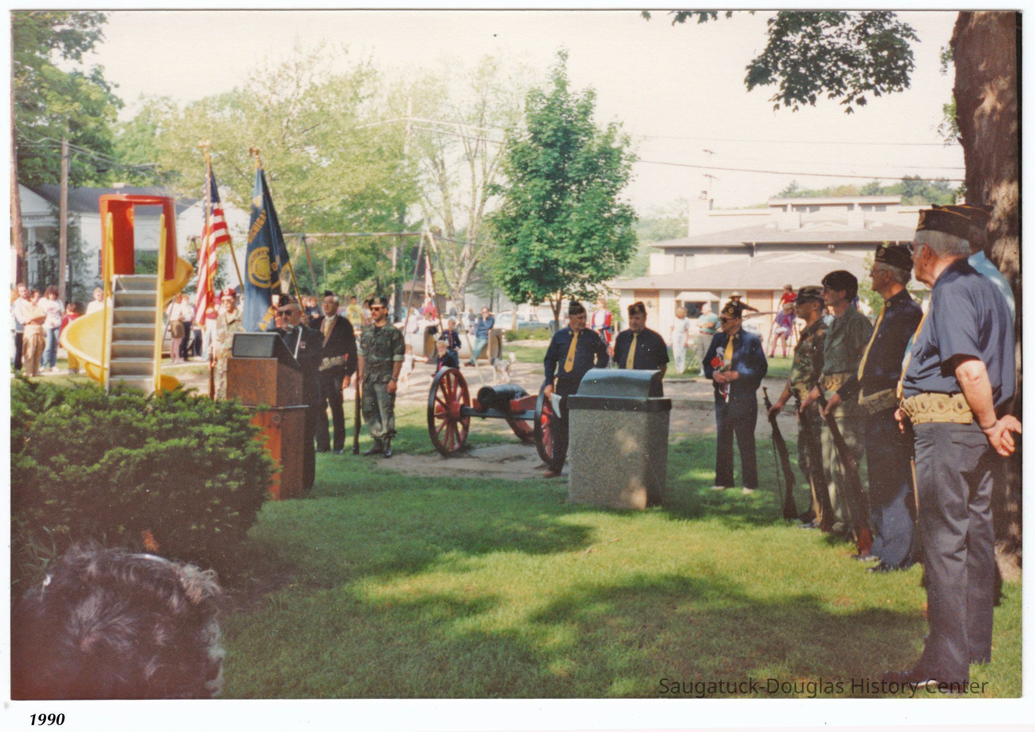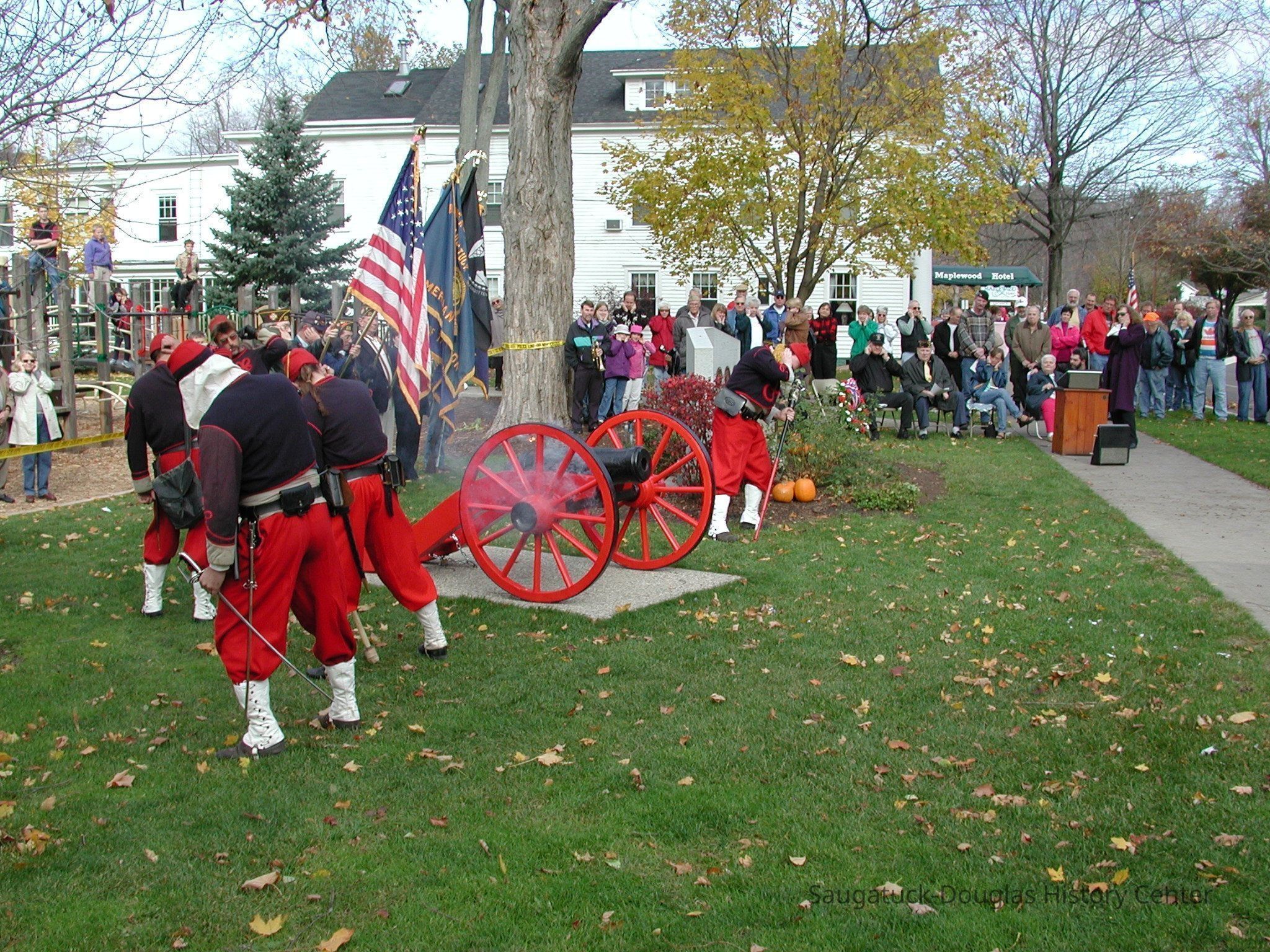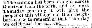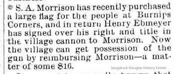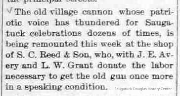 The little black cannon with red wheels was a gift from Stephen Morrison around 1880. During a World War I scrap drive, the cannon was put on the curb for pick up, but the Superintendent of Public Works, Harry Newnham, returned it to the Village Hall.